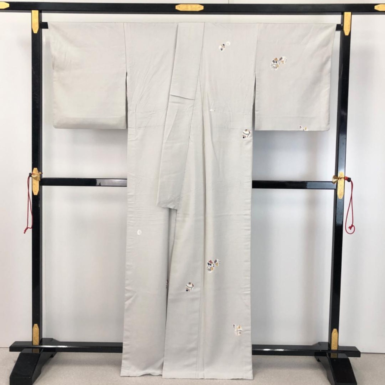 灰色のお色味の紬地に絞りの丸に花模様がデザインされた素敵な柄裄のお品でございます。