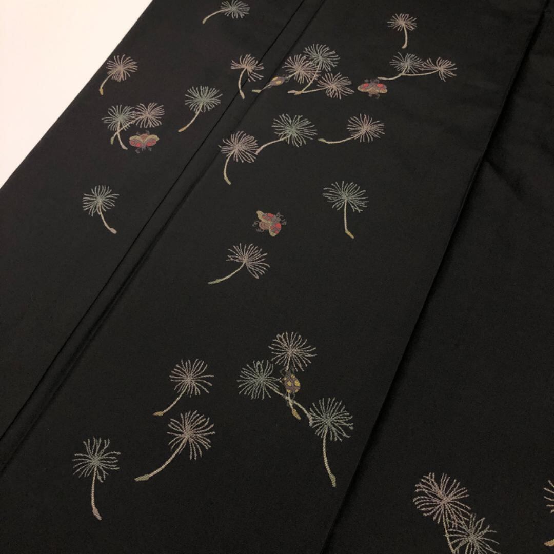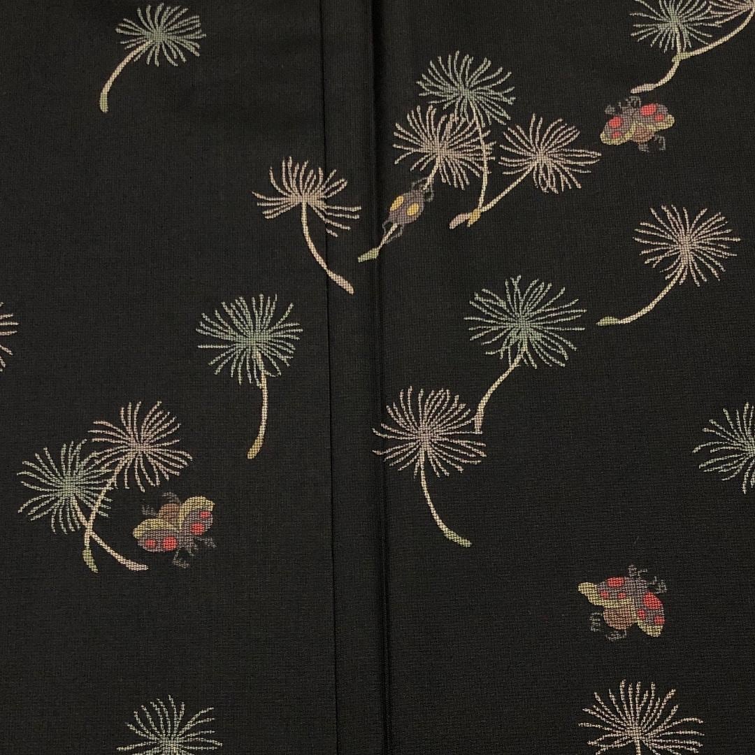 黒色ベースのお色味に可愛らしいてんとう虫にたんぽぽの綿毛の柄裄がデザインされた珍しい素敵なお品でございます。