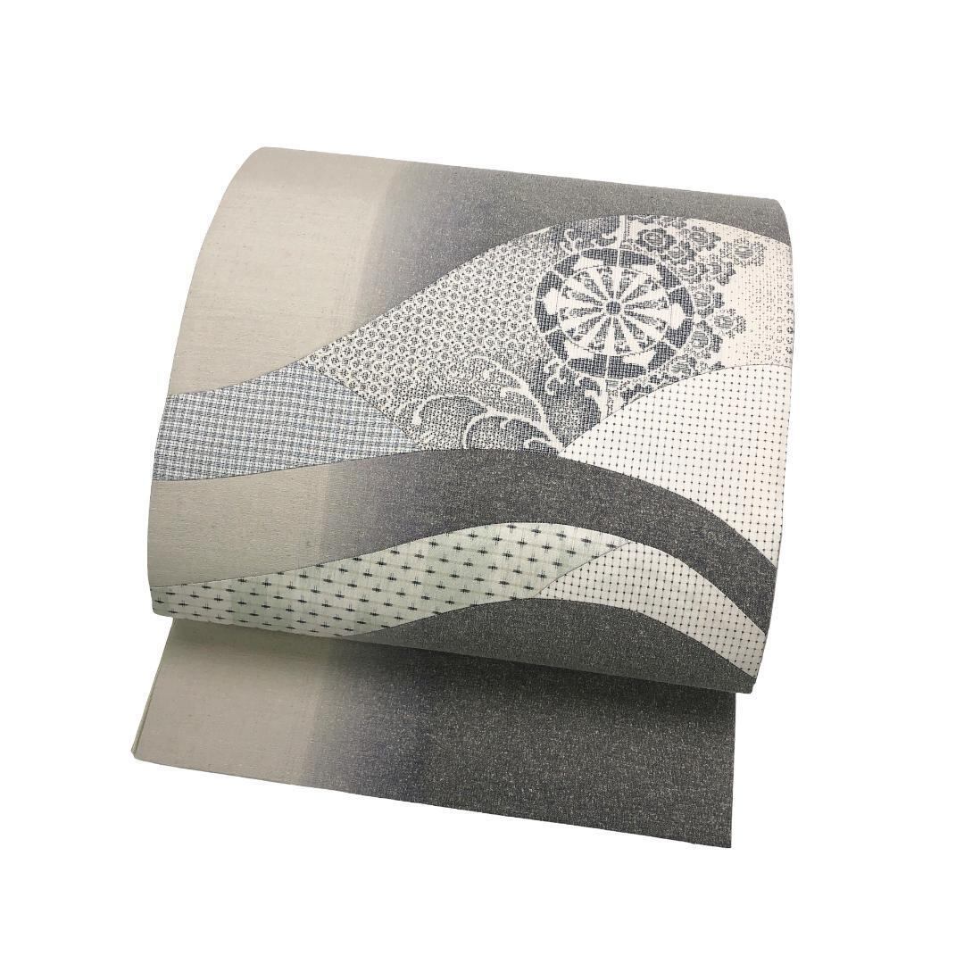 袋帯 紬 切嵌 車輪に花柄 波模様 絹鼠色 O-5041 着物 きもの kimono 和服 和装 中古 リサイクル着物 【送料無料】