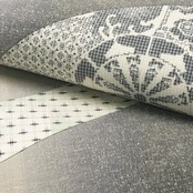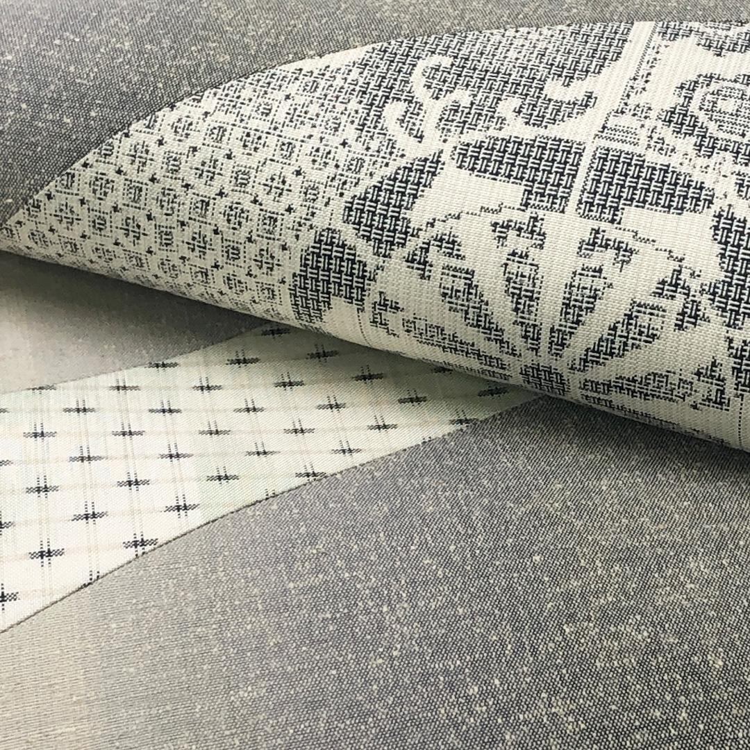 絹鼠色の上品なお色味の紬地に切嵌の車輪に花柄、波模様がデザインされた素敵なお品でございます。
