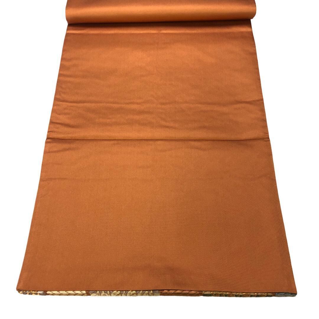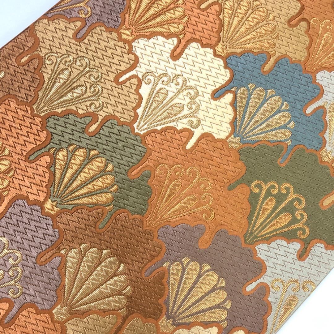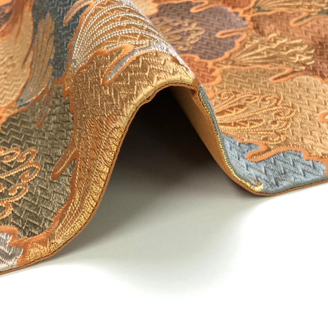 辛螺色ベースの鮮やかな色彩の唐織、車輪青海波の柄行がデザインされた素敵なお品でございます。