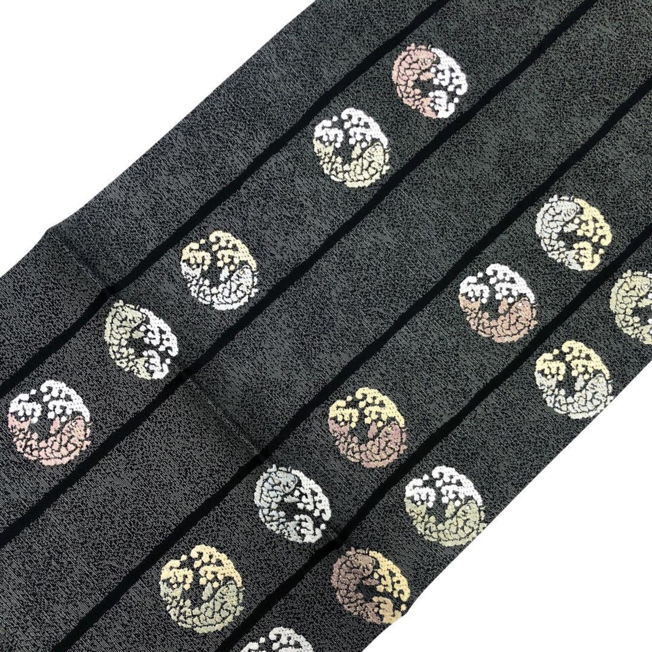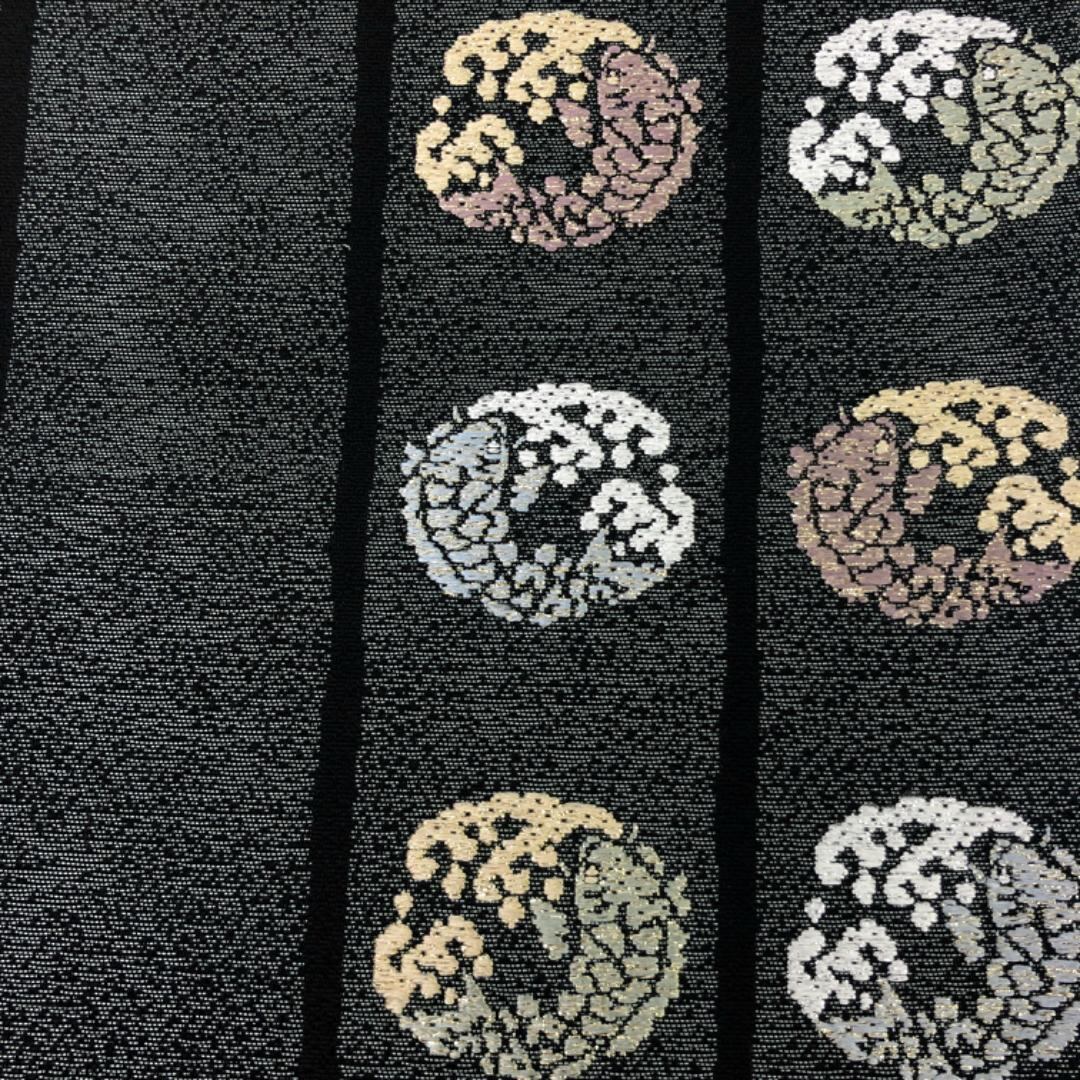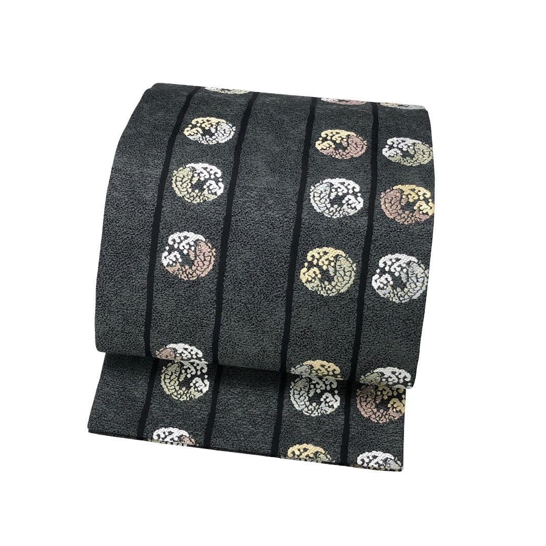 墨色のお色味に縦縞模様、丸に魚と波模様がデザインされた素敵なお品でございます。