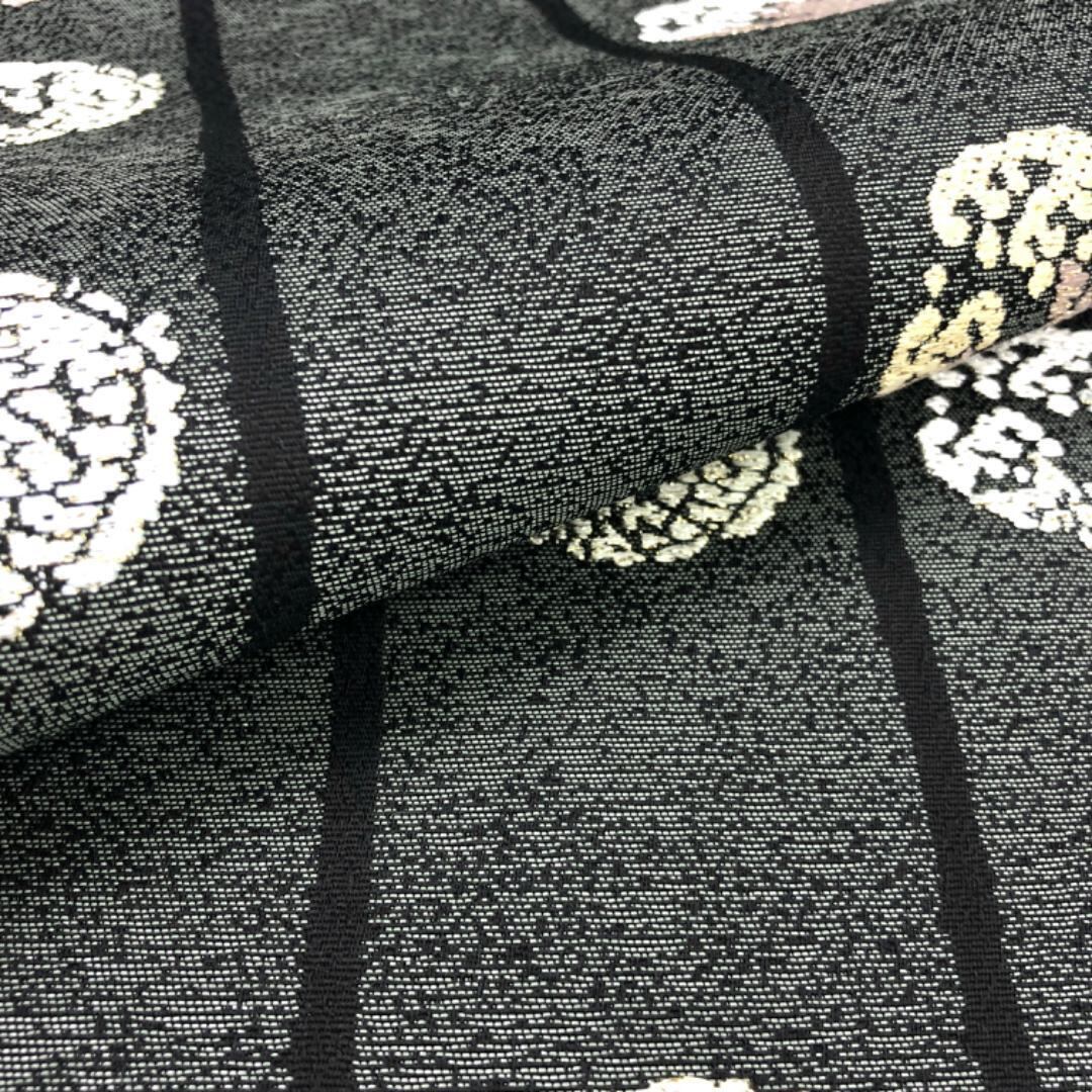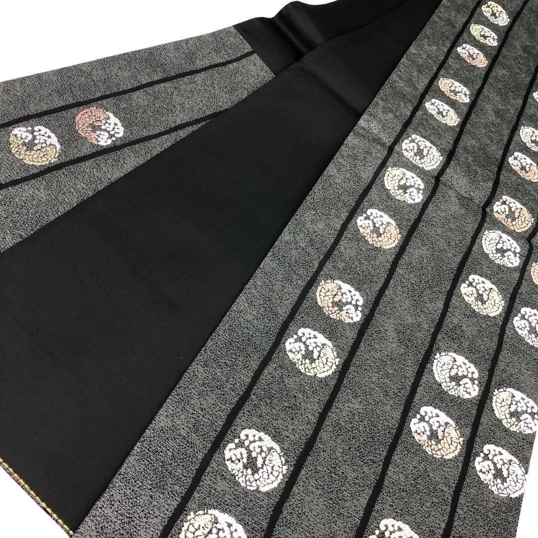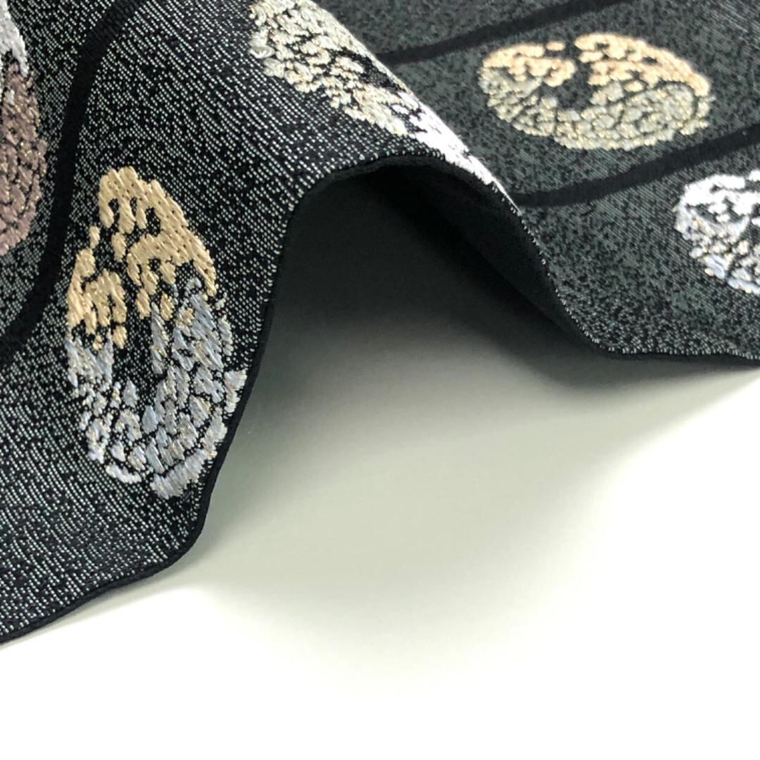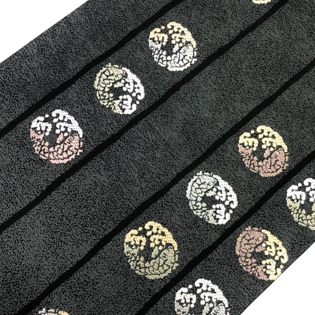 墨色のお色味に縦縞模様、丸に魚と波模様がデザインされた素敵なお品でございます。
