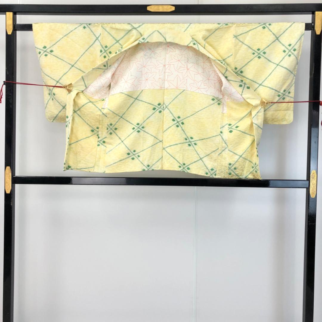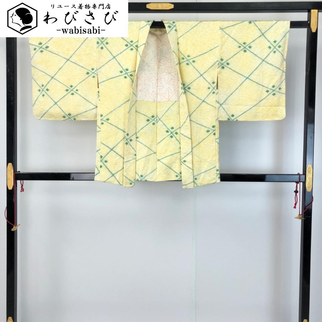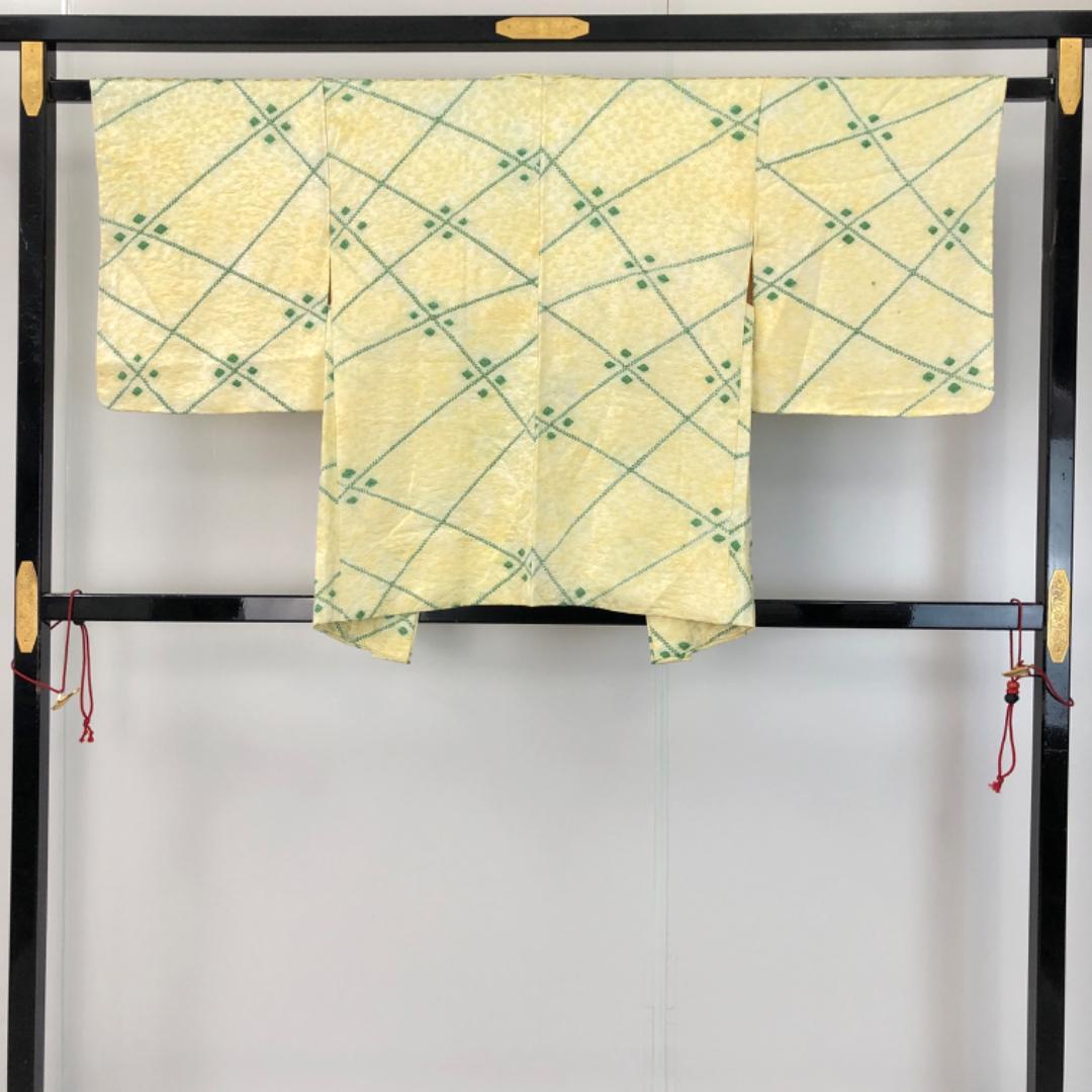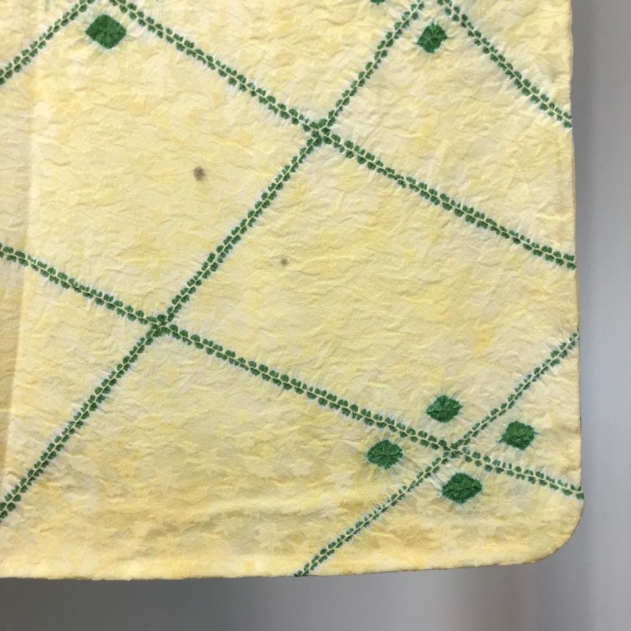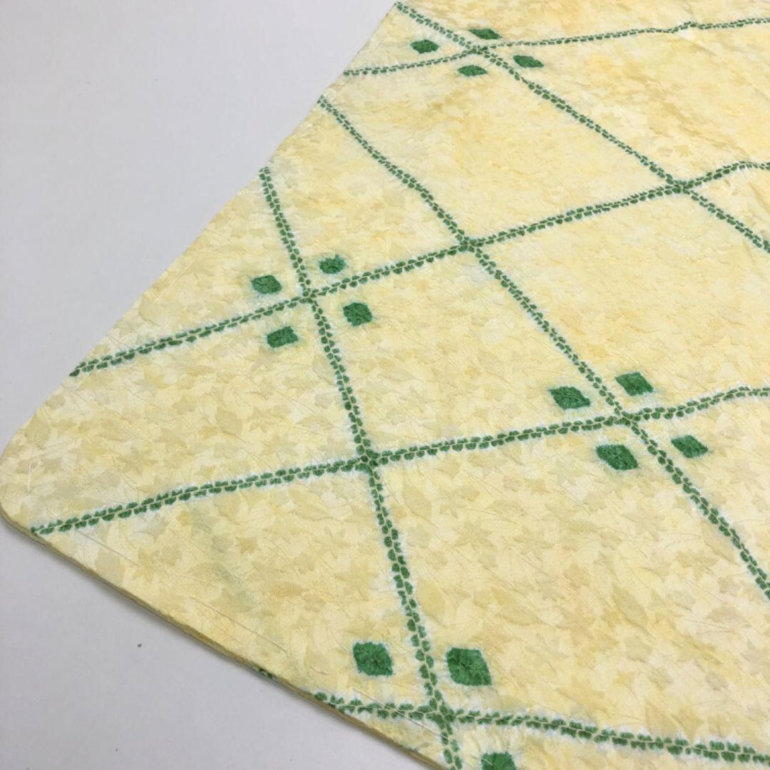 黄色ベースのお色味に花柄地模様、絞り柄の葉模様の柄裄がデザインされた素敵なお品でございます。