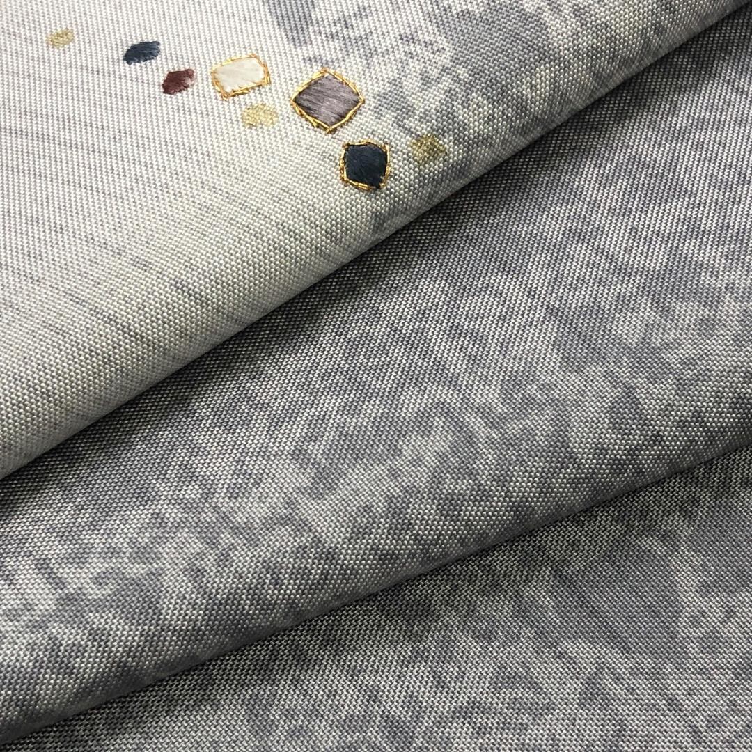 モノトーンベースのお色味、一部刺繍の四角柄のモダンな雰囲気の染め柄がデザインされた素敵なお品でございます。