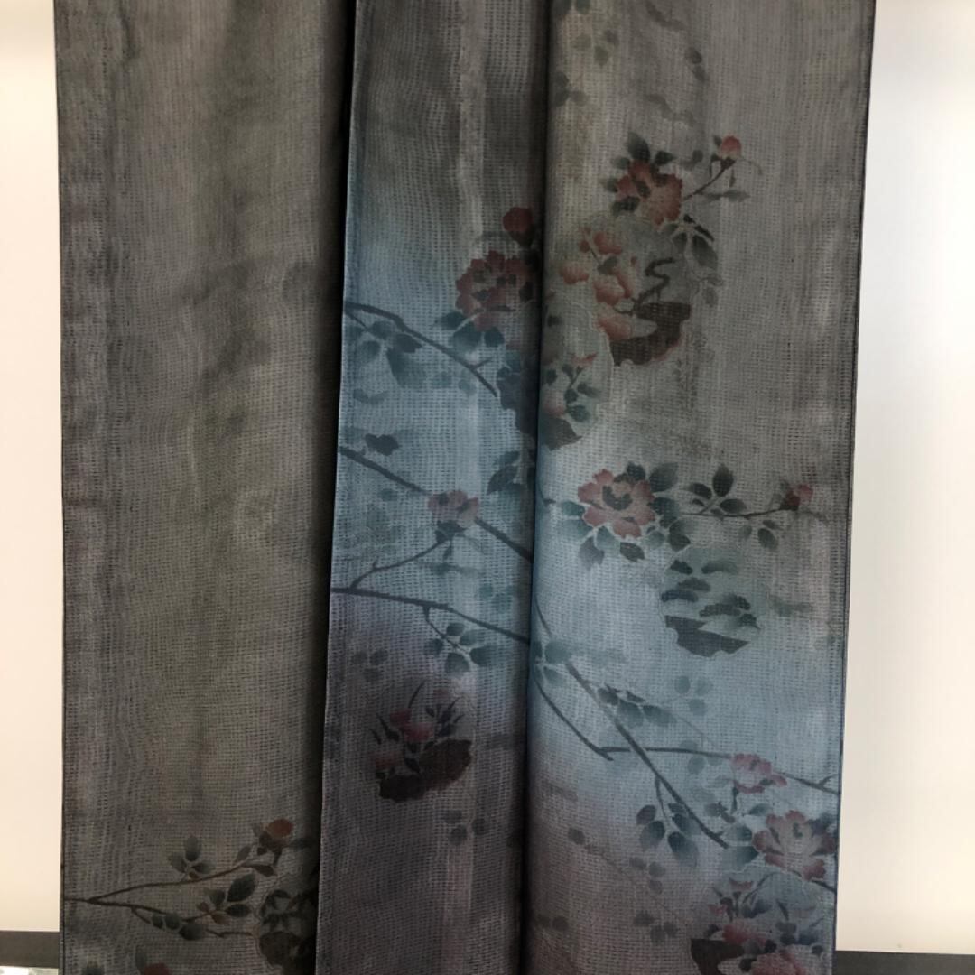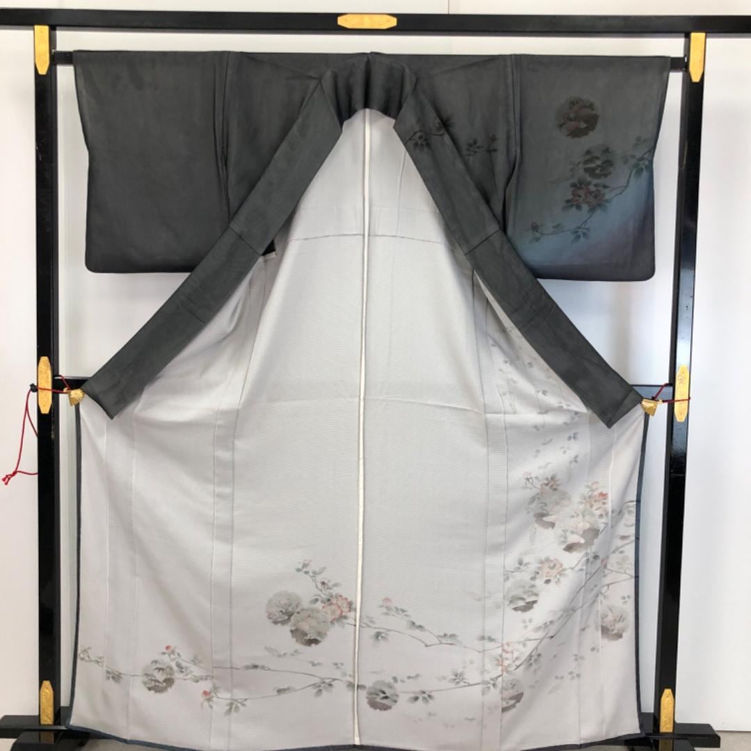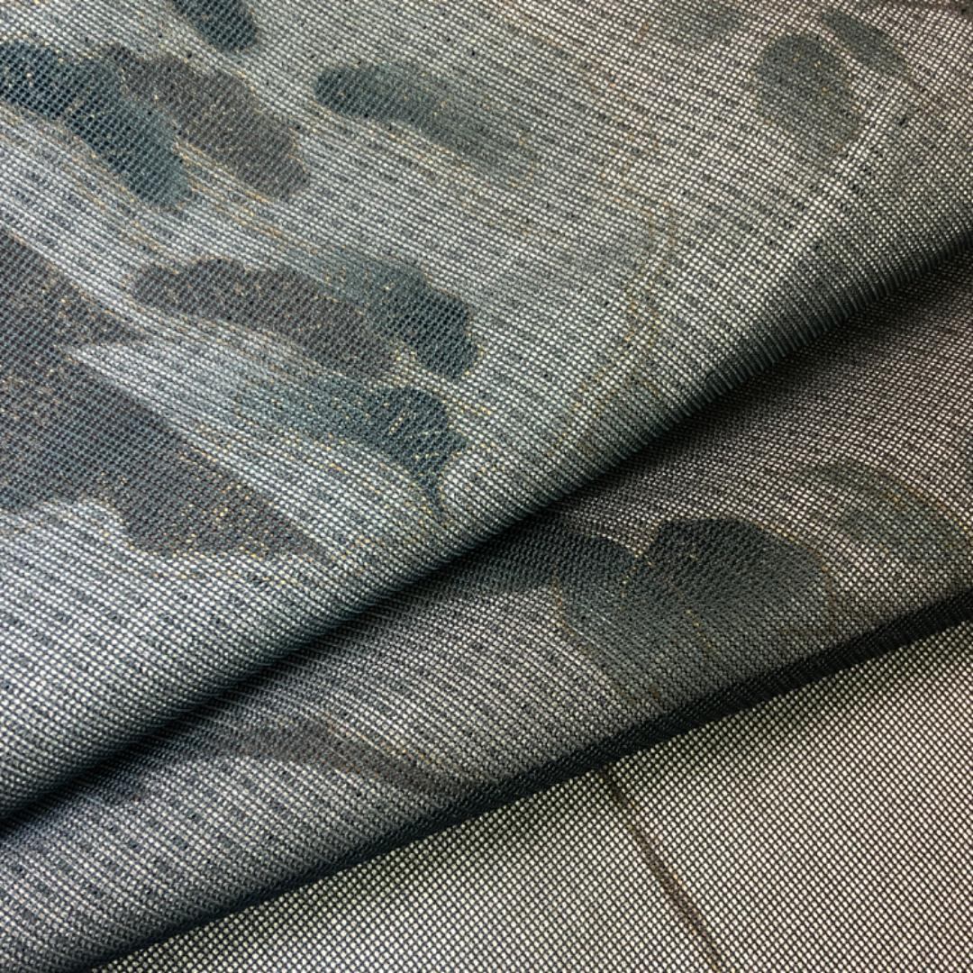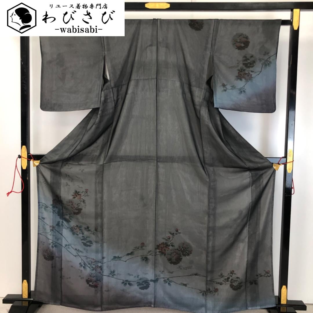 透け感のある黒色ベースのお色味にグラデーション、雪輪、七宝、上品な花模様がデザインされた二枚の異なるお色味の生地が重なり合った紗合せ、涼しげな雰囲気の希少で素敵なお品でございます。