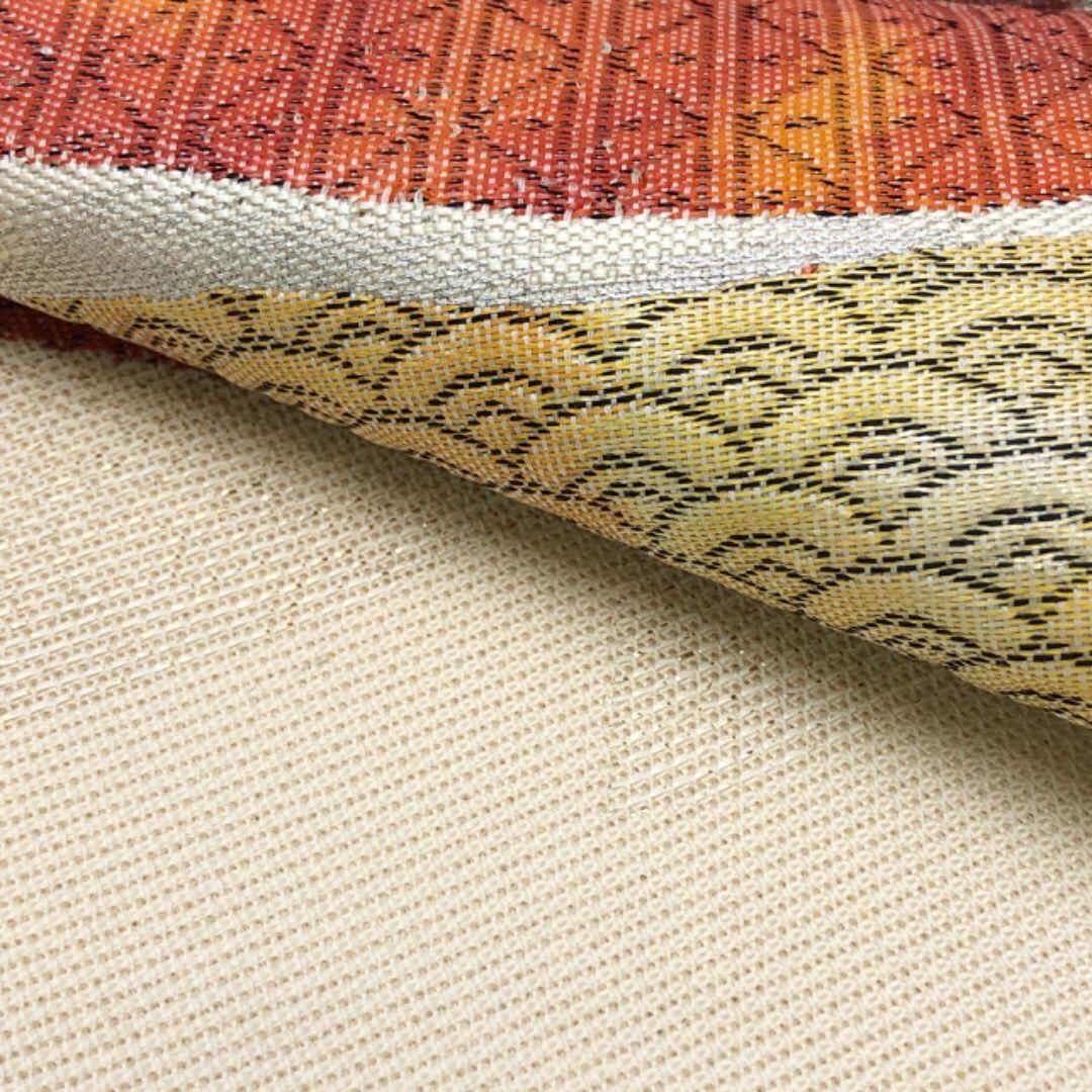 鳥の子色のお色味に霞模様の中に青海波などの柄行がデザインされた素敵なお品でございます。
