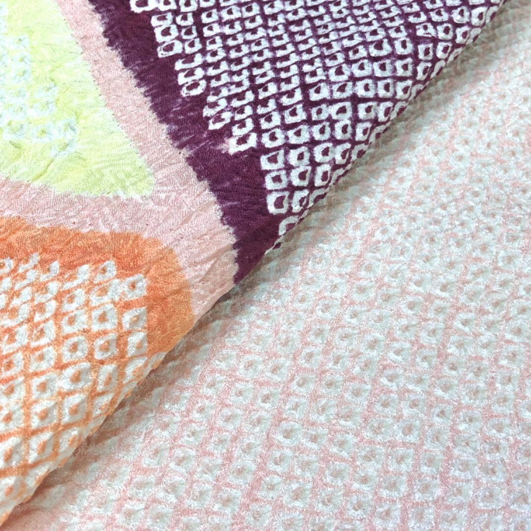 薄東雲色のお色味に四角模様がデザインされた素敵な柄裄のお品でございます。