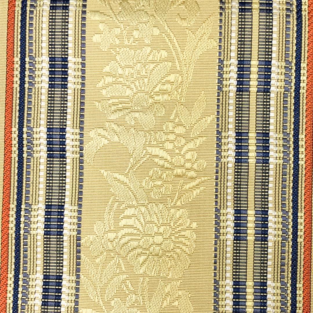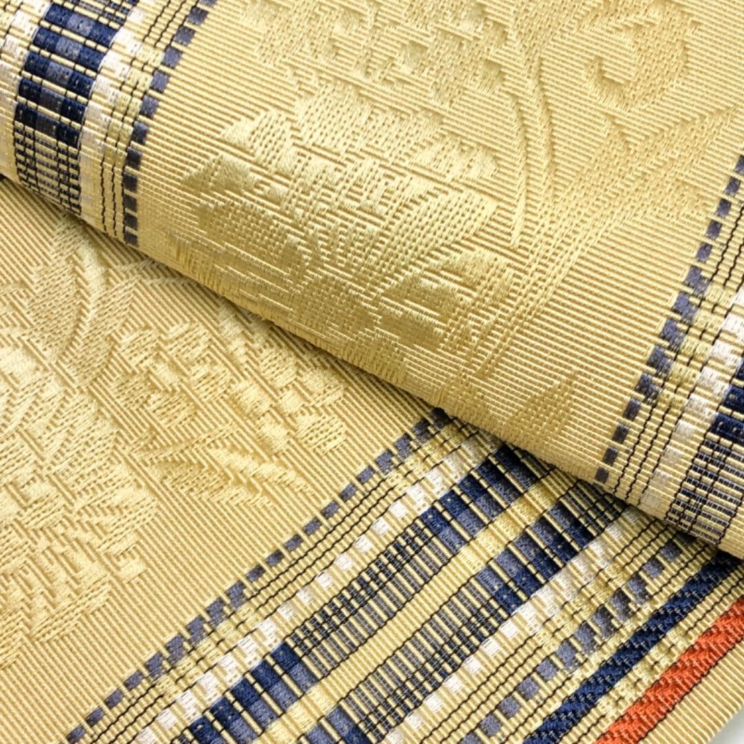 麦藁色のお色味に縦縞模様、花柄模様の柄裄がデザインされた素敵なお品でございます。