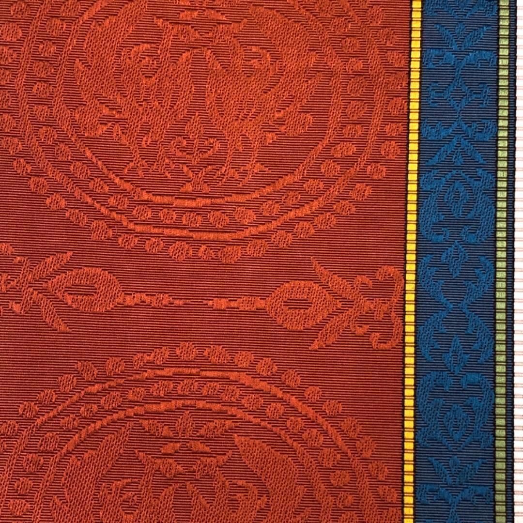 紅柿色のお色味に縦縞模様、丸に向かい鳥、花唐草模様の柄行がデザインされた素敵なお品でございます。