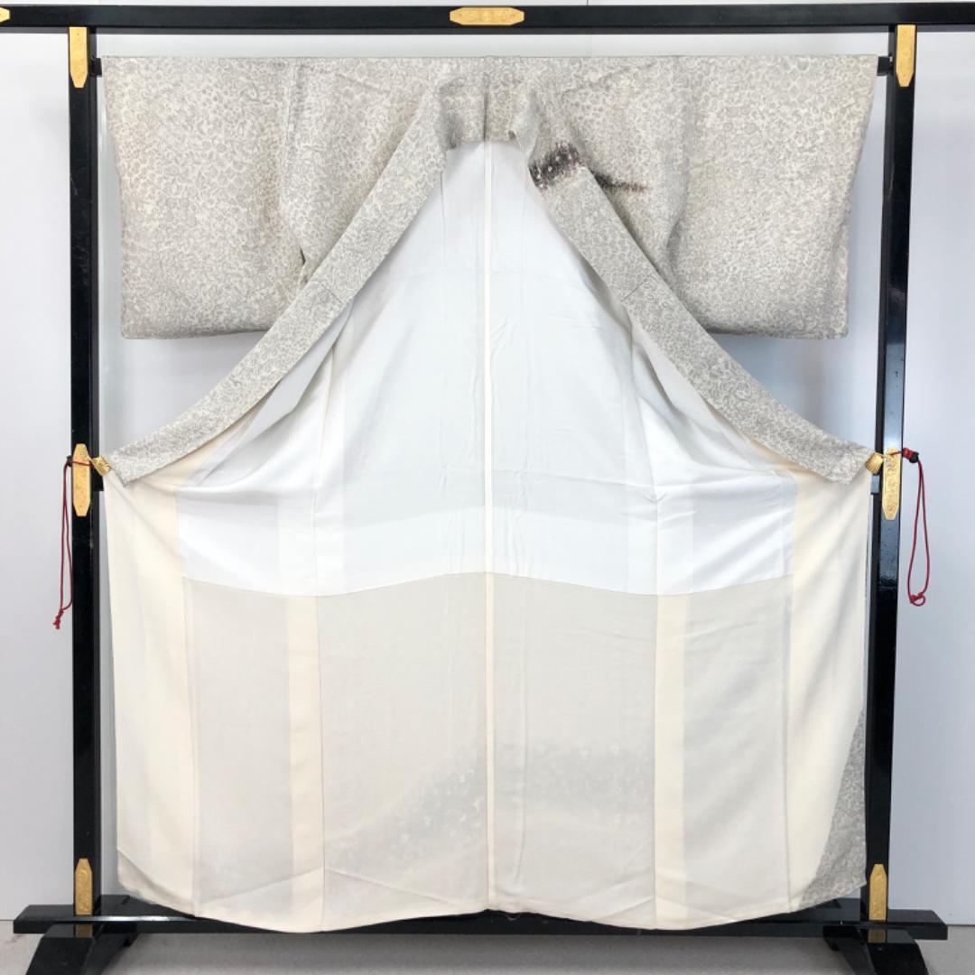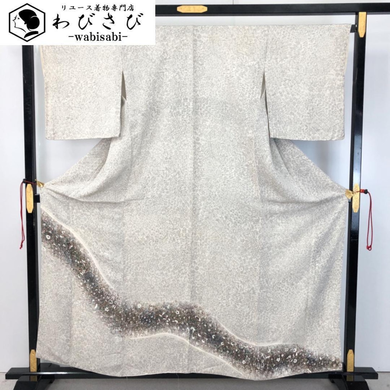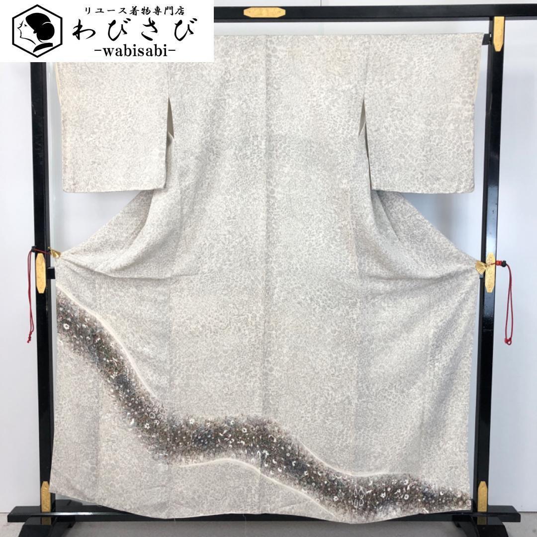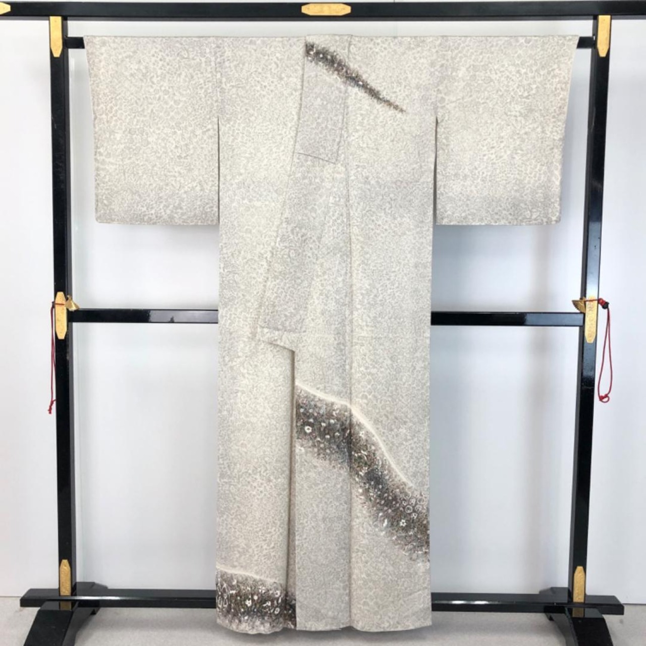 乳白色の品のある色彩の縮緬地に上品な花模様がデザインされた雰囲気の良い素敵な柄裄のお品でございます。