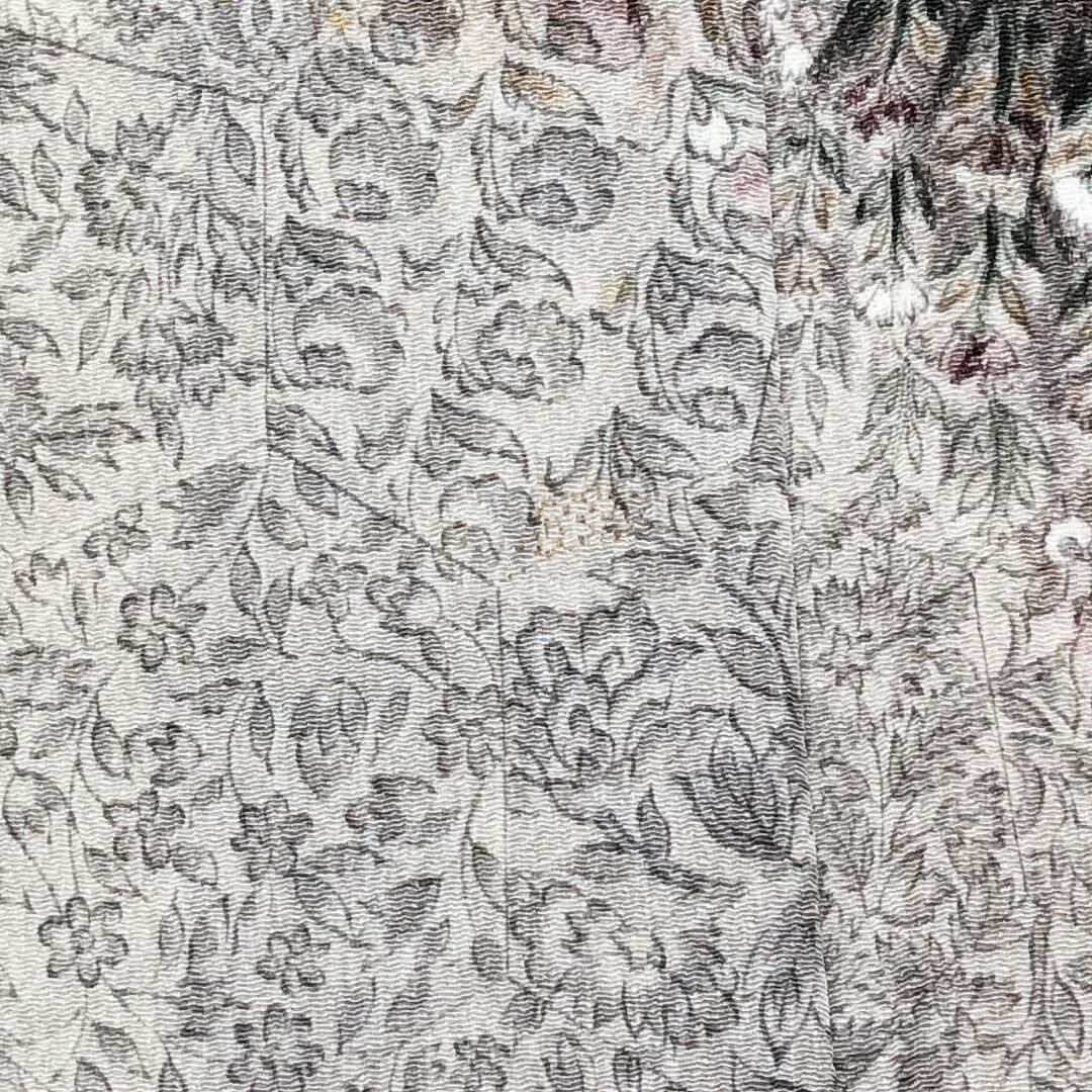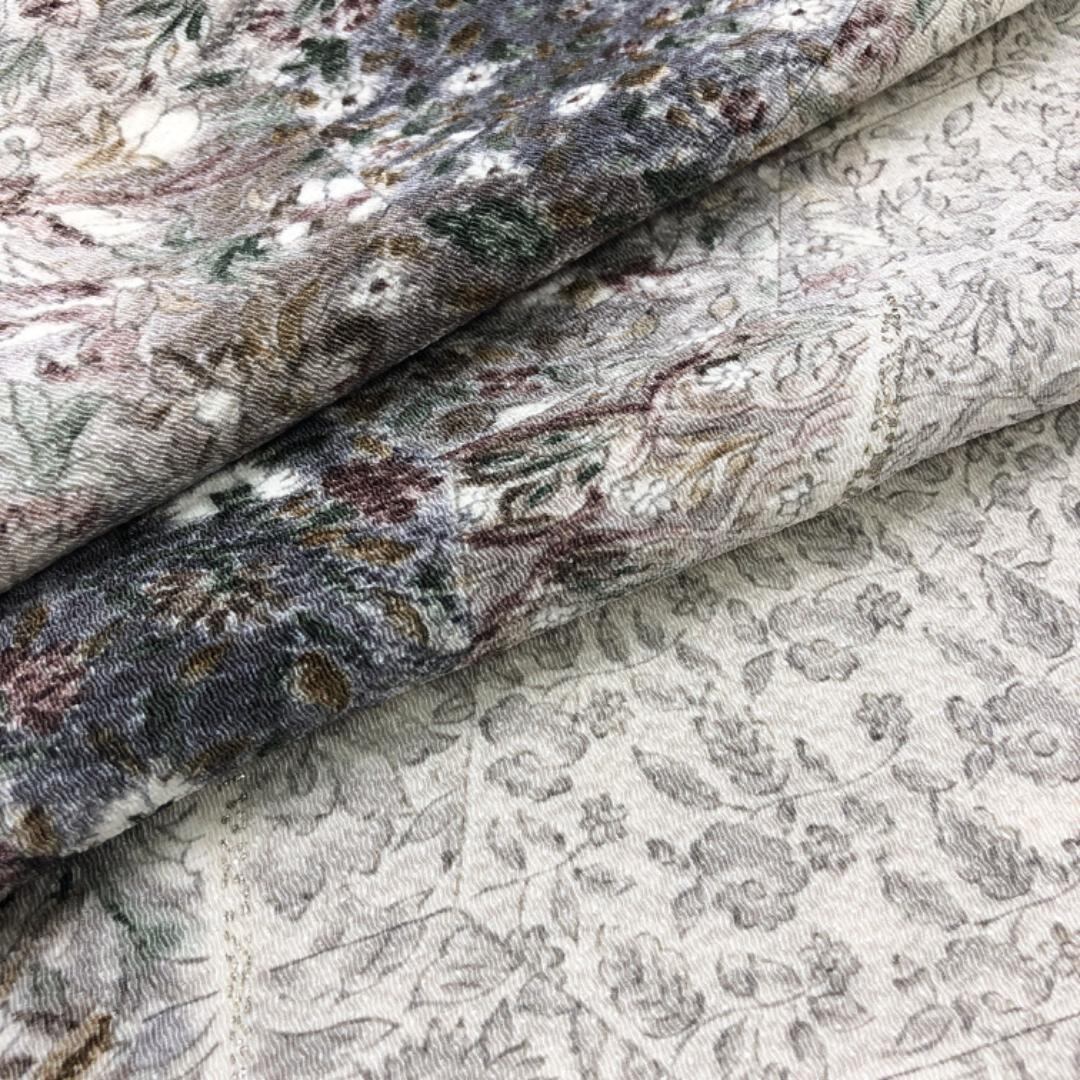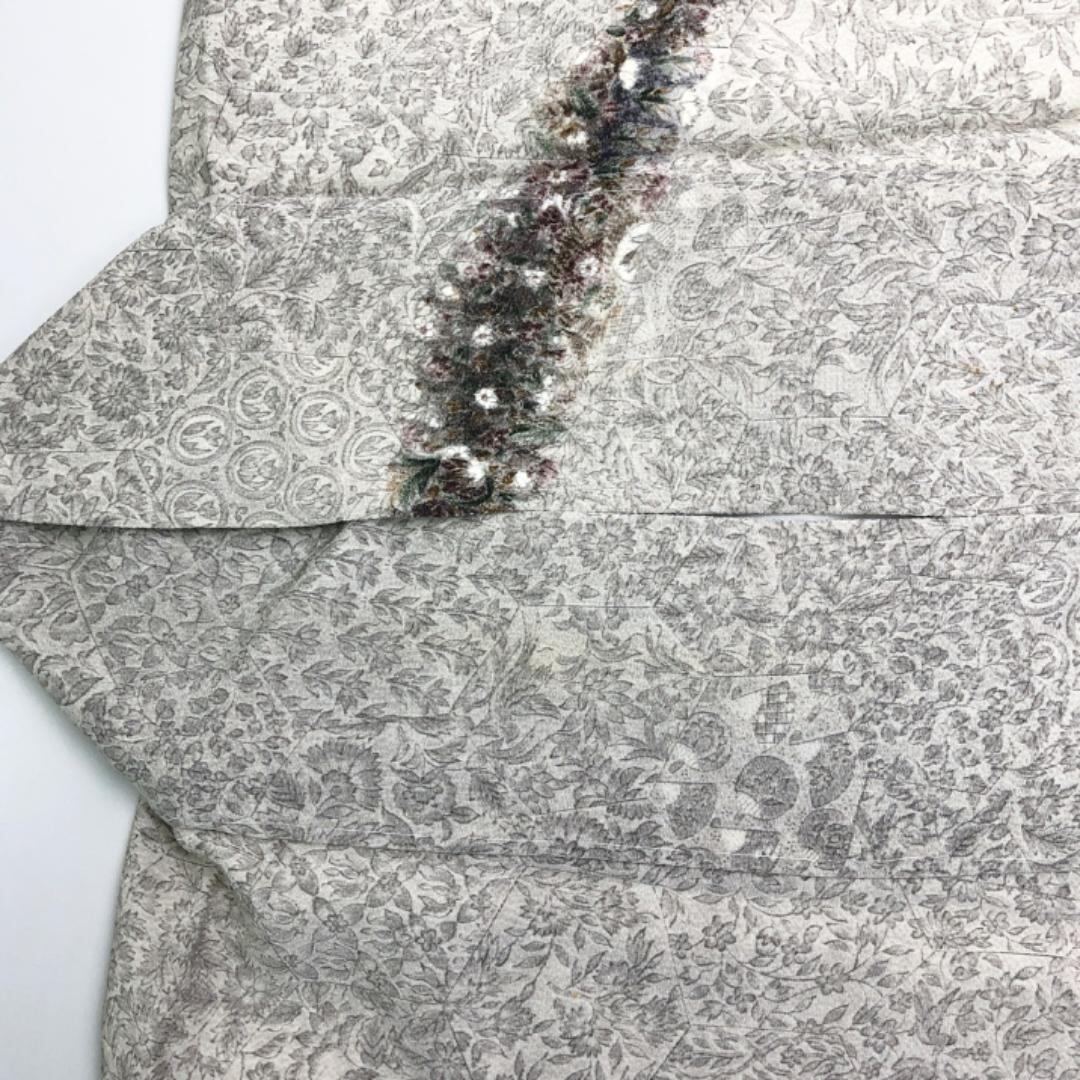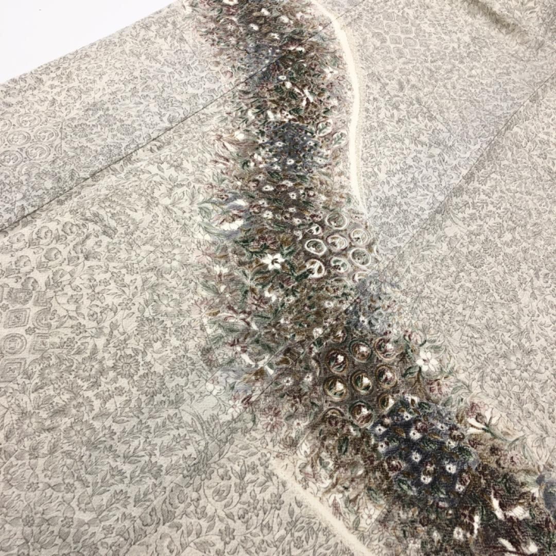 乳白色の品のある色彩の縮緬地に上品な花模様がデザインされた雰囲気の良い素敵な柄裄のお品でございます。