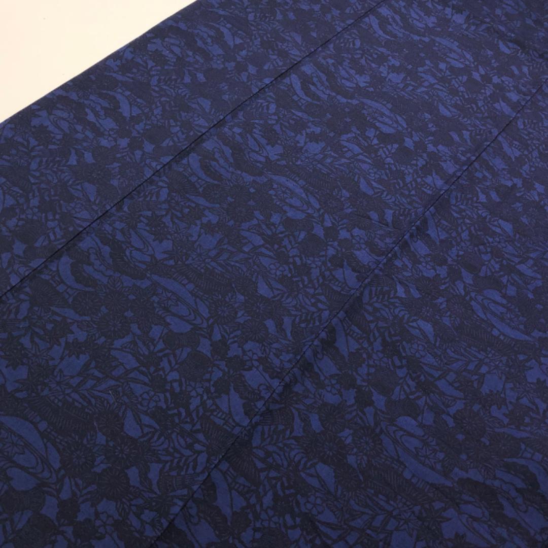 雰囲気の良い藍染の美しい藍色のお色味、型染の四季の花模様の柄裄がデザインされた素敵なお品でございます。