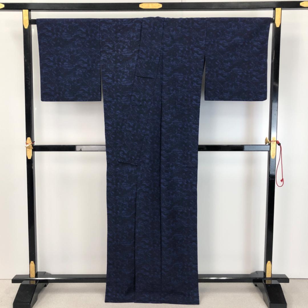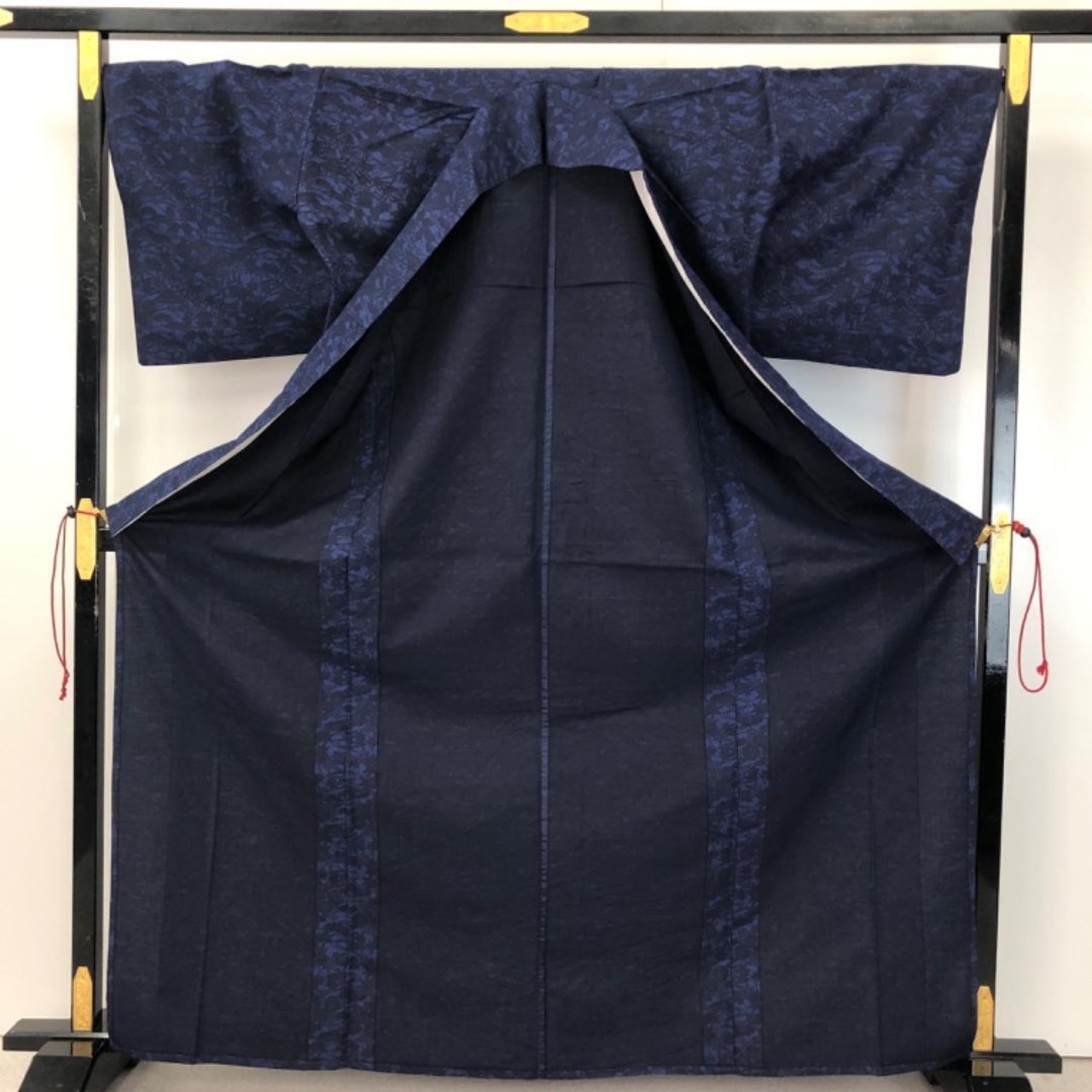 単衣 紬 藍染 型染 四季の花模様 藍色 トールサイズ K-4681 着物 きもの kimono 和服 和装 中古 リサイクル着物 【送料無料】