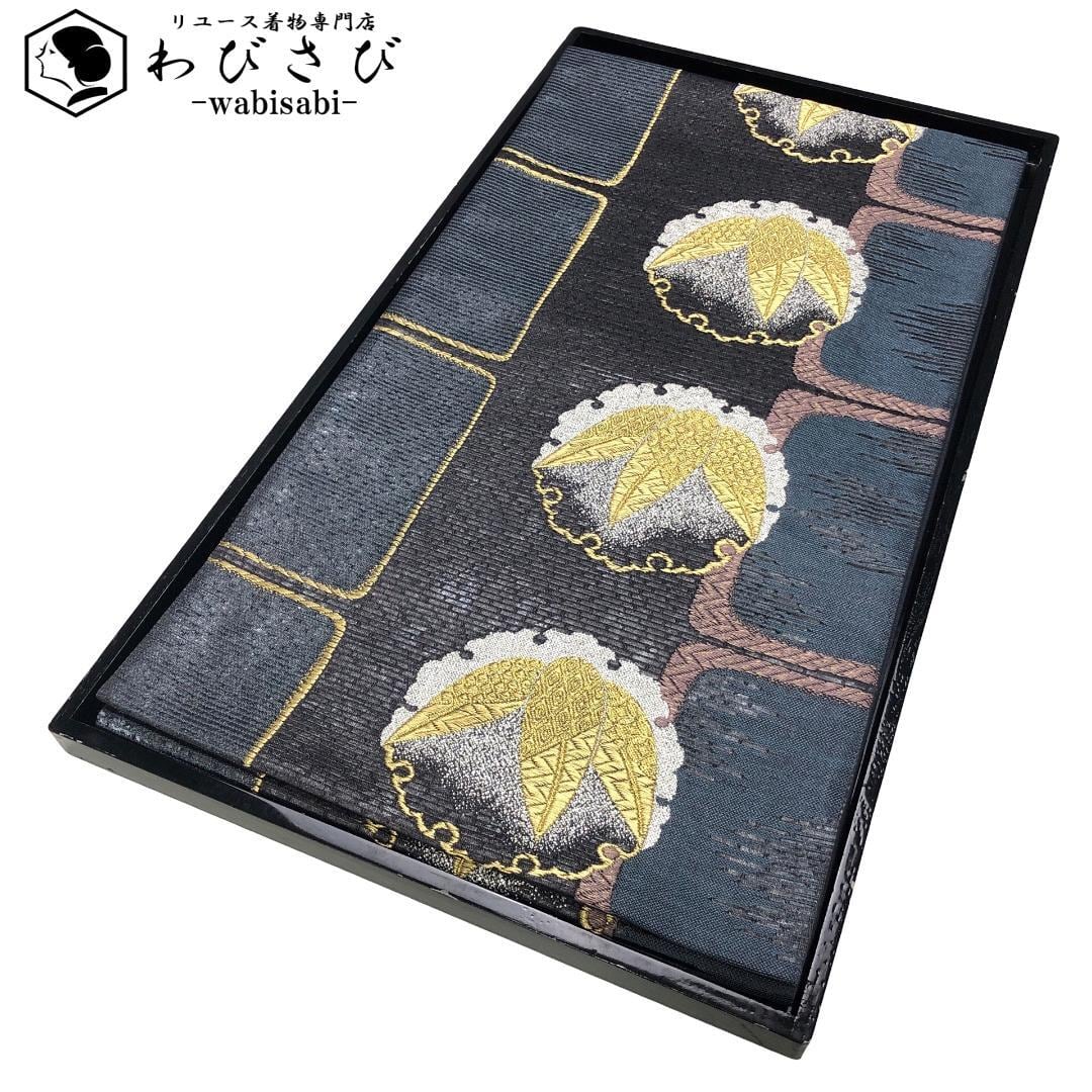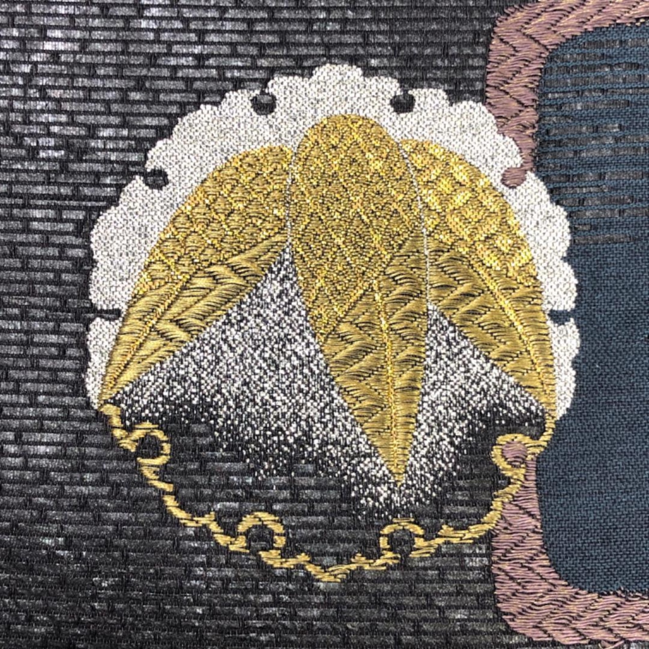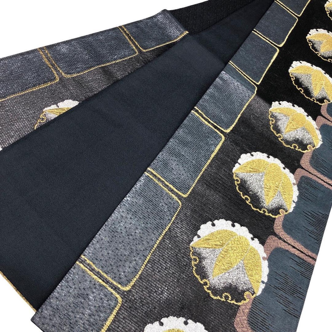 墨色の落ち着いたお色味、雪輪に笹の葉模様の雰囲気の良い柄行がデザインされた素敵なお品でございます。
