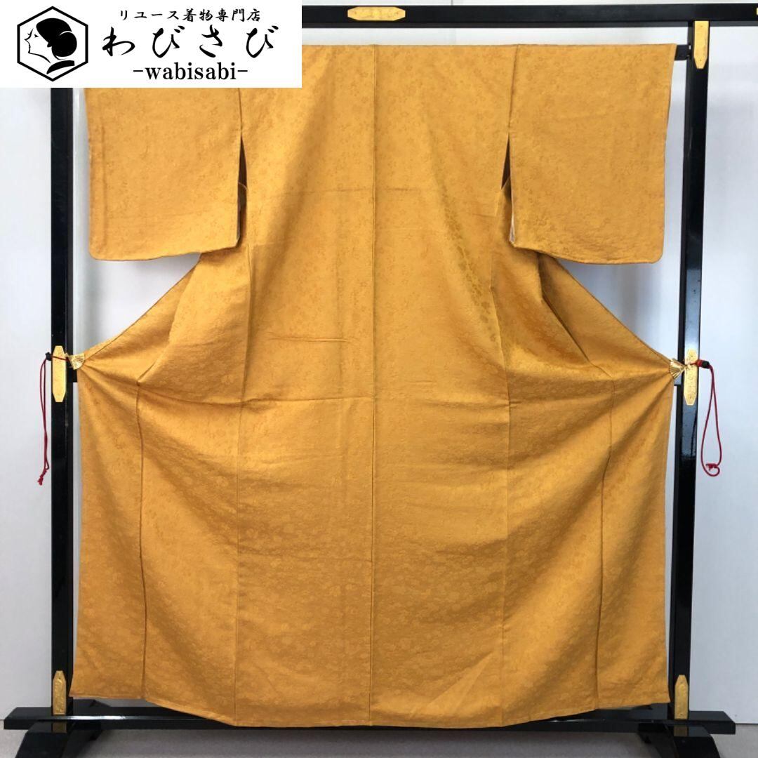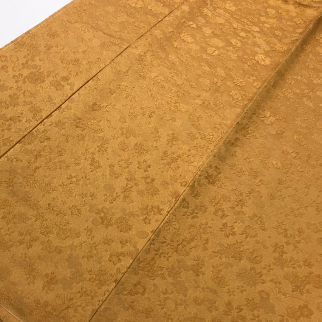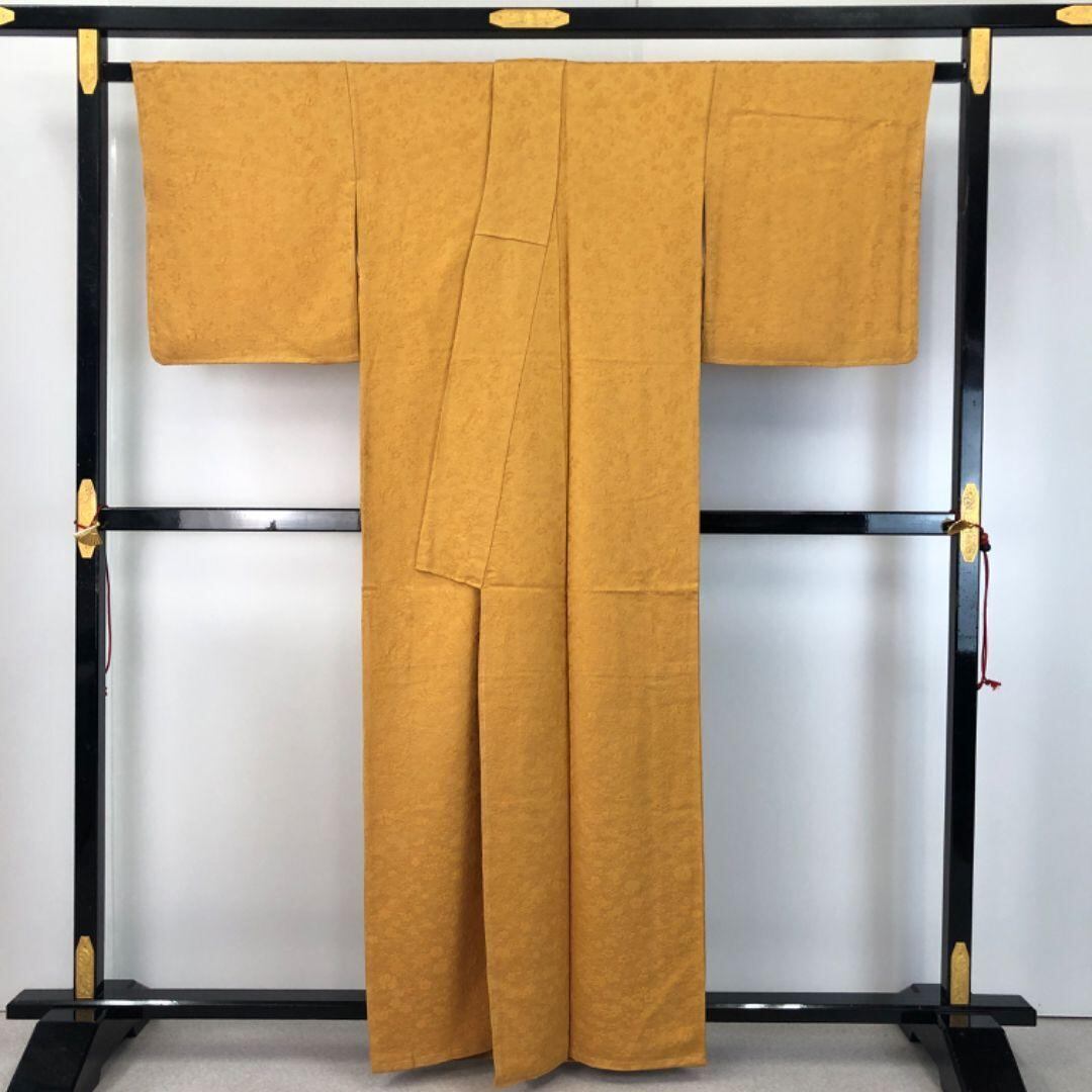 濃卵色のお色味の縮緬地に花柄の地模様がデザインされた素敵なお品でございます。