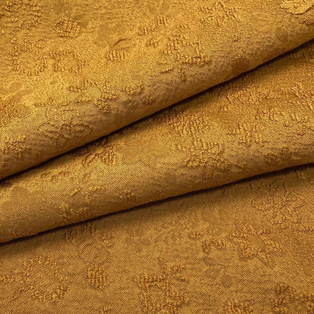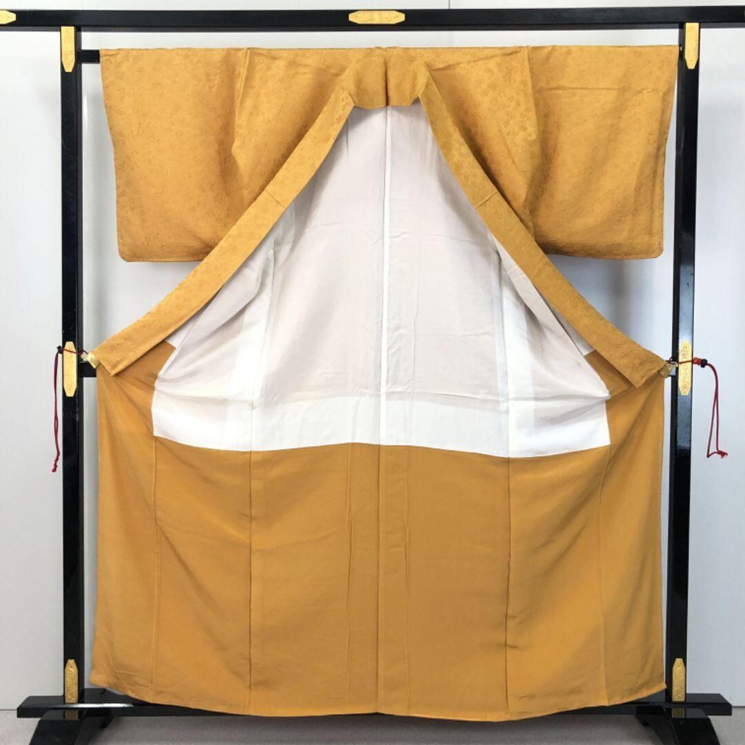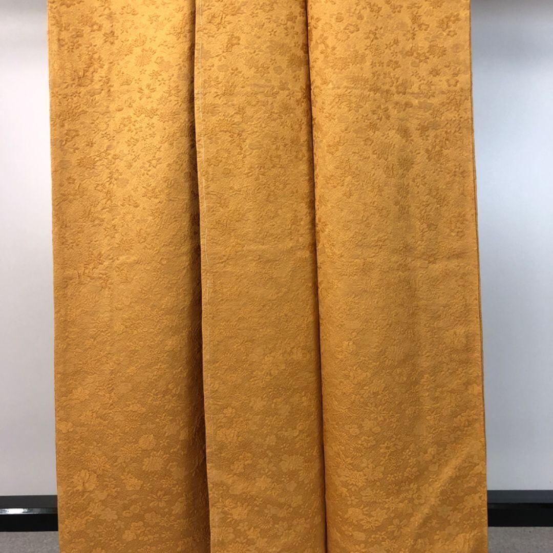 濃卵色のお色味の縮緬地に花柄の地模様がデザインされた素敵なお品でございます。