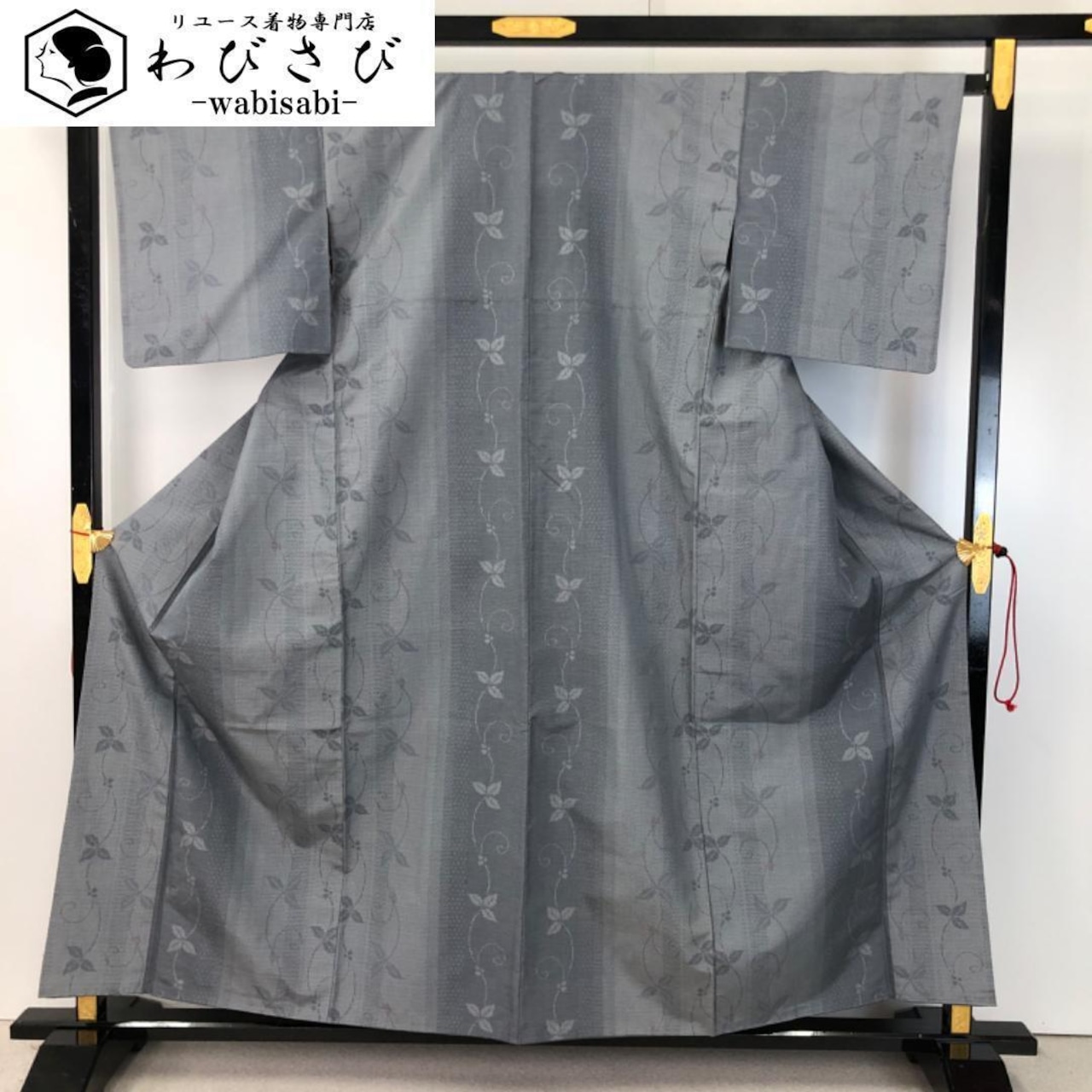 紬着物 縦柄の亀甲に草花模様 灰青色 ふくよかサイズ K-4701 着物 きもの kimono 和服 和装 中古 リサイクル着物 【送料無料】