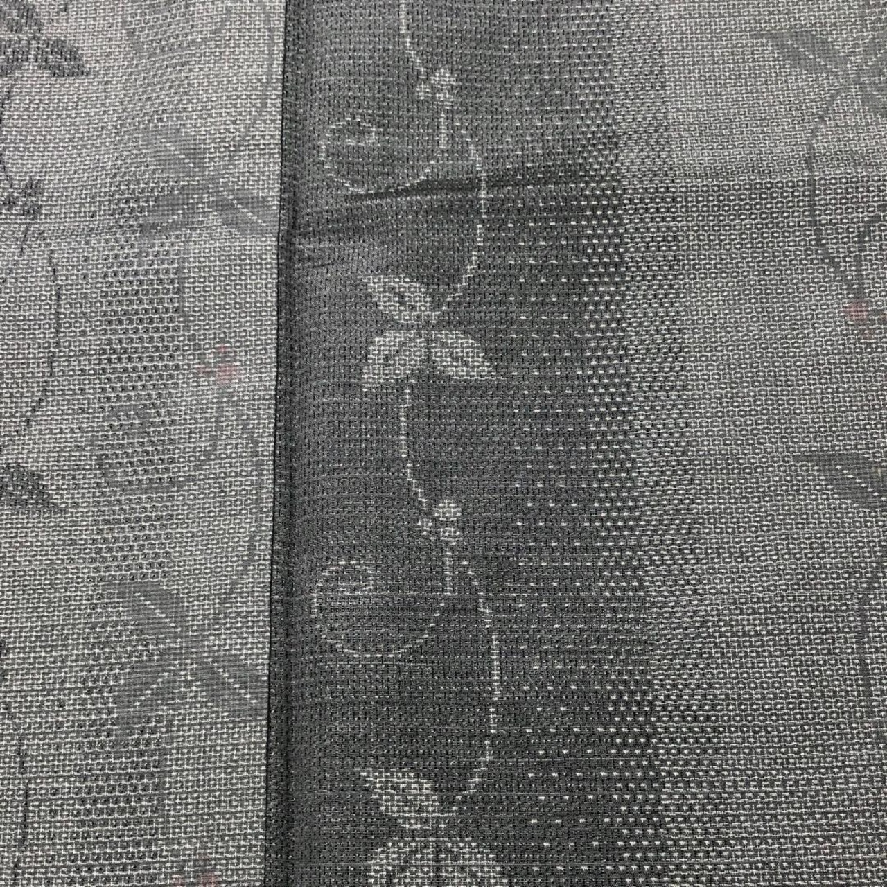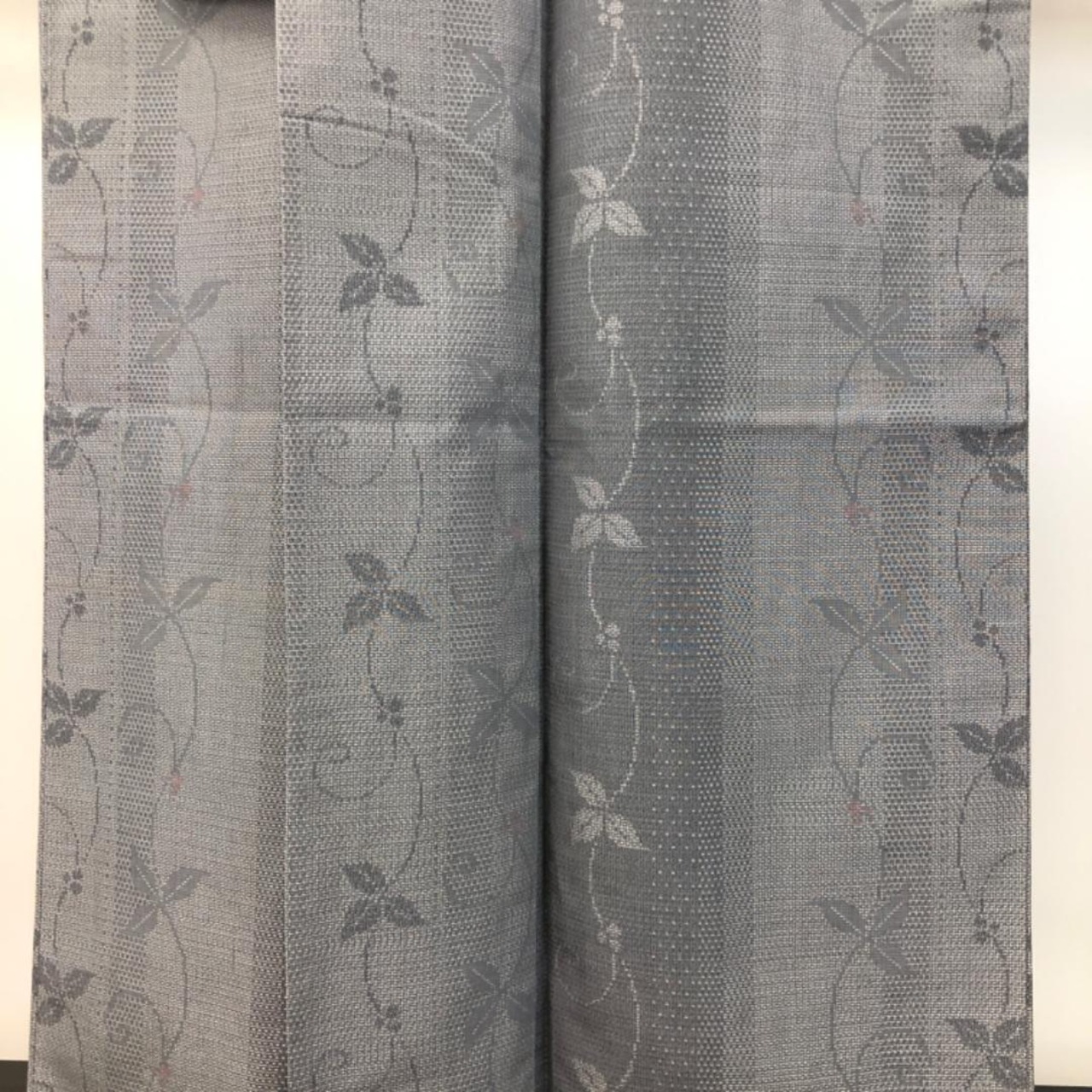 灰青色ベースのお色味に縦柄の亀甲に草花模様の柄裄がデザインされた素敵なお品でございます。