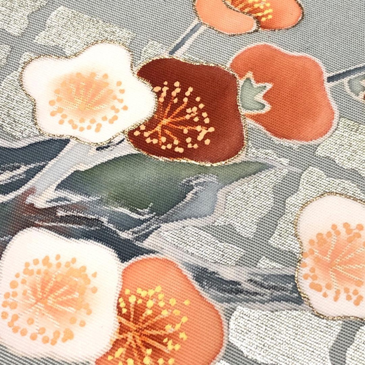 名古屋帯 塩瀬 作家物 格子に梅 金彩 裏葉色 O-5048 着物 きもの kimono 和服 和装 中古 リサイクル着物 【送料無料】