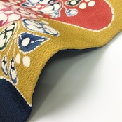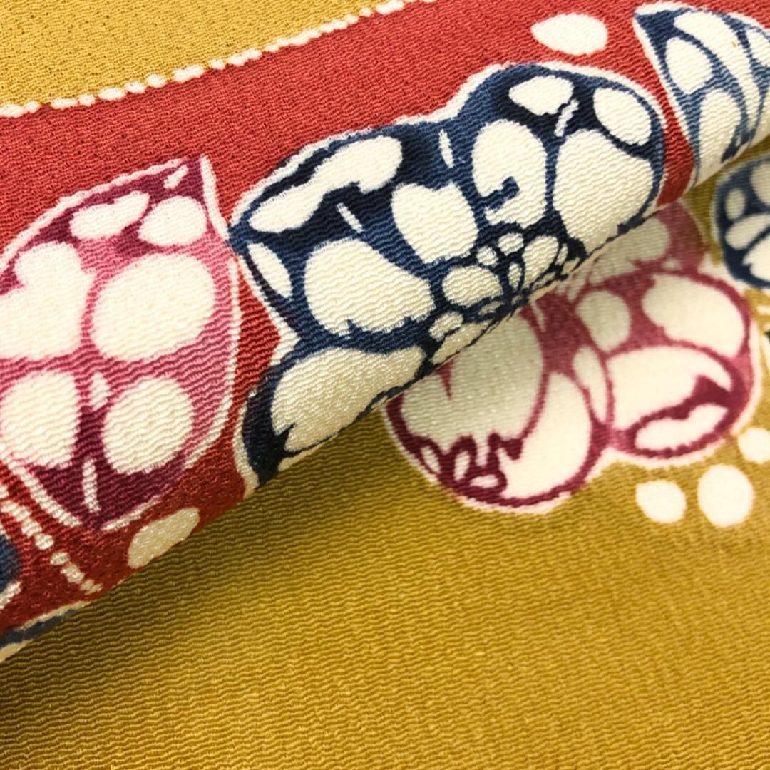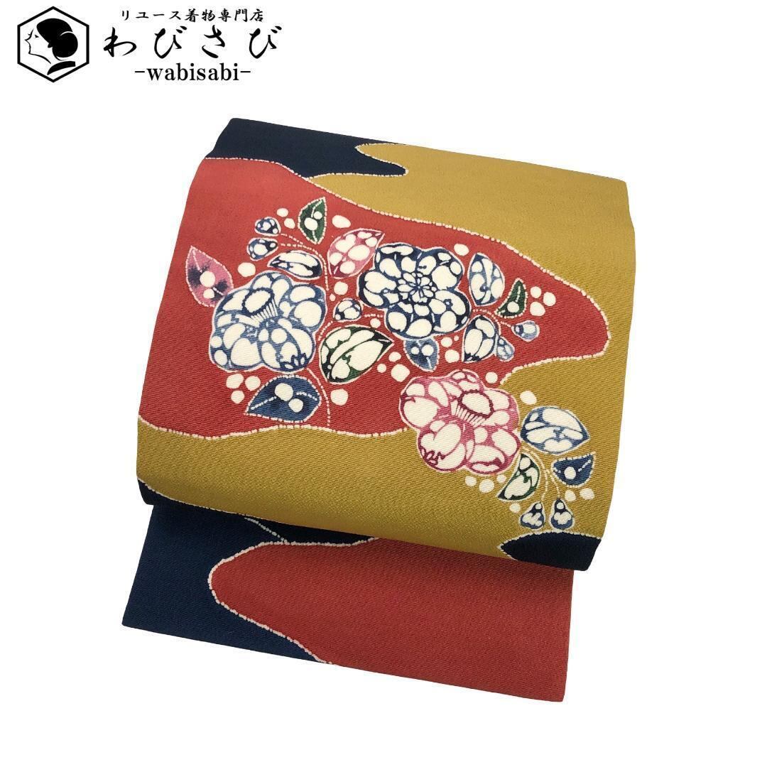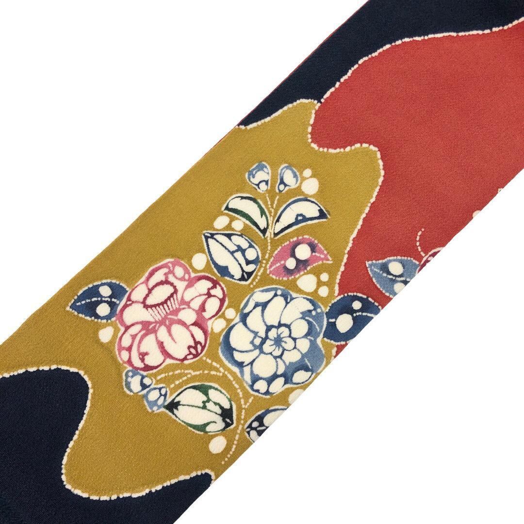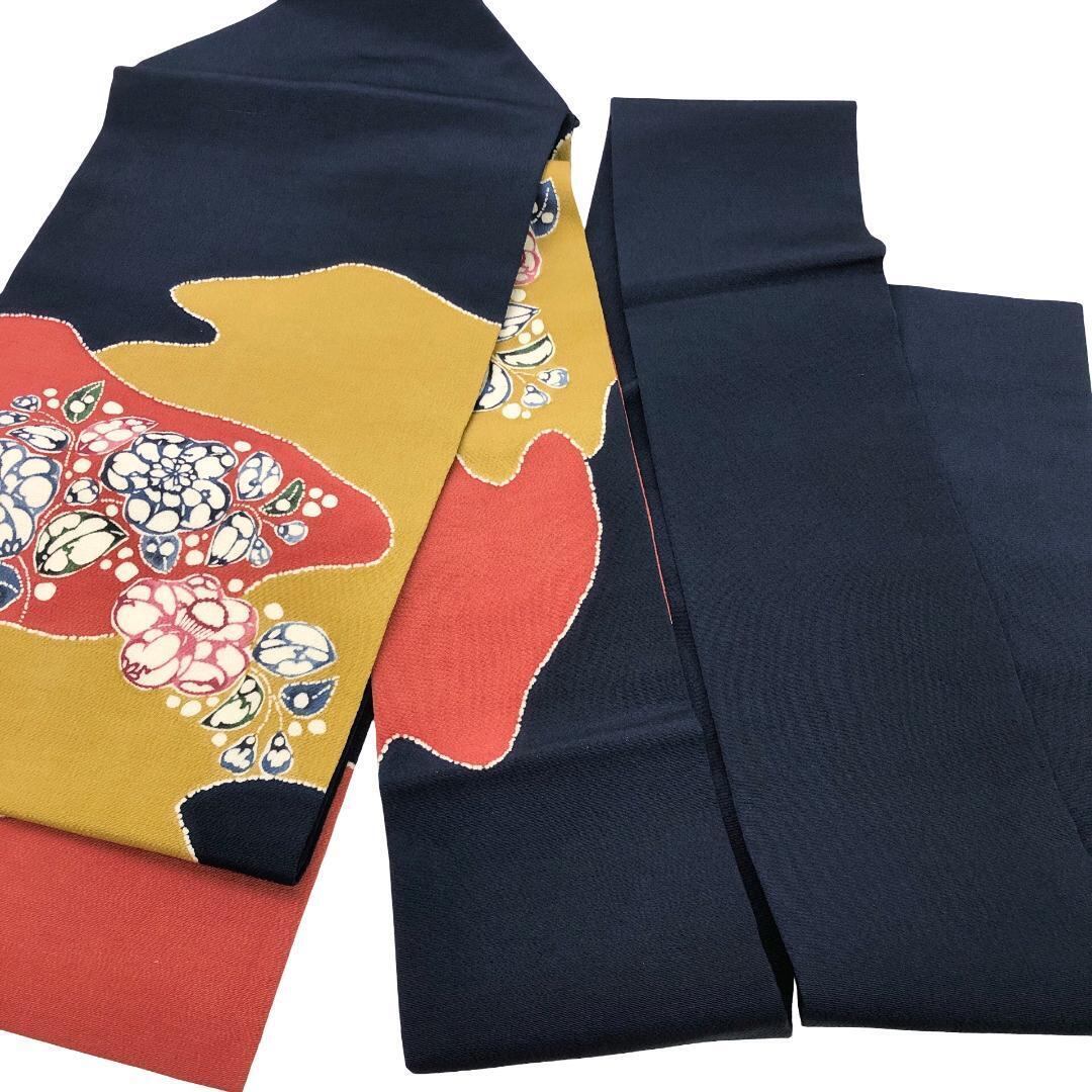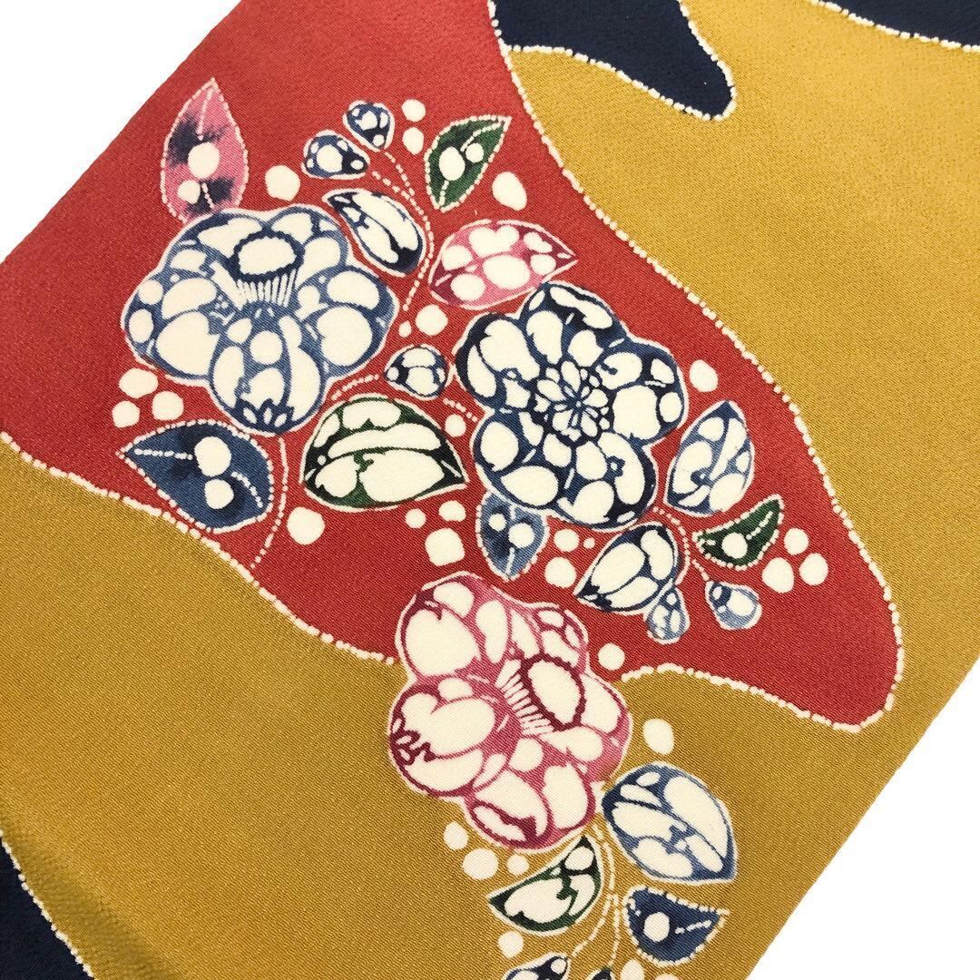 染め分けの色鮮やかな染色の縮緬地に椿の花模様の柄裄がデザインされた素敵なお品でございます。