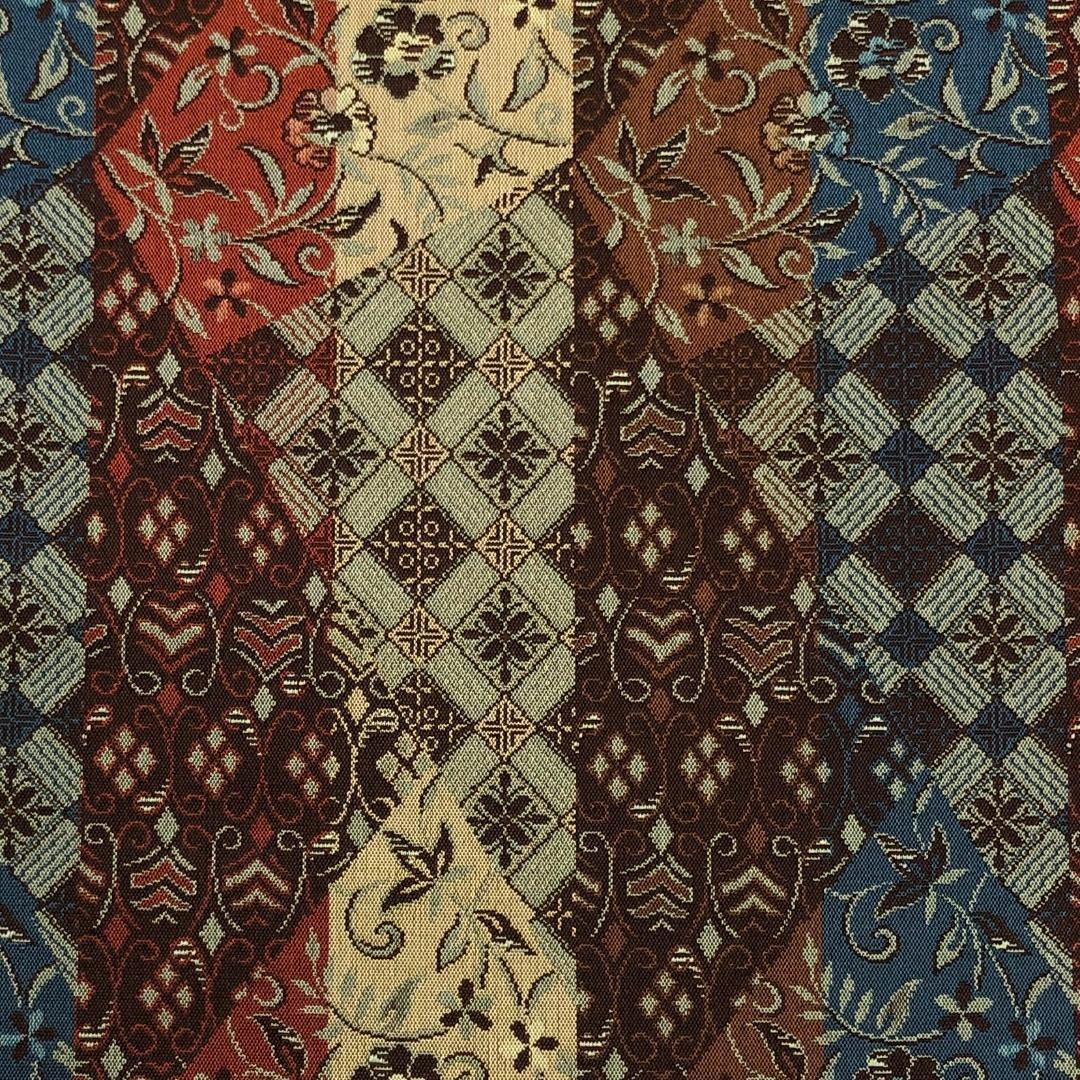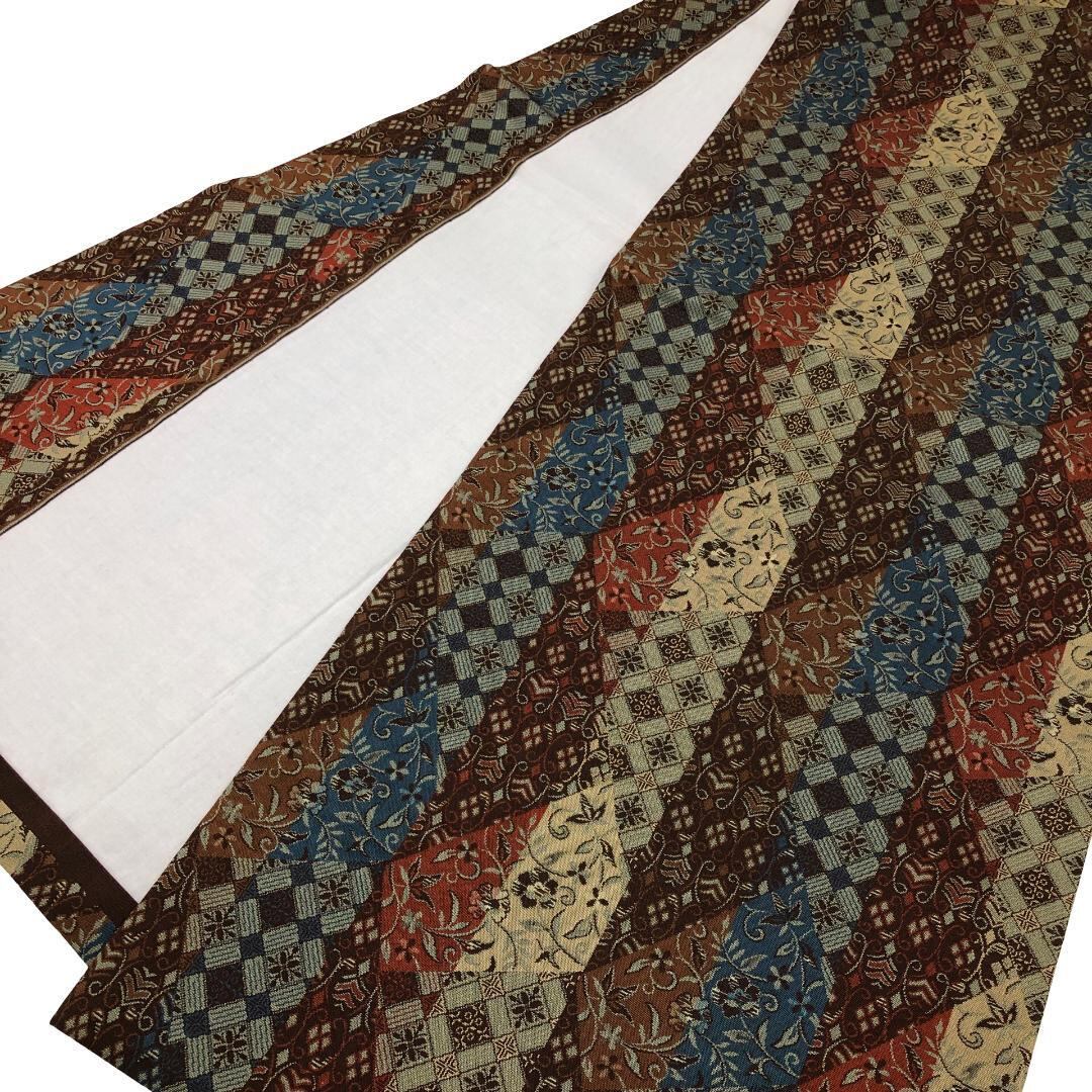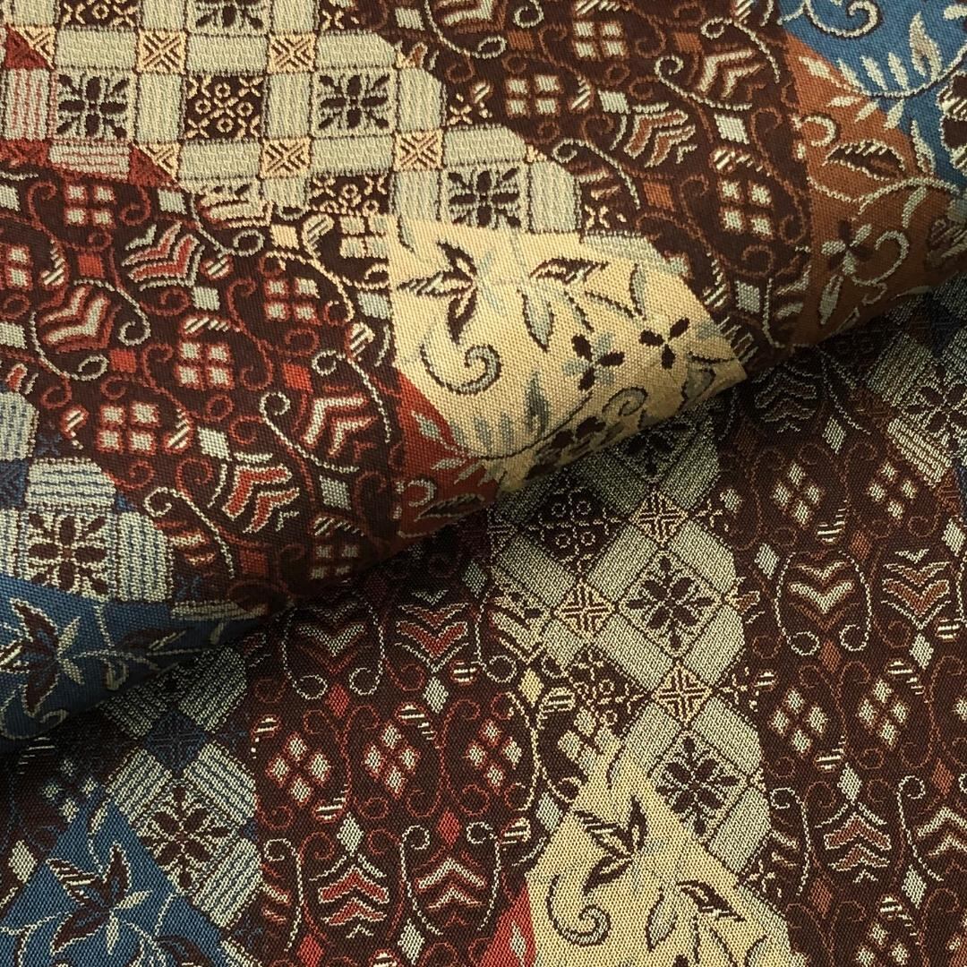 落ち着いた多様な色彩、縦柄の花唐草模様、花菱模様の柄裄がデザインされた雰囲気の良い素敵なお品でございます。