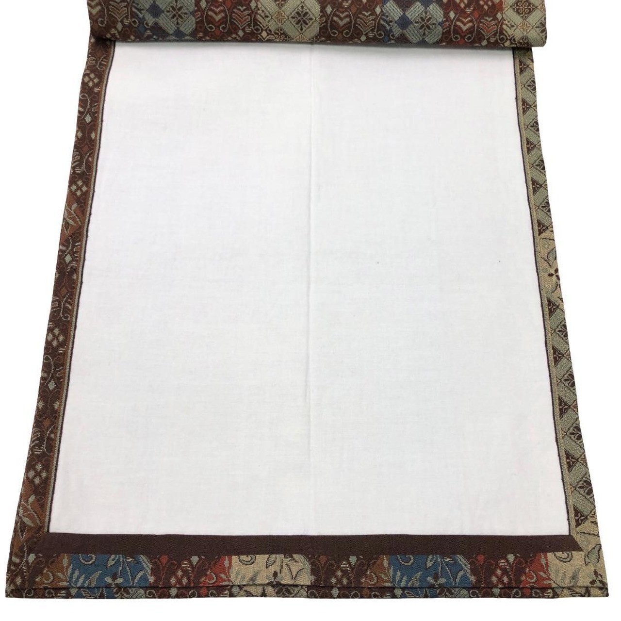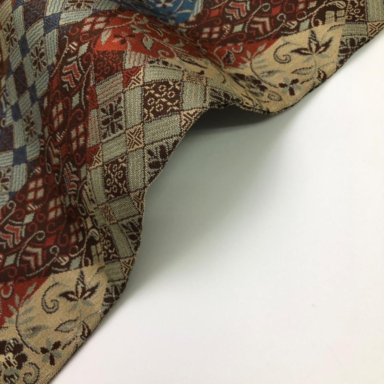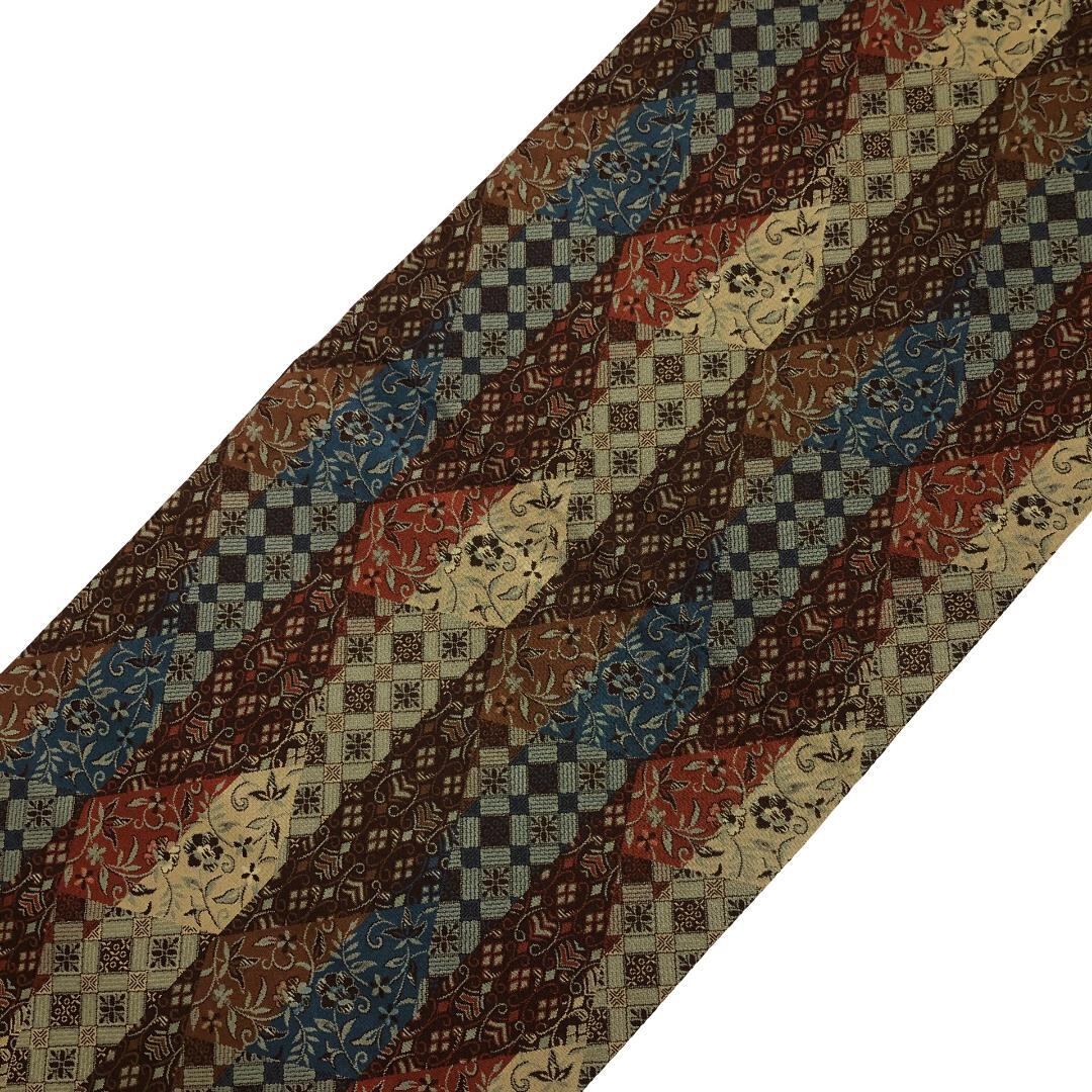 落ち着いた多様な色彩、縦柄の花唐草模様、花菱模様の柄裄がデザインされた雰囲気の良い素敵なお品でございます。