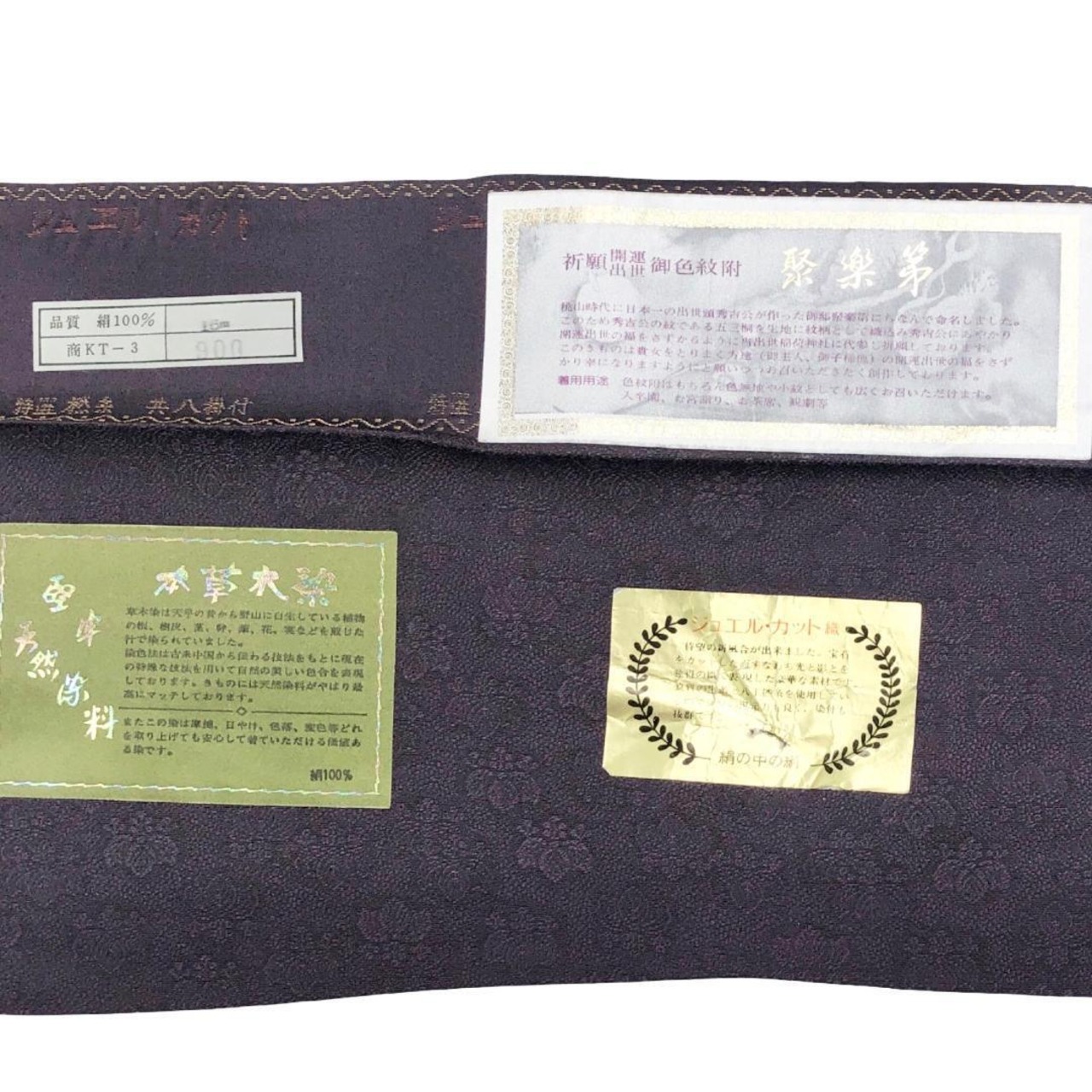 本草木染の茄子紺色の落ち着きのあるお色味に五三桐の地模様、上質な手触りの素敵なお品でございます。