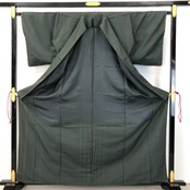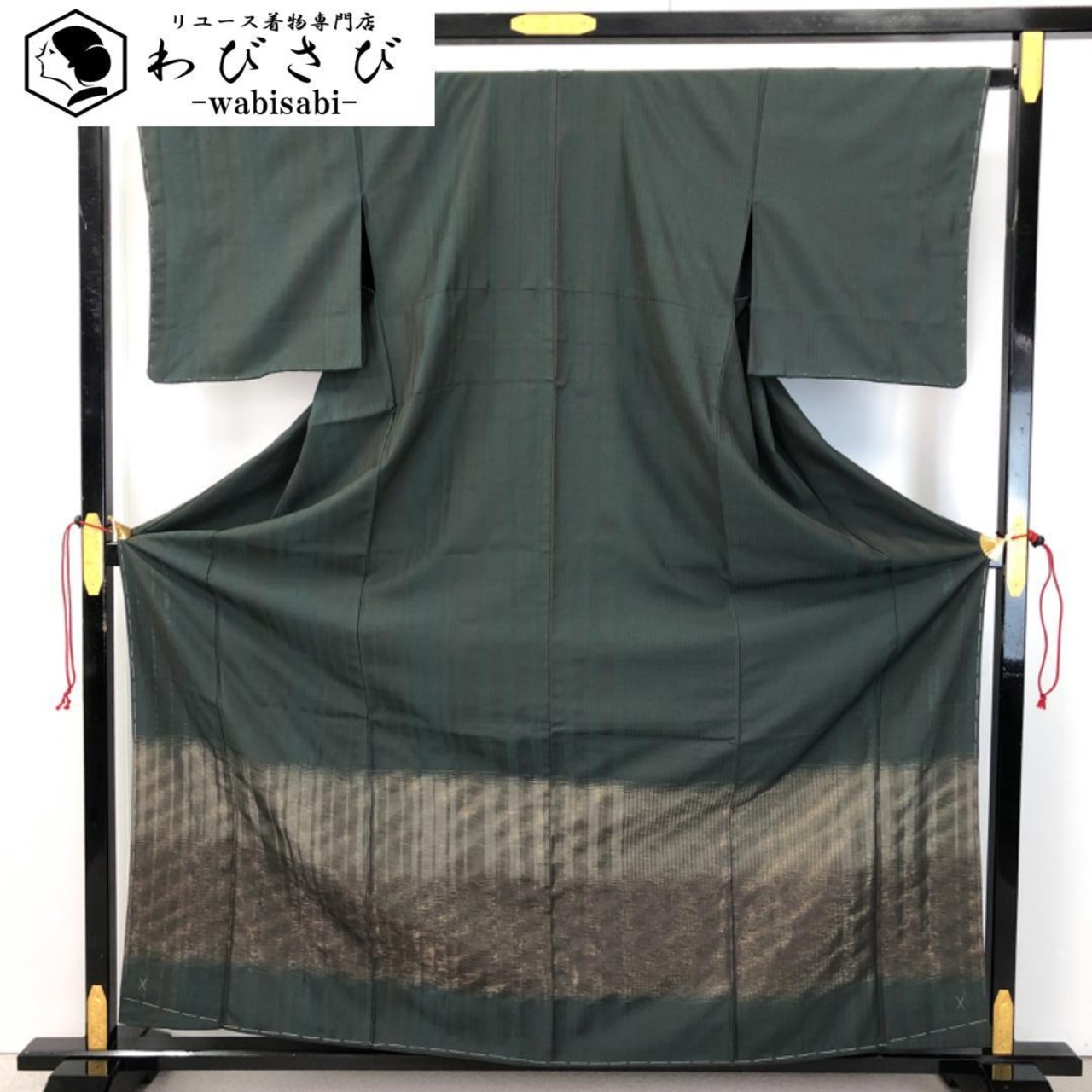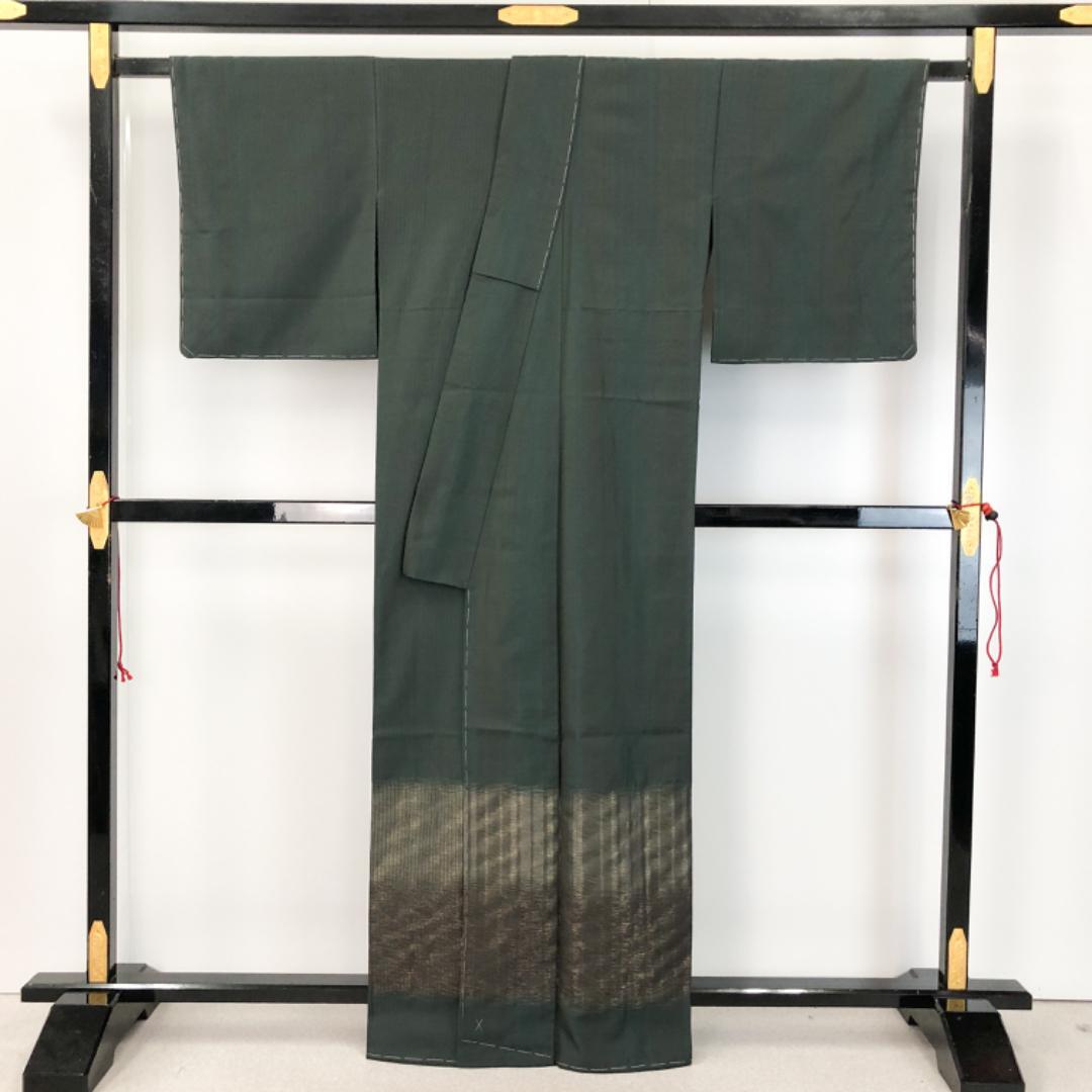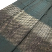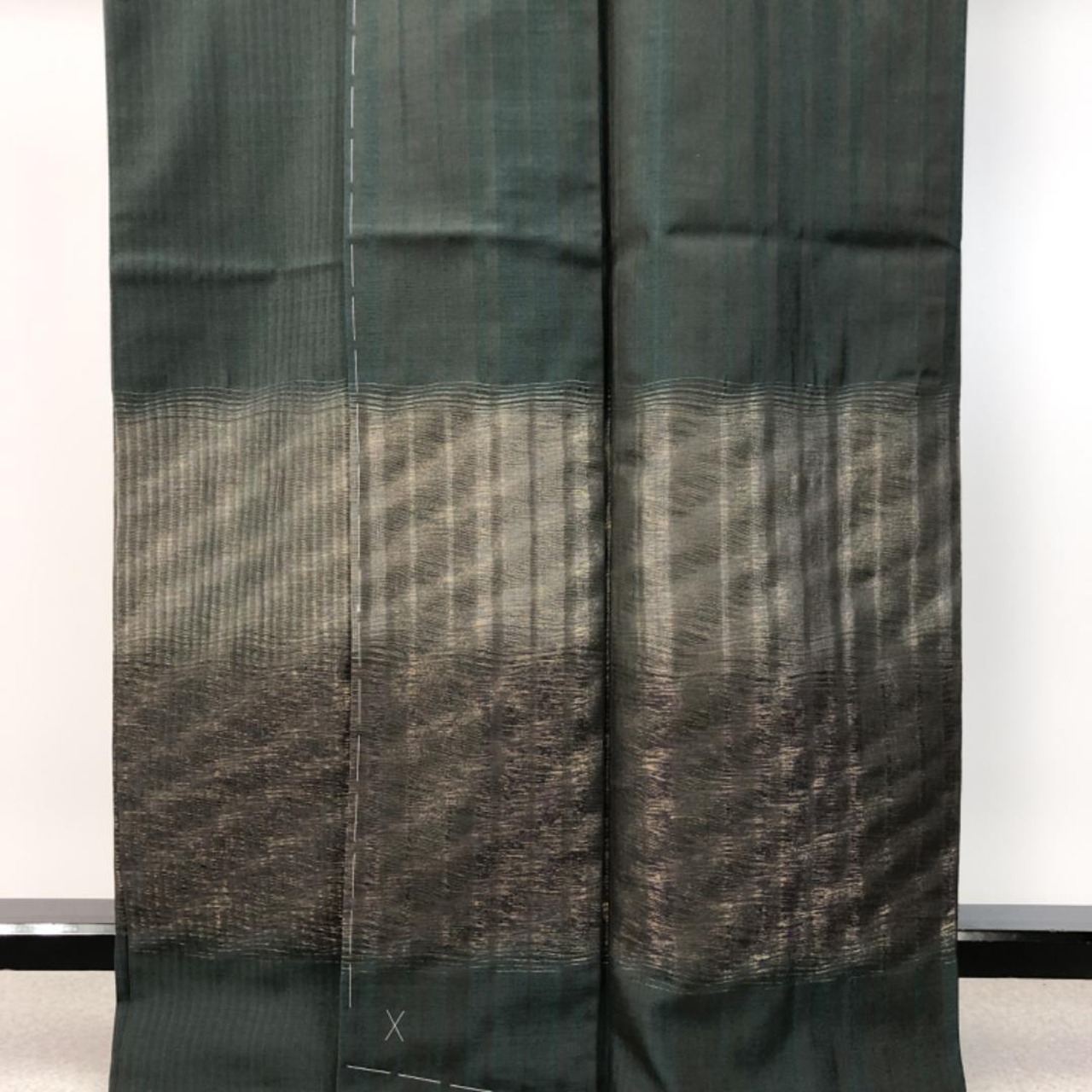 鉄色ベースのお色味に金糸が織り込まれた透け感のある重なり合った美しい横柄の織模様がデザインされた上品な雰囲気の漂う素敵なお品でございます。