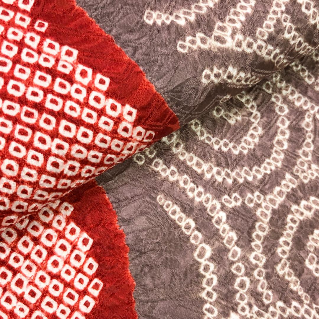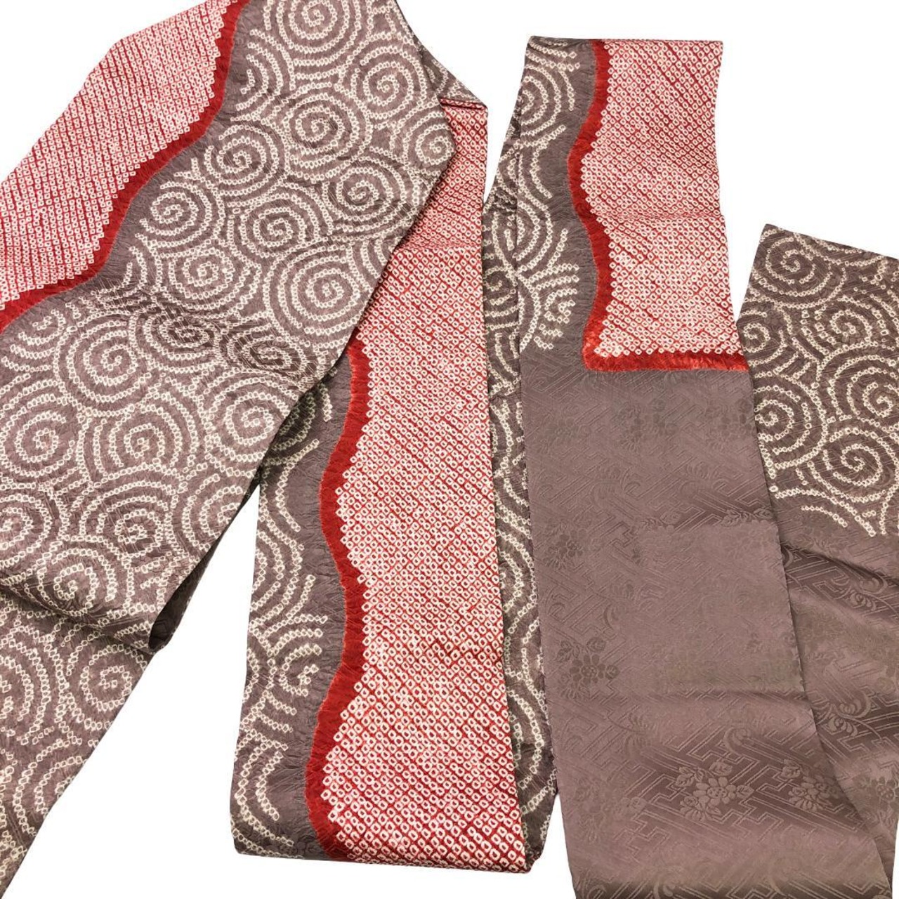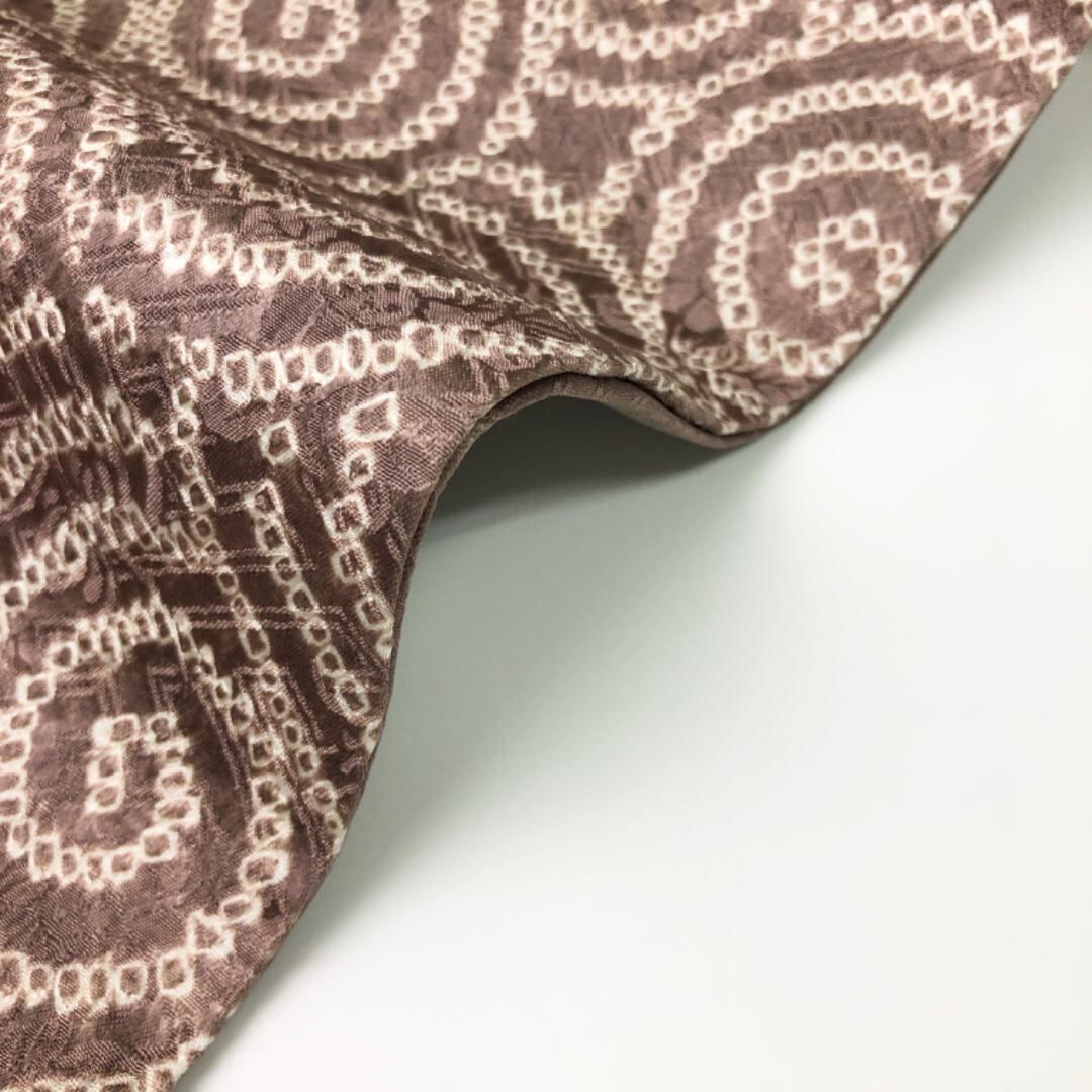 鼠色ベースのお色味、渦巻き模様の絞りの柄裄がデザインされた素敵なお品でございます。