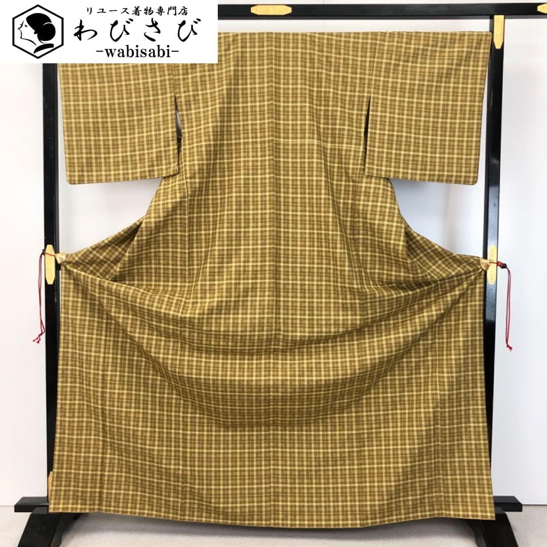 紬着物 花織 格子柄 黄橡色 トールサイズ ガード加工 K-4749 着物 きもの kimono 和服 和装 中古 リサイクル着物 【送料無料】