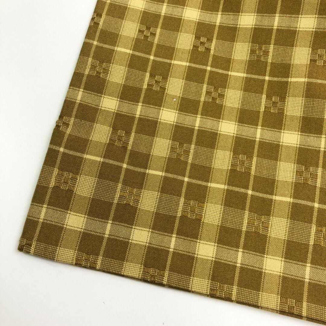 黄橡色の落ち着きのあるお色味に格子柄、雰囲気の良い花織がデザインされた素敵な柄裄のお品でございます。