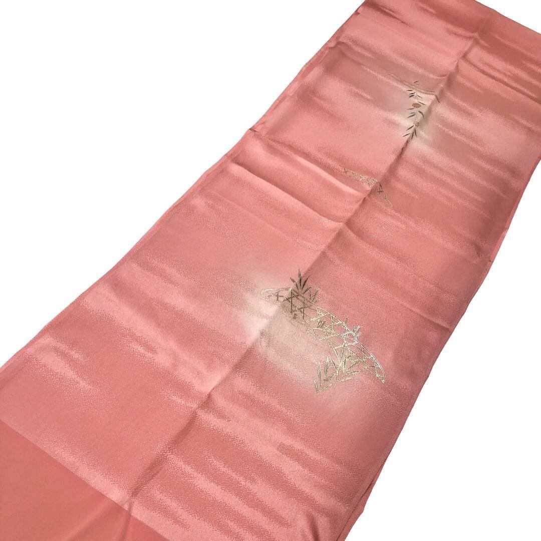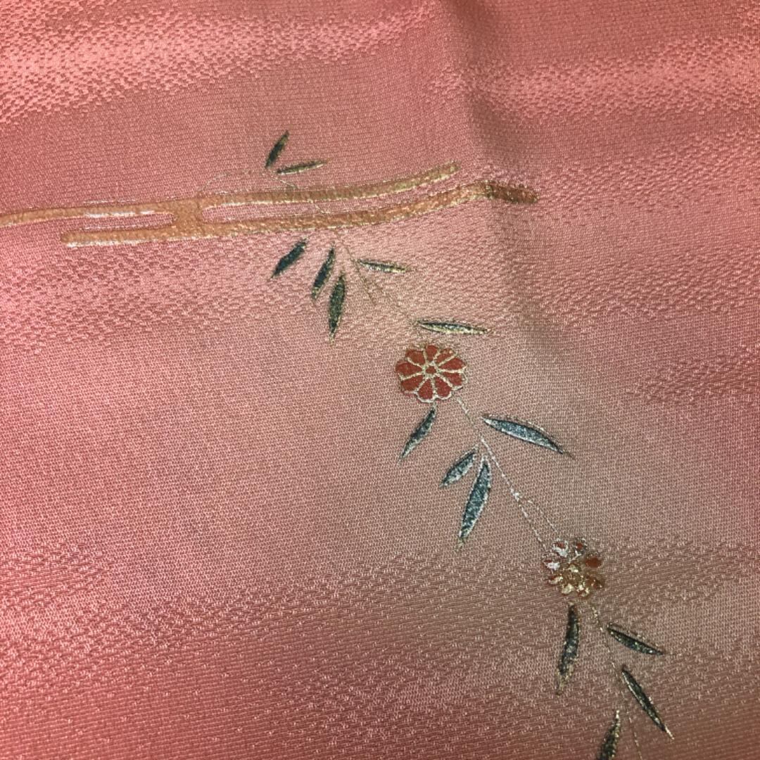 薄紅色のお色味に流水に草花の柄裄がデザインされた素敵なお品でございます。