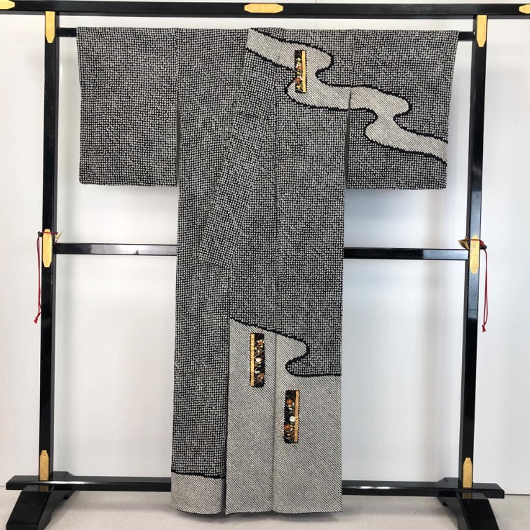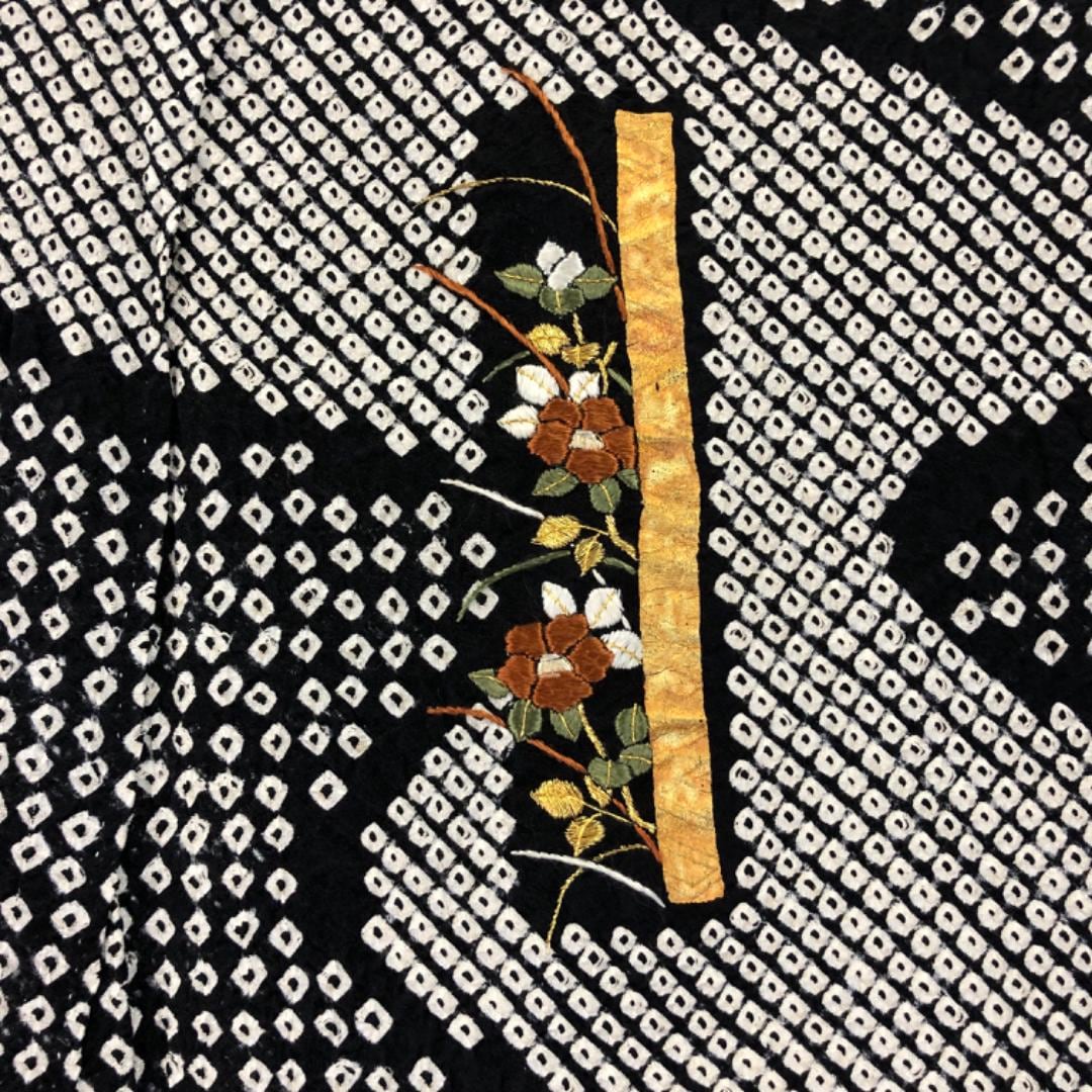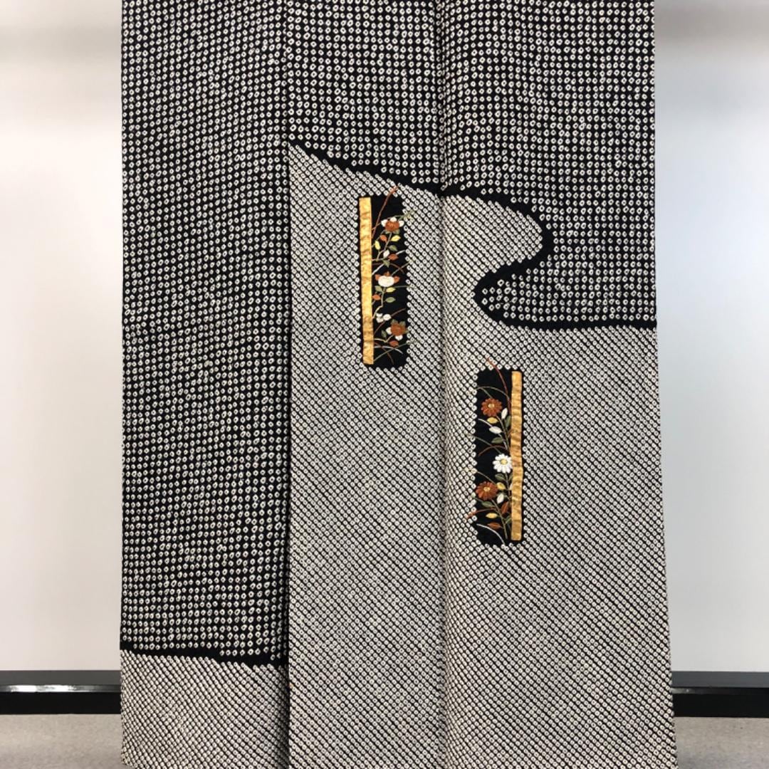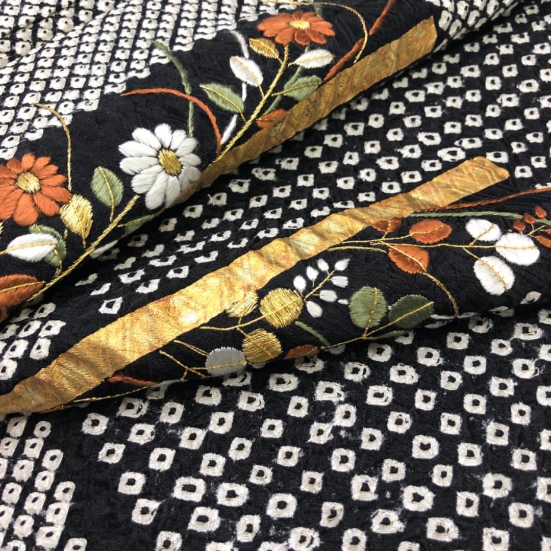 黒色のモノトーンベースのお色味、霞模様に刺繍、金彩が使われた四角に花模様の柄裄がデザインされた素敵なお品でございます。
