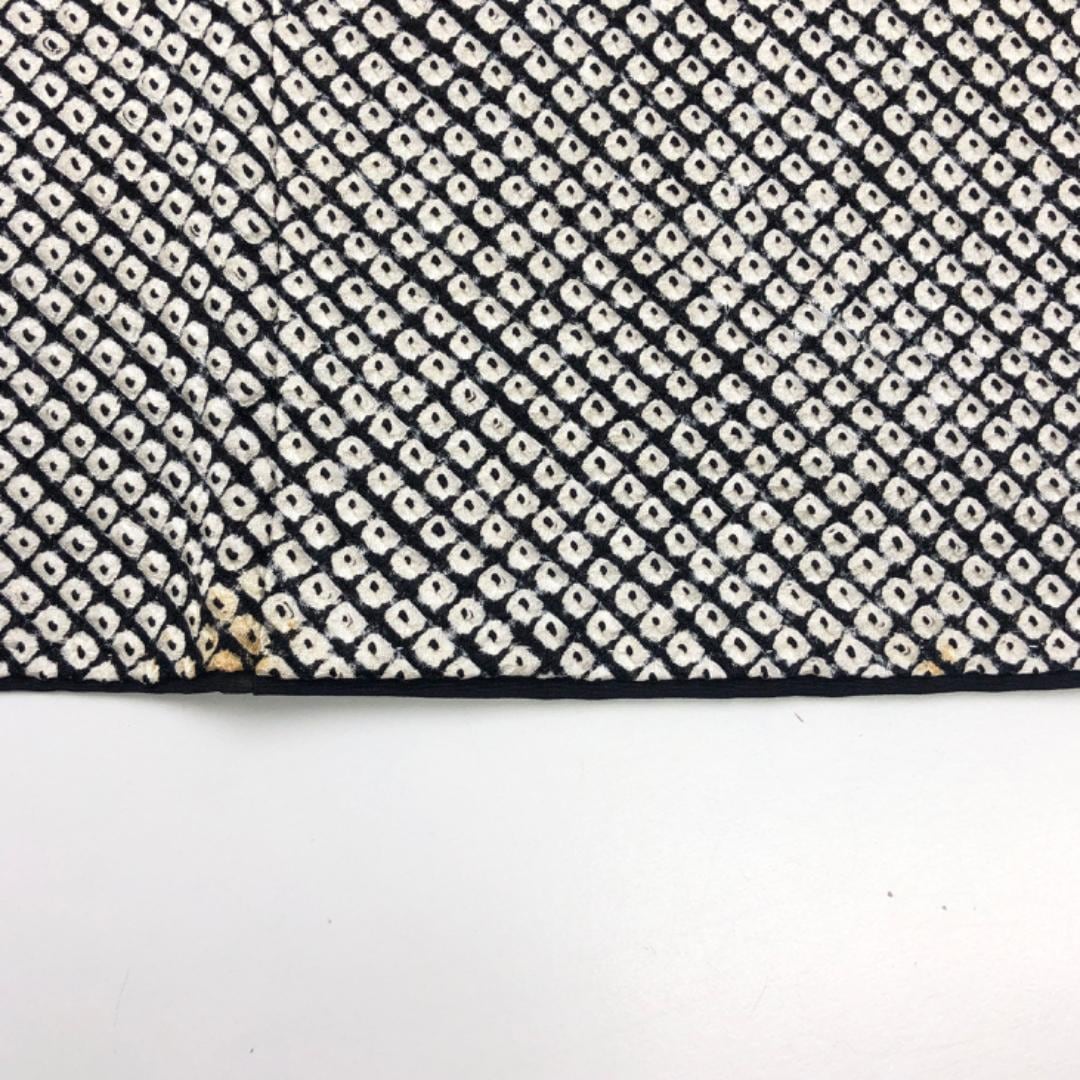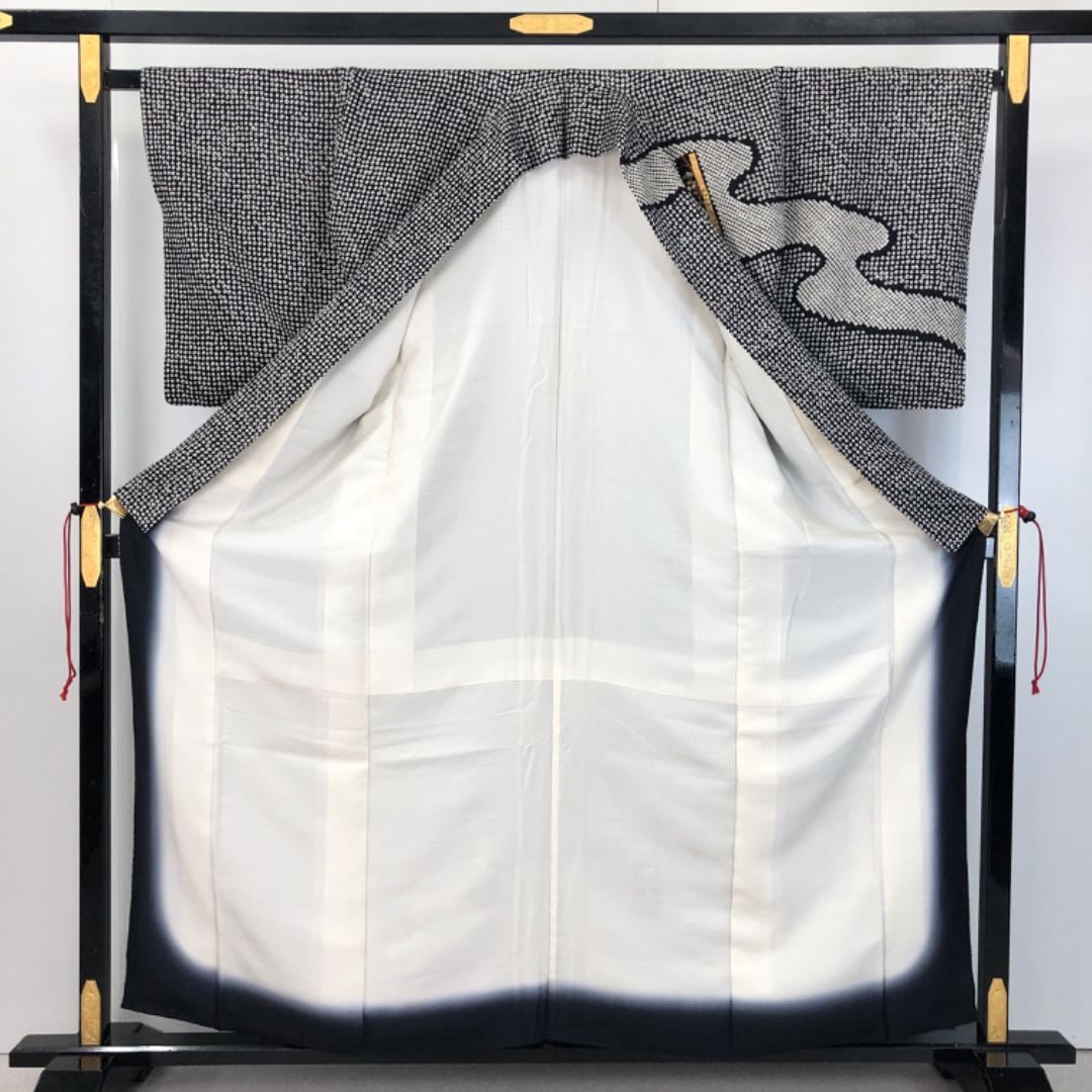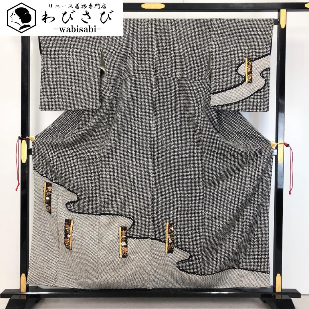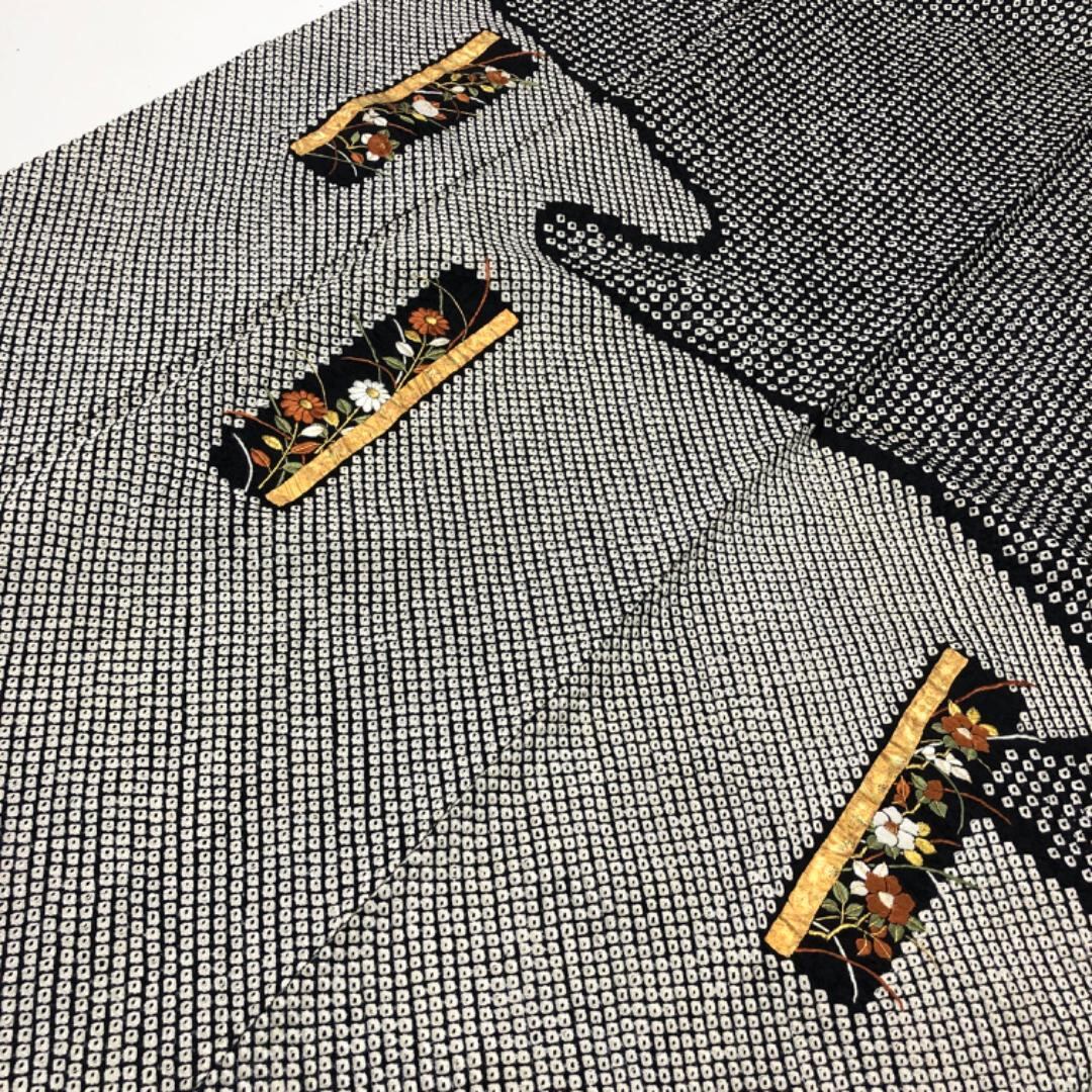 黒色のモノトーンベースのお色味、霞模様に刺繍、金彩が使われた四角に花模様の柄裄がデザインされた素敵なお品でございます。