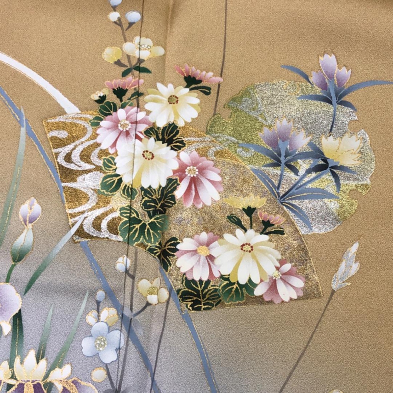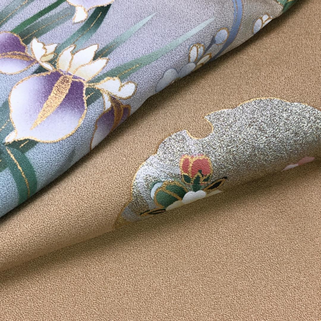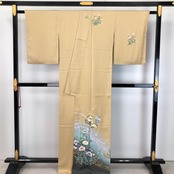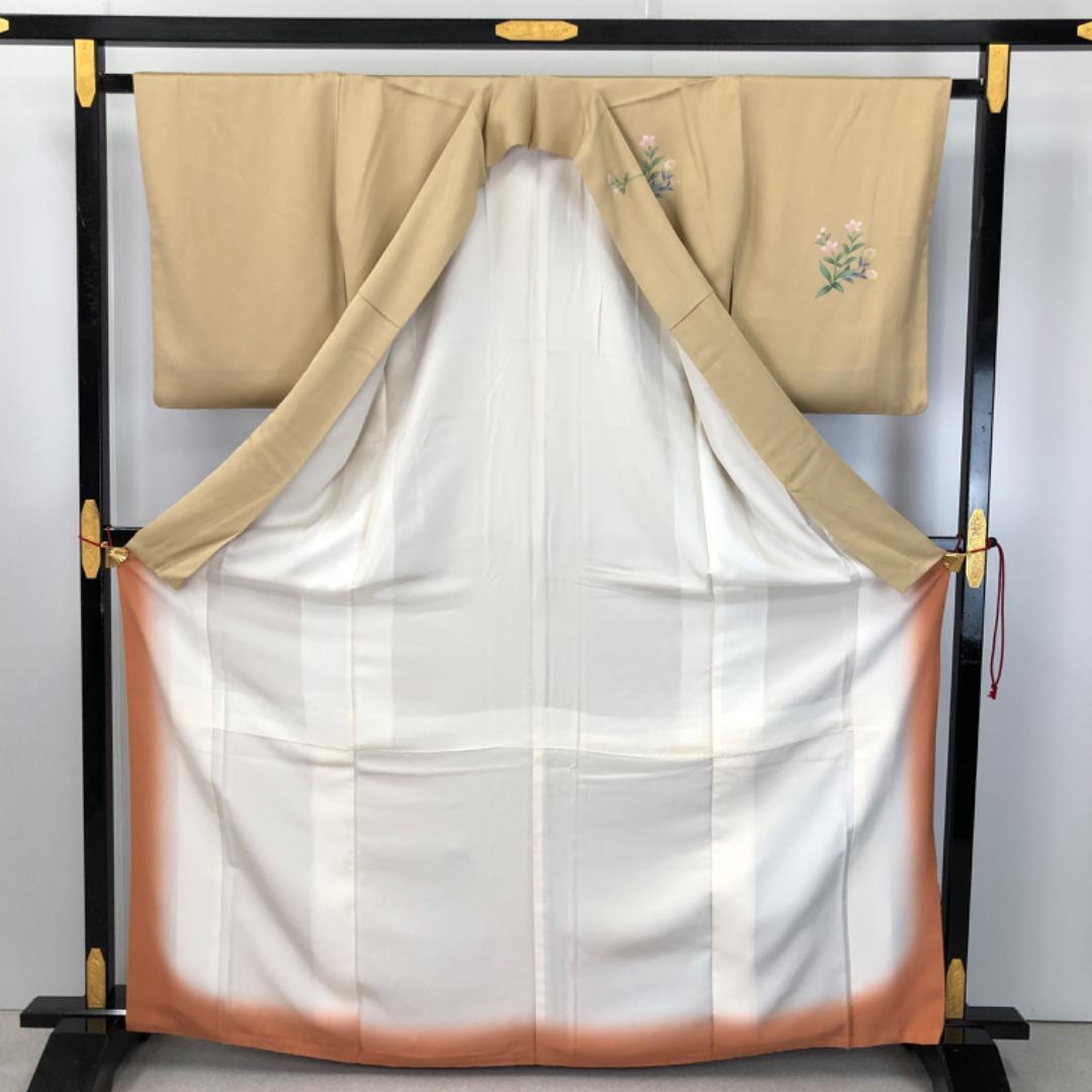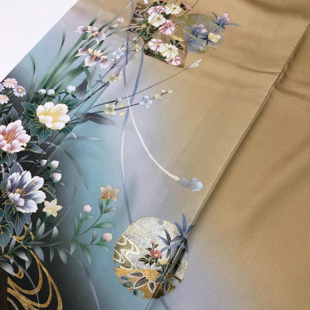 麦藁色のお色味に雰囲気期の良い暈し、美しい花模様、雪輪、地紙などの上品な柄裄がデザインされた素敵なお品でございます。