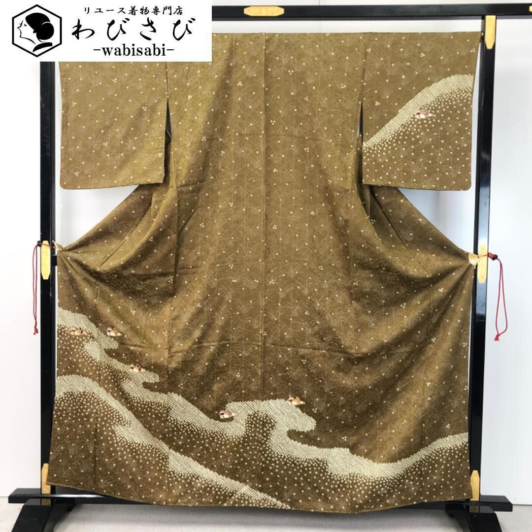 路考茶色の落ち着きのあるお色味に絞り柄の波模様、刺繍の鴛鴦がデザインされた素敵な柄裄のお品でございます。