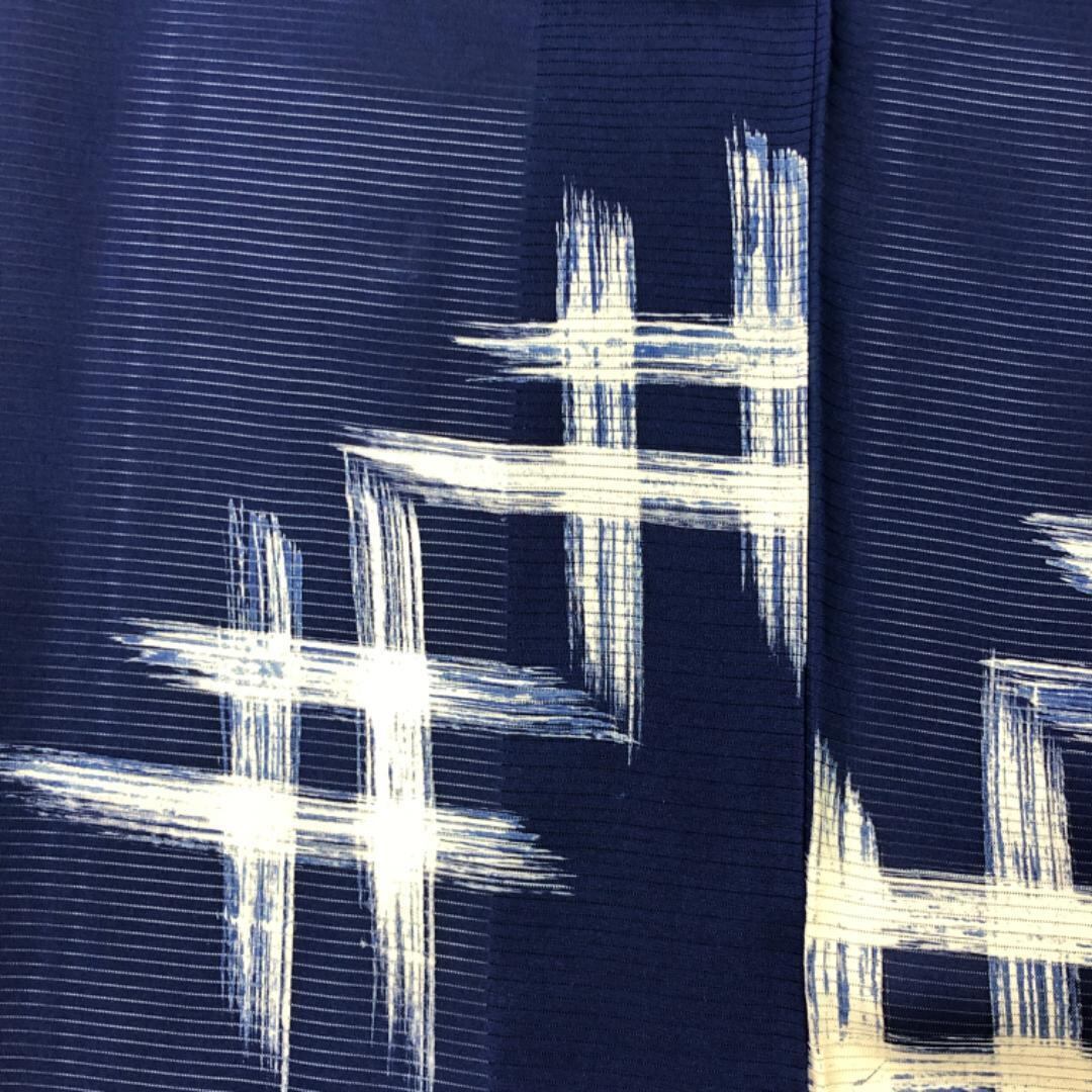濃桔梗色のお色味に井桁模様の柄裄がデザインされた素敵なお品でございます。
