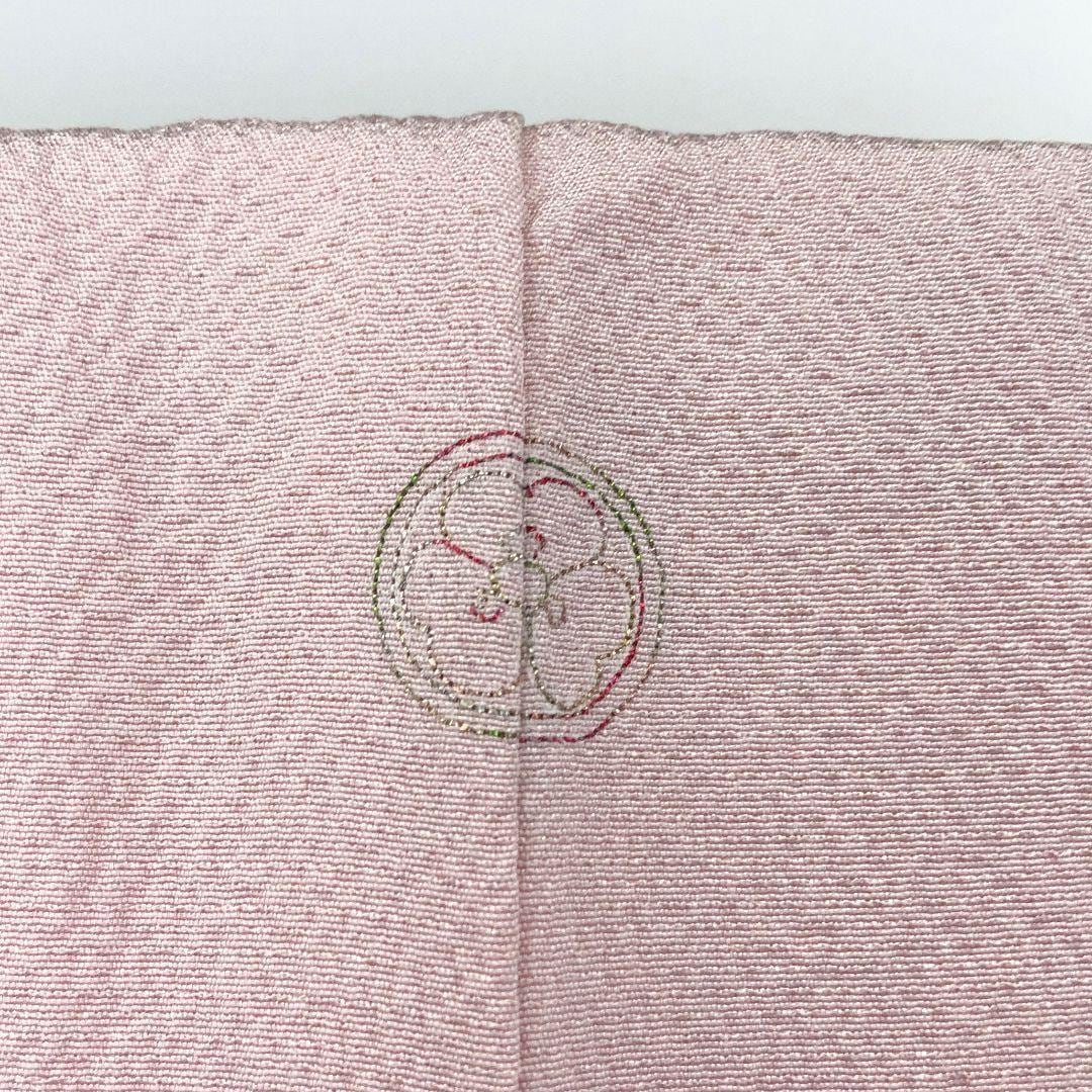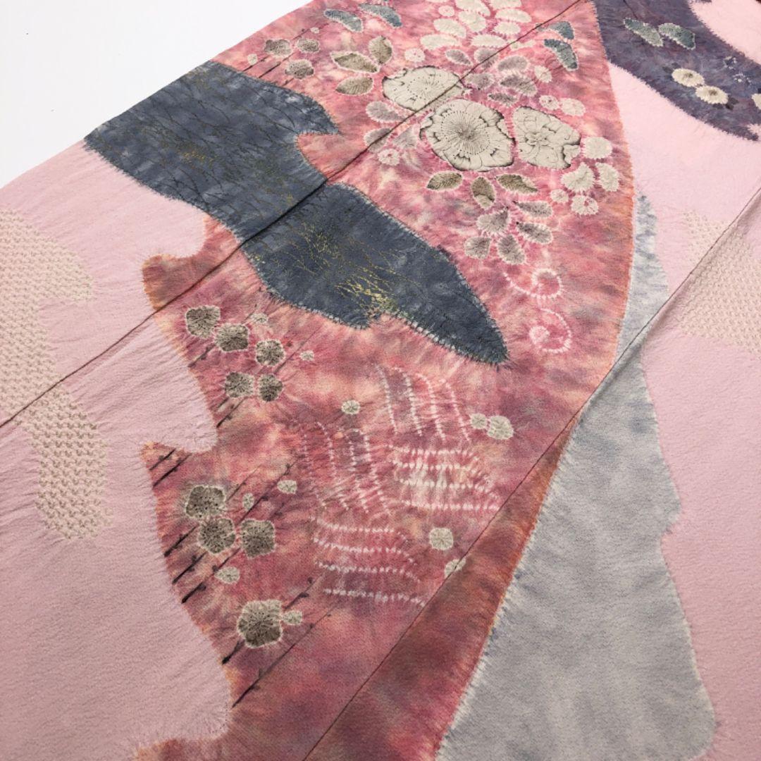 浅紅色のお色味の縮緬地、色彩の美しい霞模様に美しい辻が花絞りの柄裄がデザインされた素敵なお品でございます。