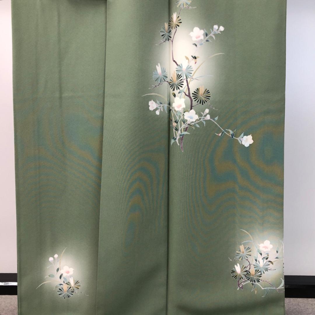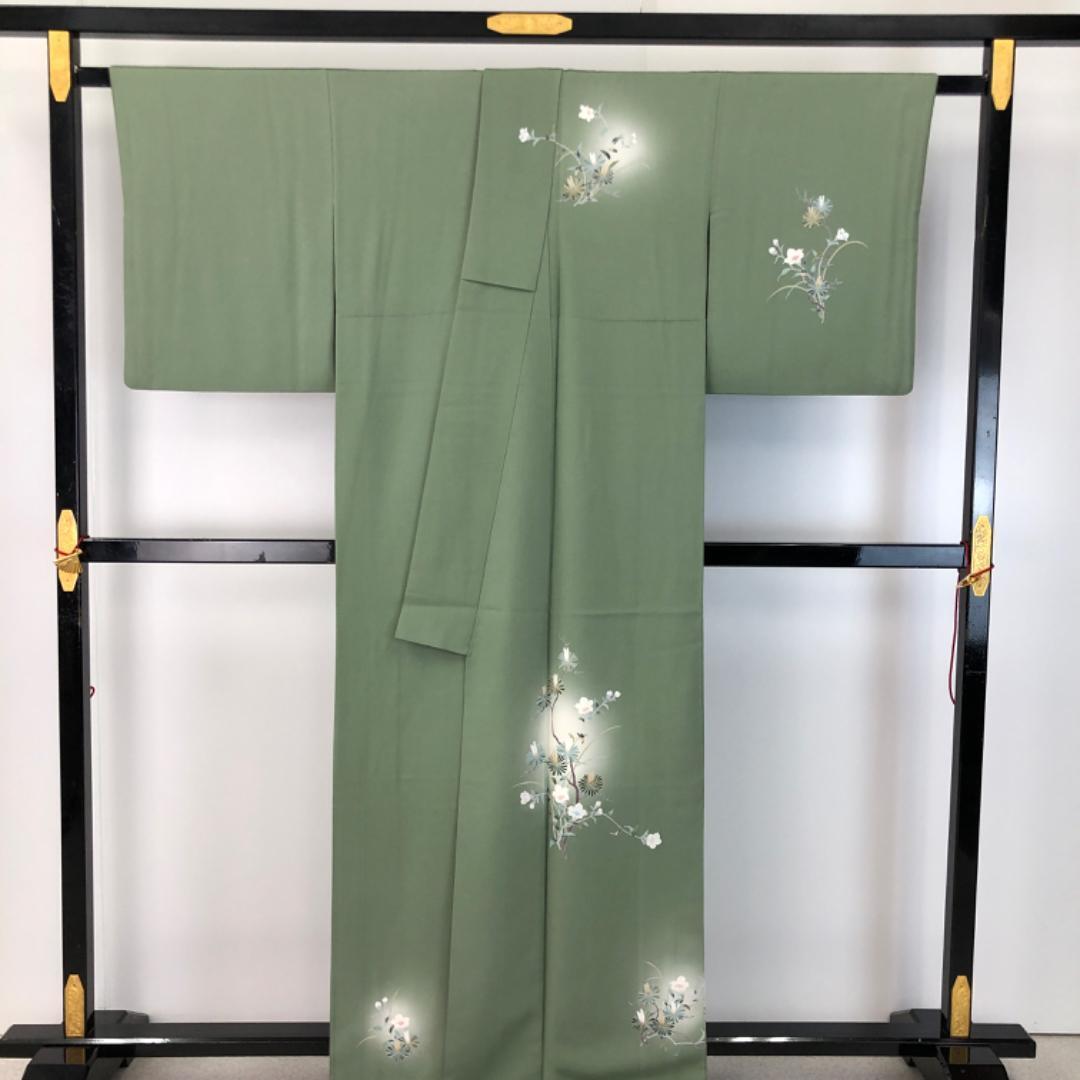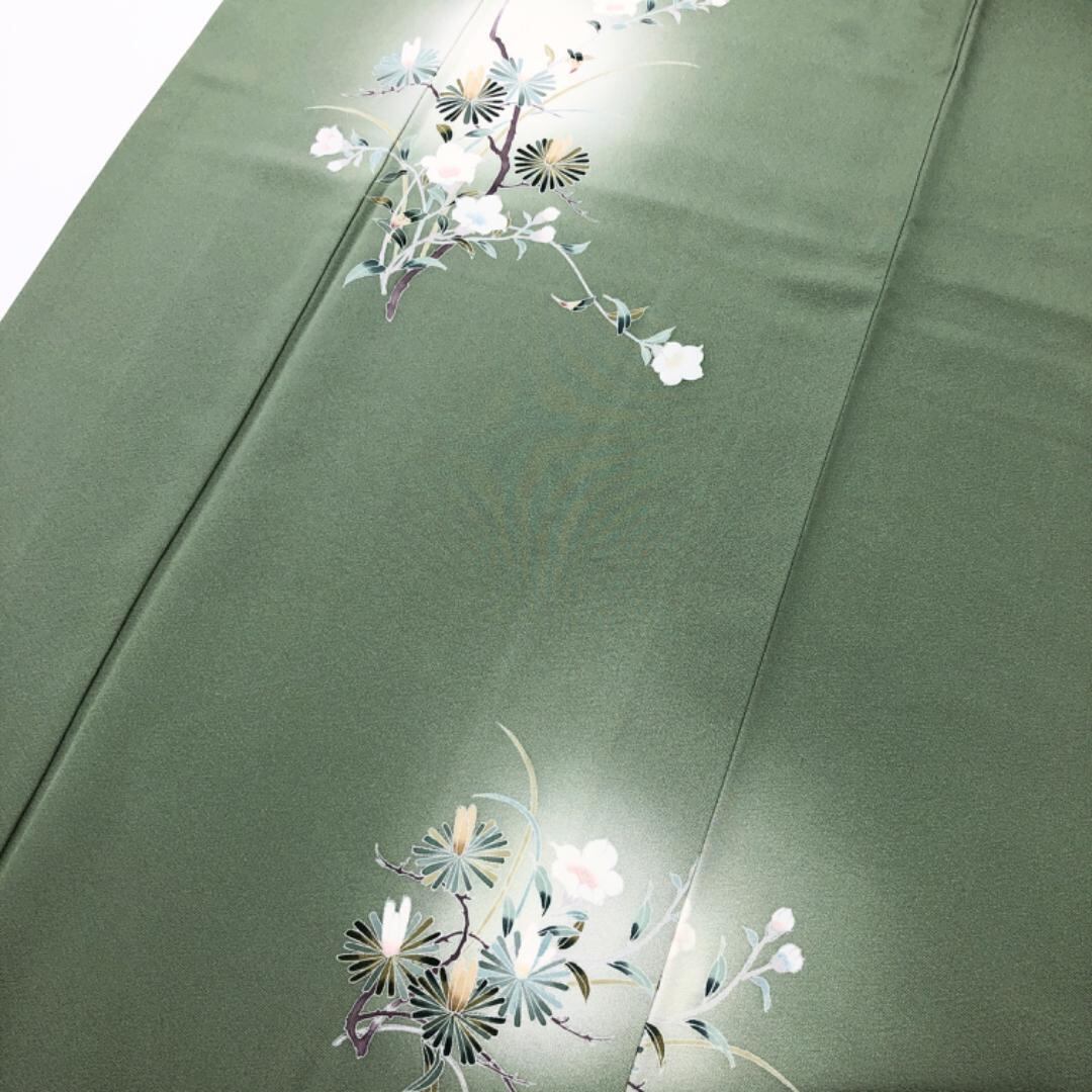 山鳩色のお色味、暈しに上品な花模様の柄裄がデザインされた素敵な友禅のお品でございます。