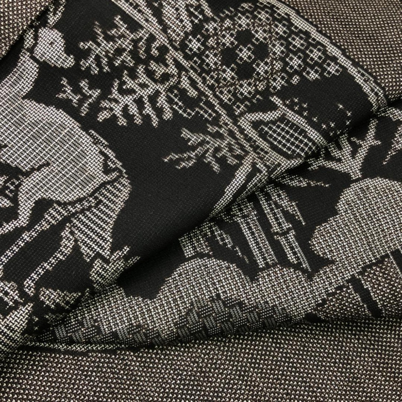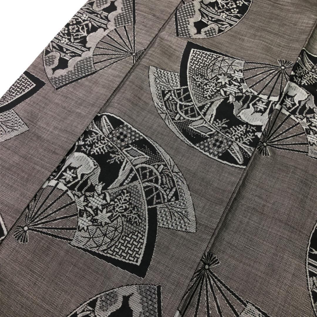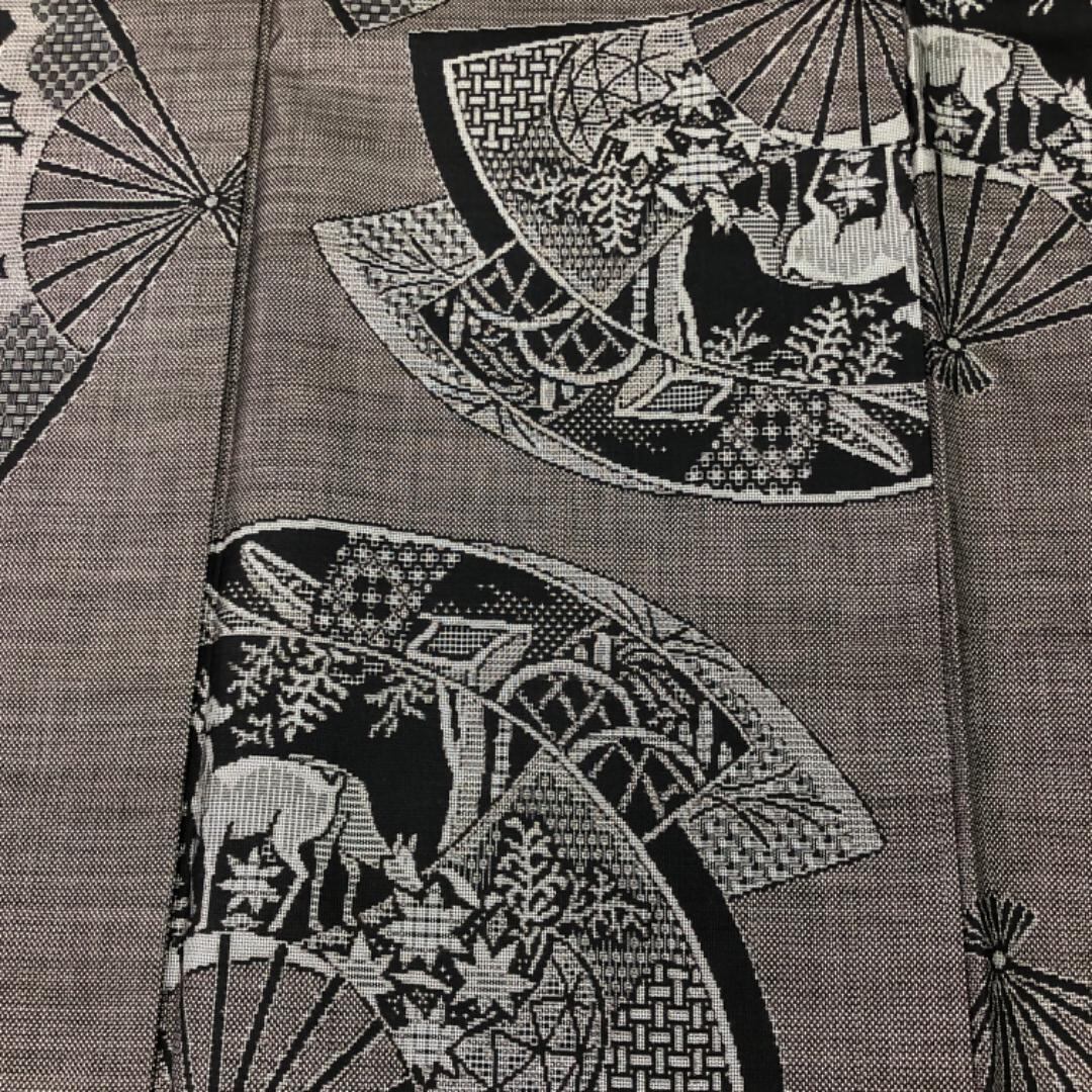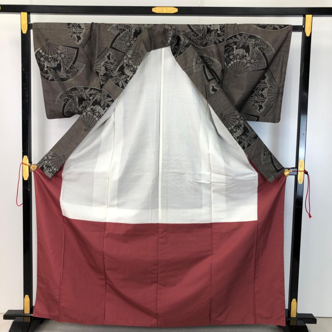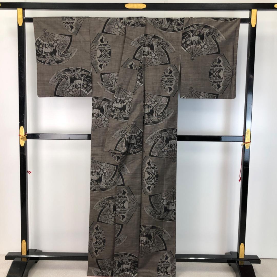 茶泥染の雰囲気の良いお色味に扇子に風景画、花柄、鹿などの柄裄がデザインされた雰囲気の良い素敵なお品でございます。
