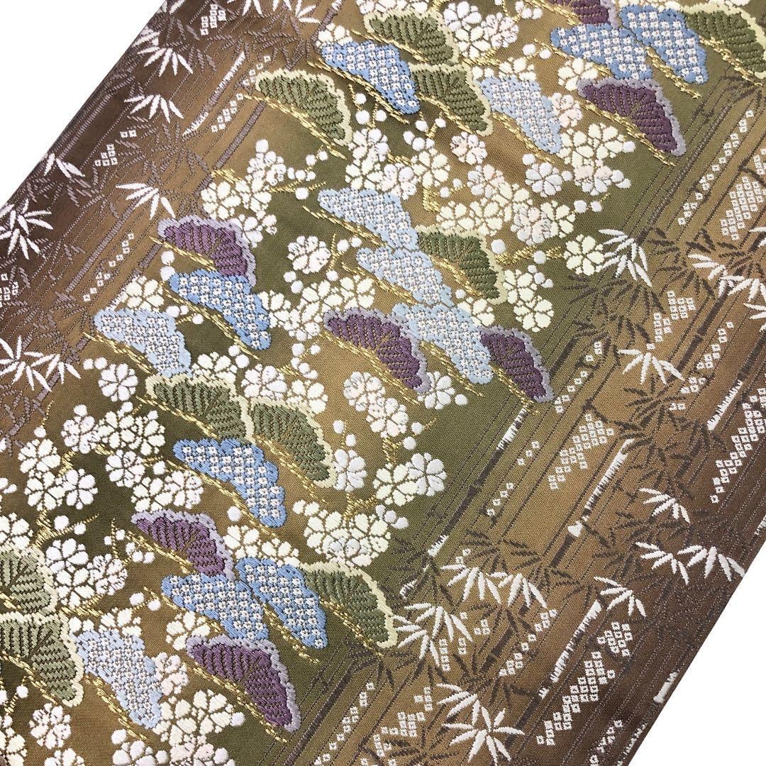 袋帯 麗粋唐織 松に竹 花模様 黄唐茶色 O-5067 着物 きもの kimono 和服 和装 中古 リサイクル着物 【送料無料】