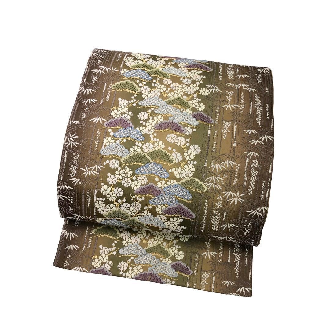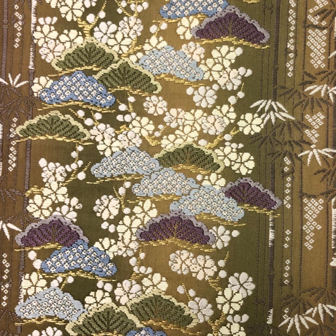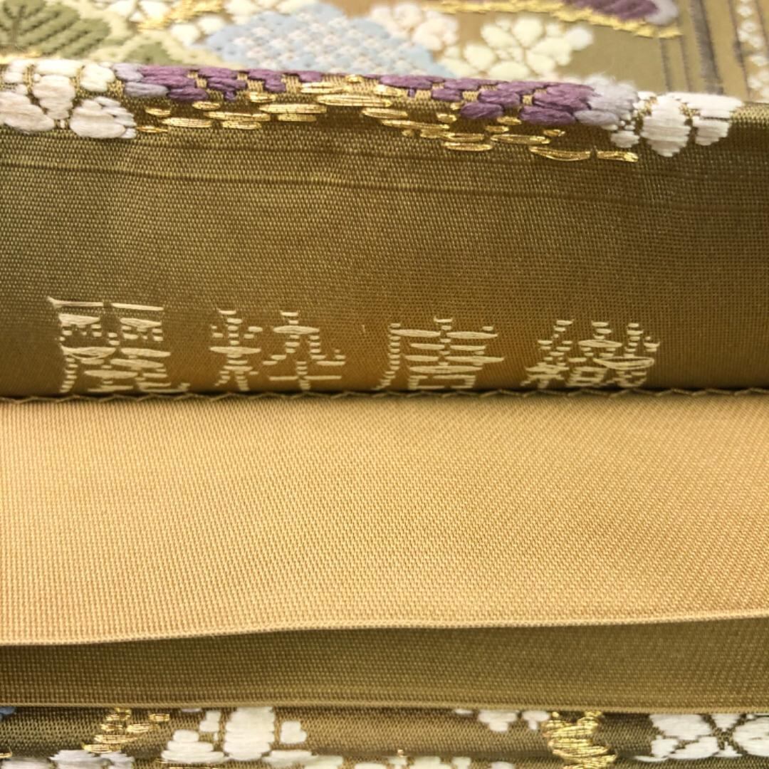 黄唐茶色ベースのお色味にグラデーション、唐織の美しい松模様がデザインされた素敵なお品でございます。