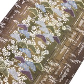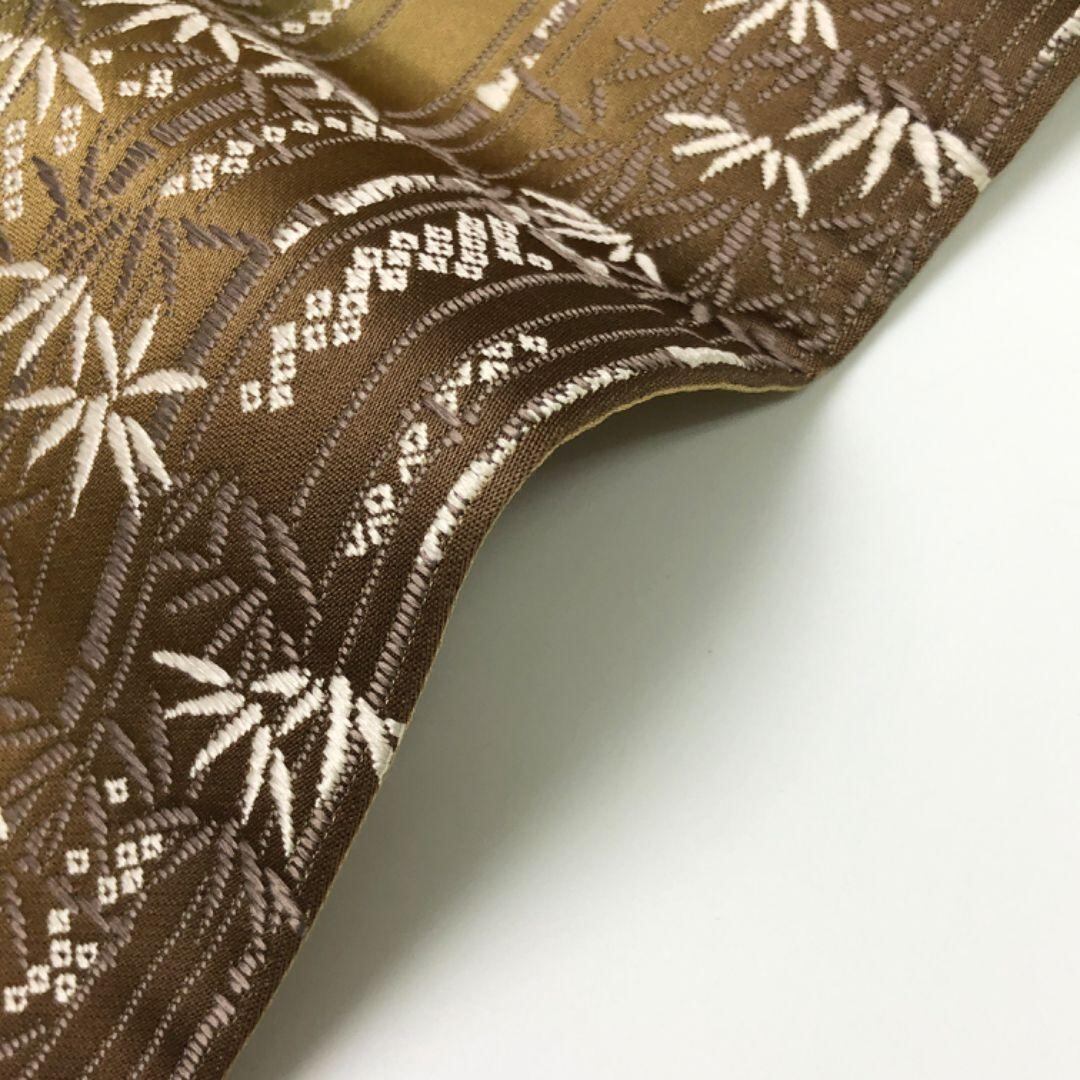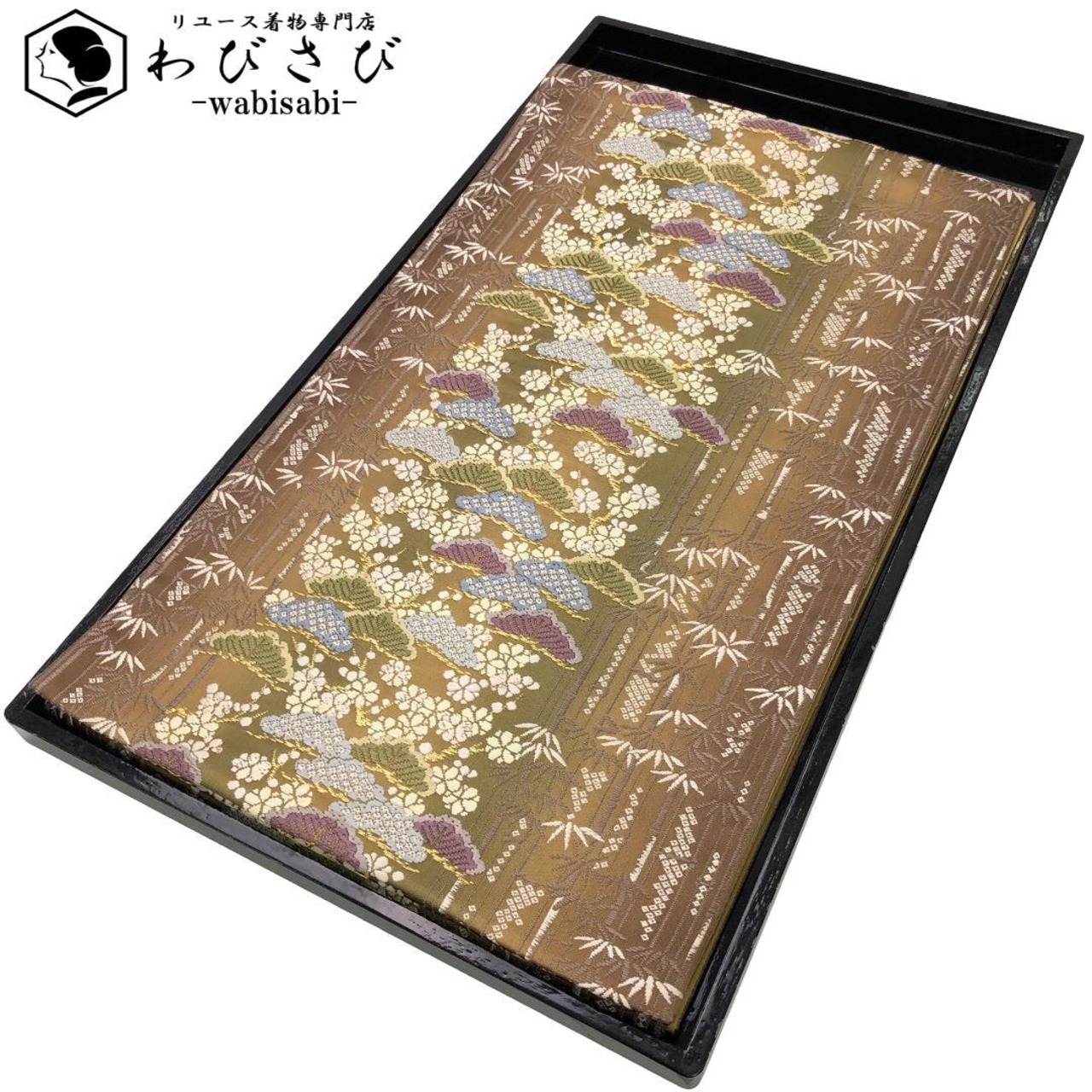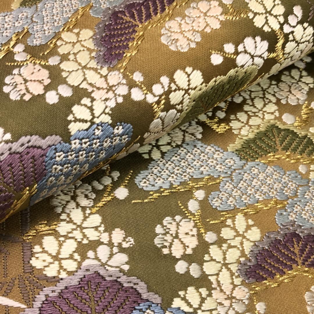 黄唐茶色ベースのお色味にグラデーション、唐織の美しい松模様がデザインされた素敵なお品でございます。