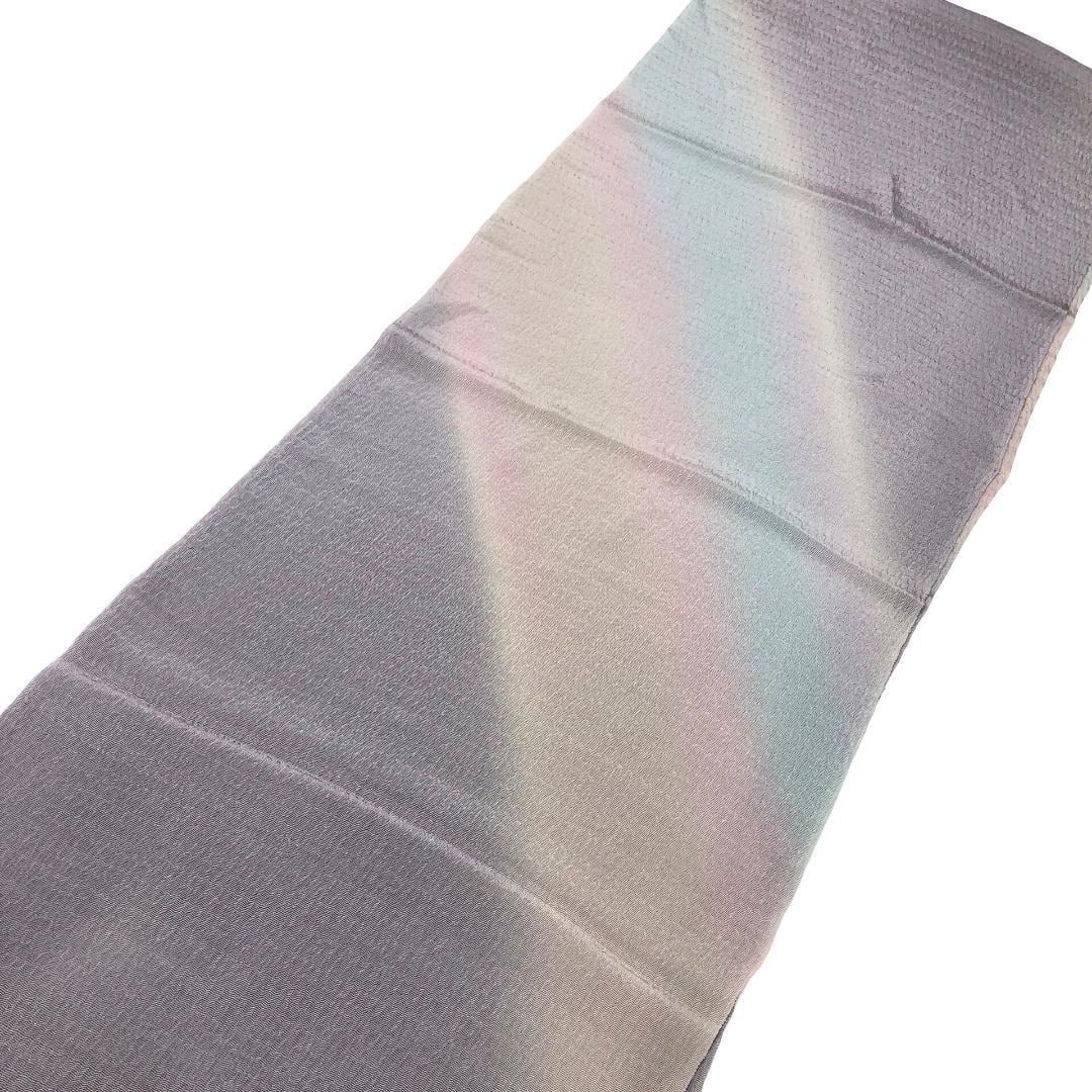 紫鼠色ベースの暈しのお色味に斜線模様がデザインされた素敵な縮緬のお品でございます。