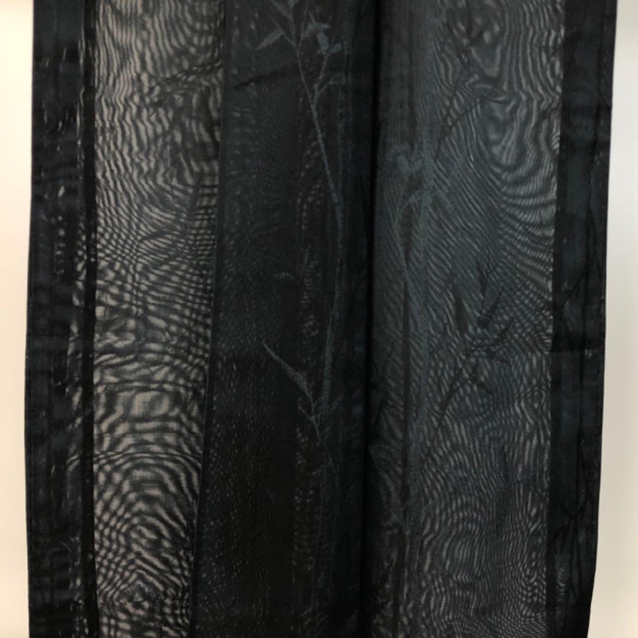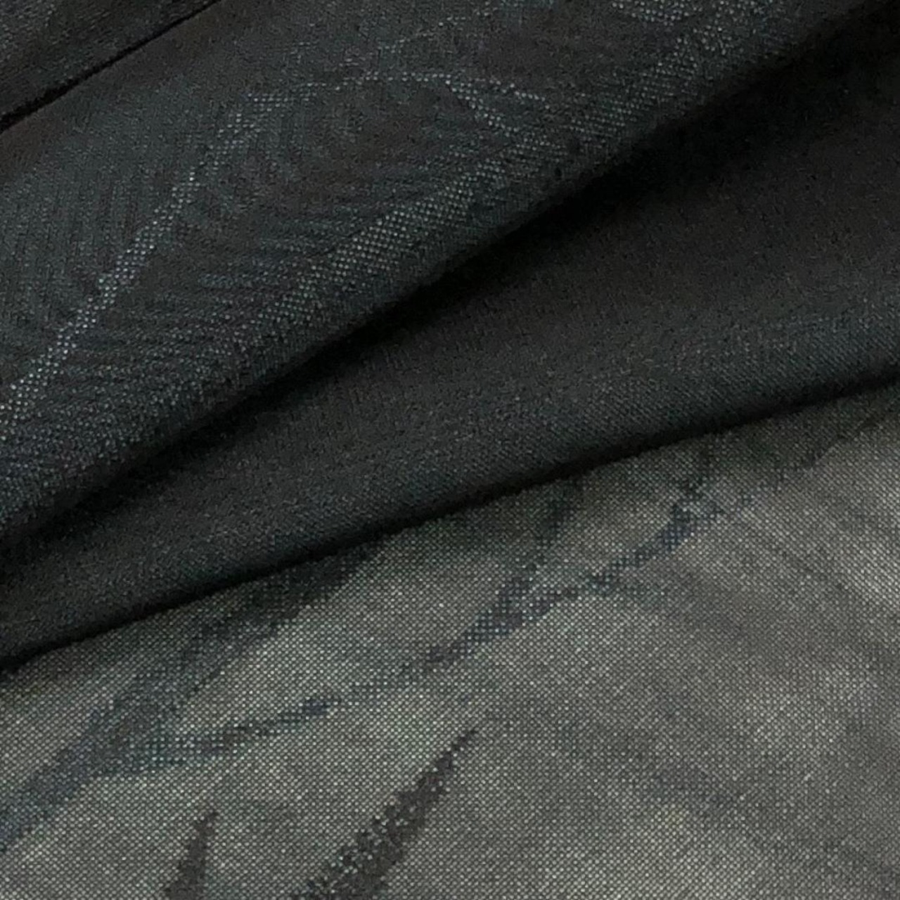 表は黒色、裏は青味のお色味の重なって織られた透け感のある生地から浮かび上がる枝葉模様がデザインされた涼しげで素敵な柄裄のお品でございます。