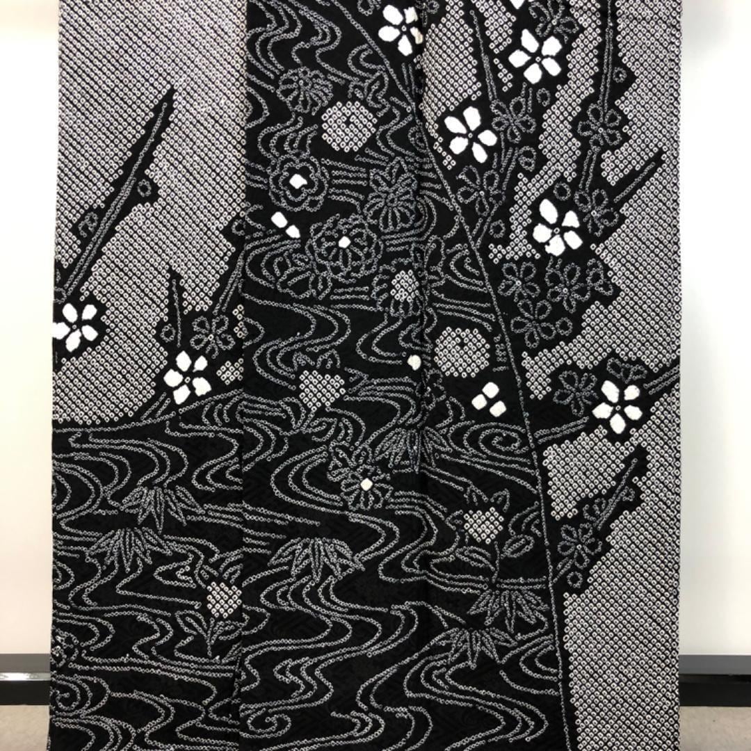 黒色ベースのモノトーンのお色味、流水に花模様の柄裄がデザインされた雰囲気の良い素敵なお品でございます。
