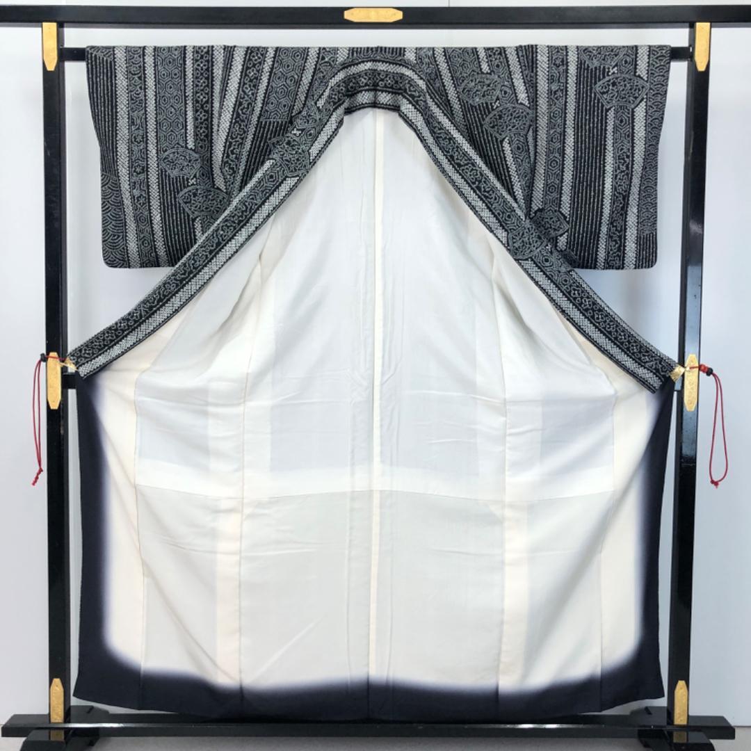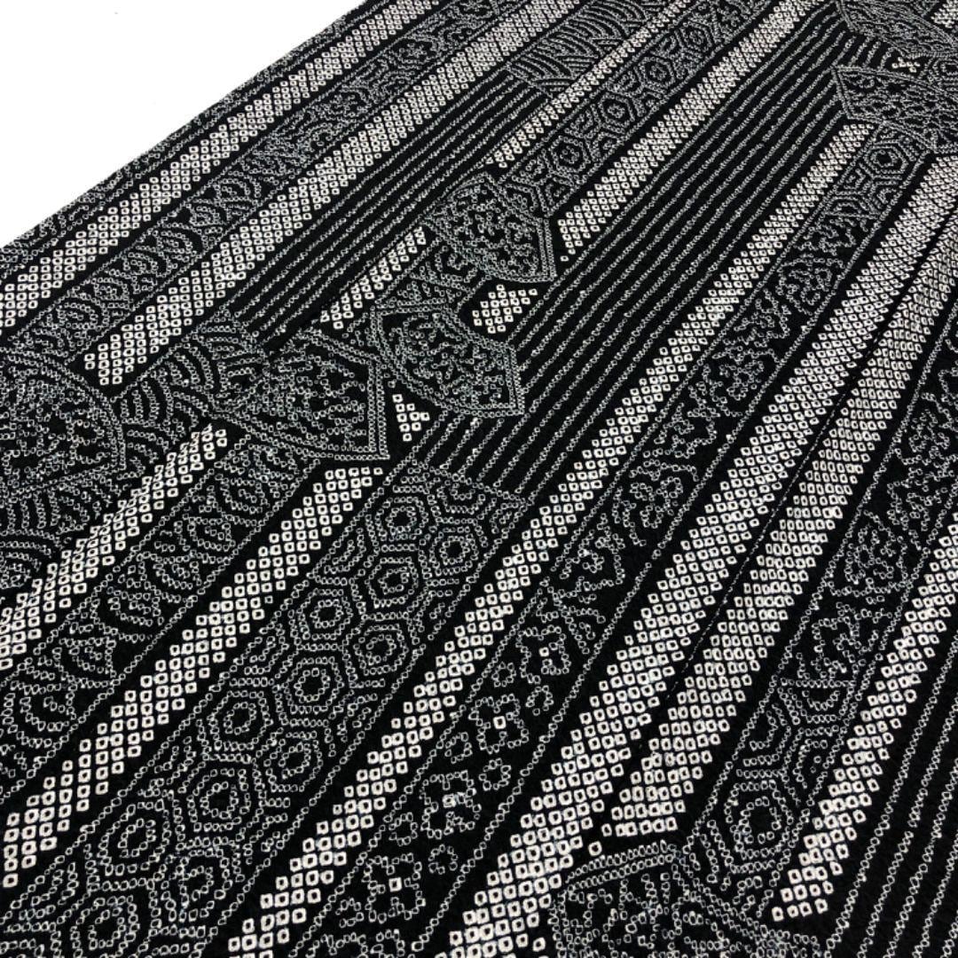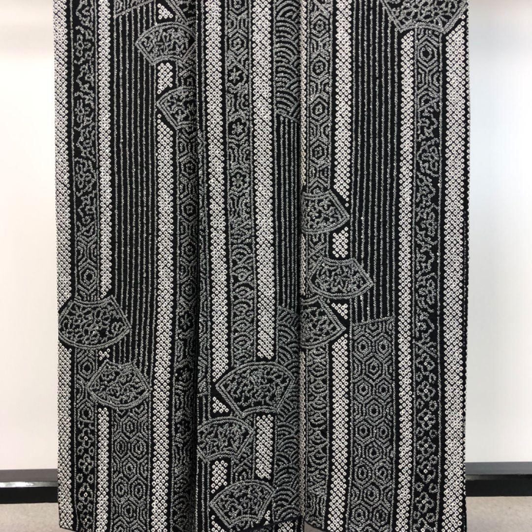 黒色ベースのモノトーンのお色味、縦縞模様に多様な柄行、地紙などがデザインされた絞りのモダンな雰囲気の素敵なお品でございます。