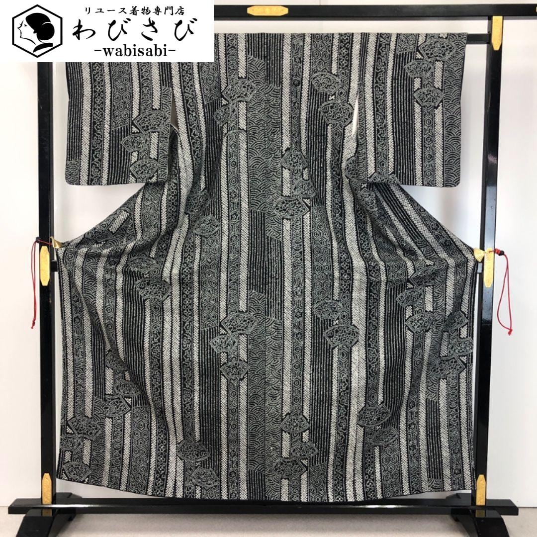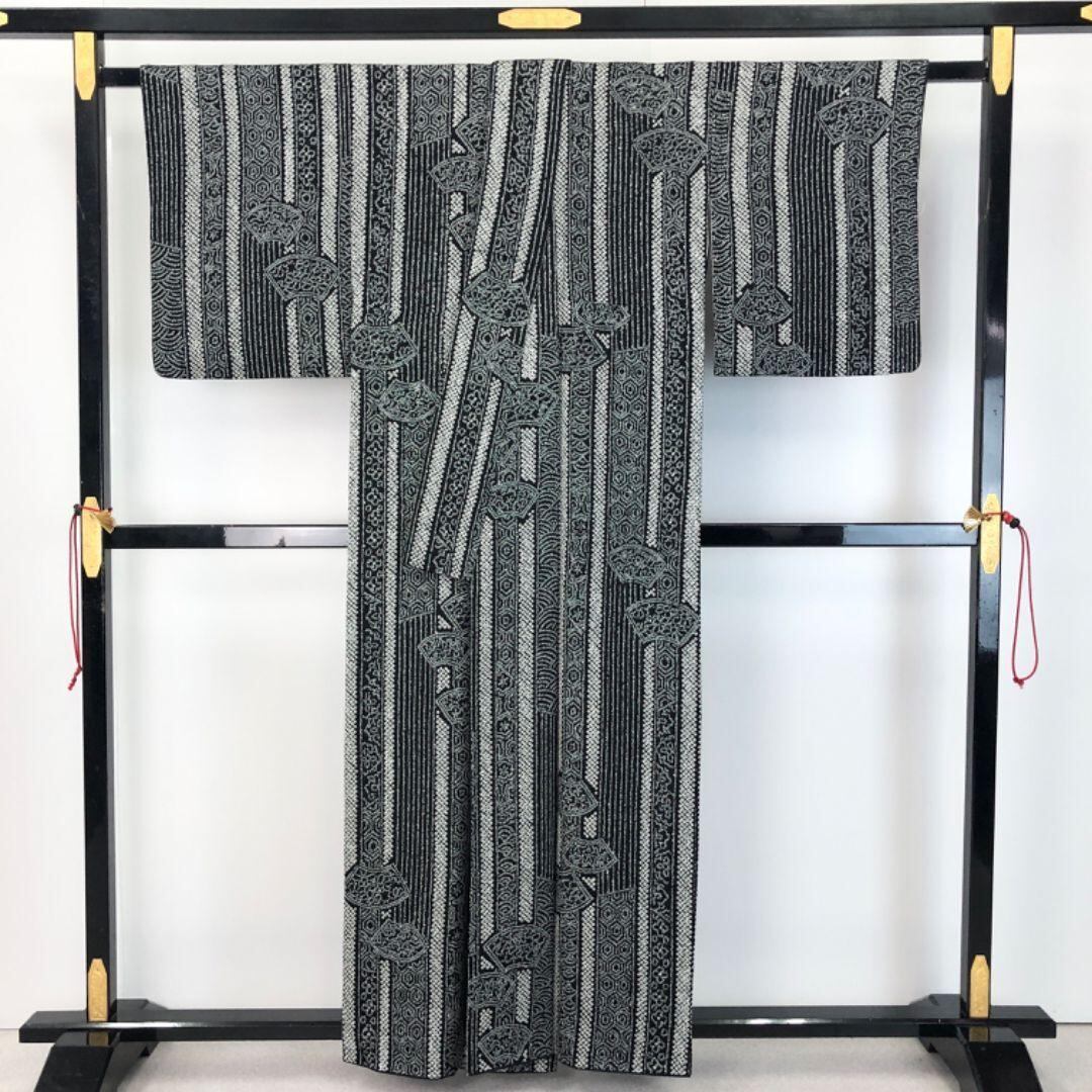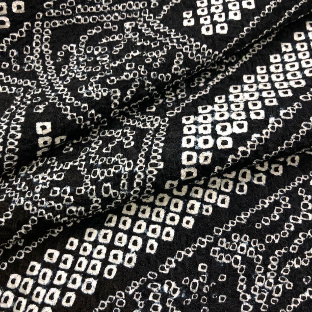 黒色ベースのモノトーンのお色味、縦縞模様に多様な柄行、地紙などがデザインされた絞りのモダンな雰囲気の素敵なお品でございます。