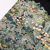 萩、桜、松などの花草模様の風景柄がデザインされた色彩の鮮やかな友禅の素敵なお品でございます。